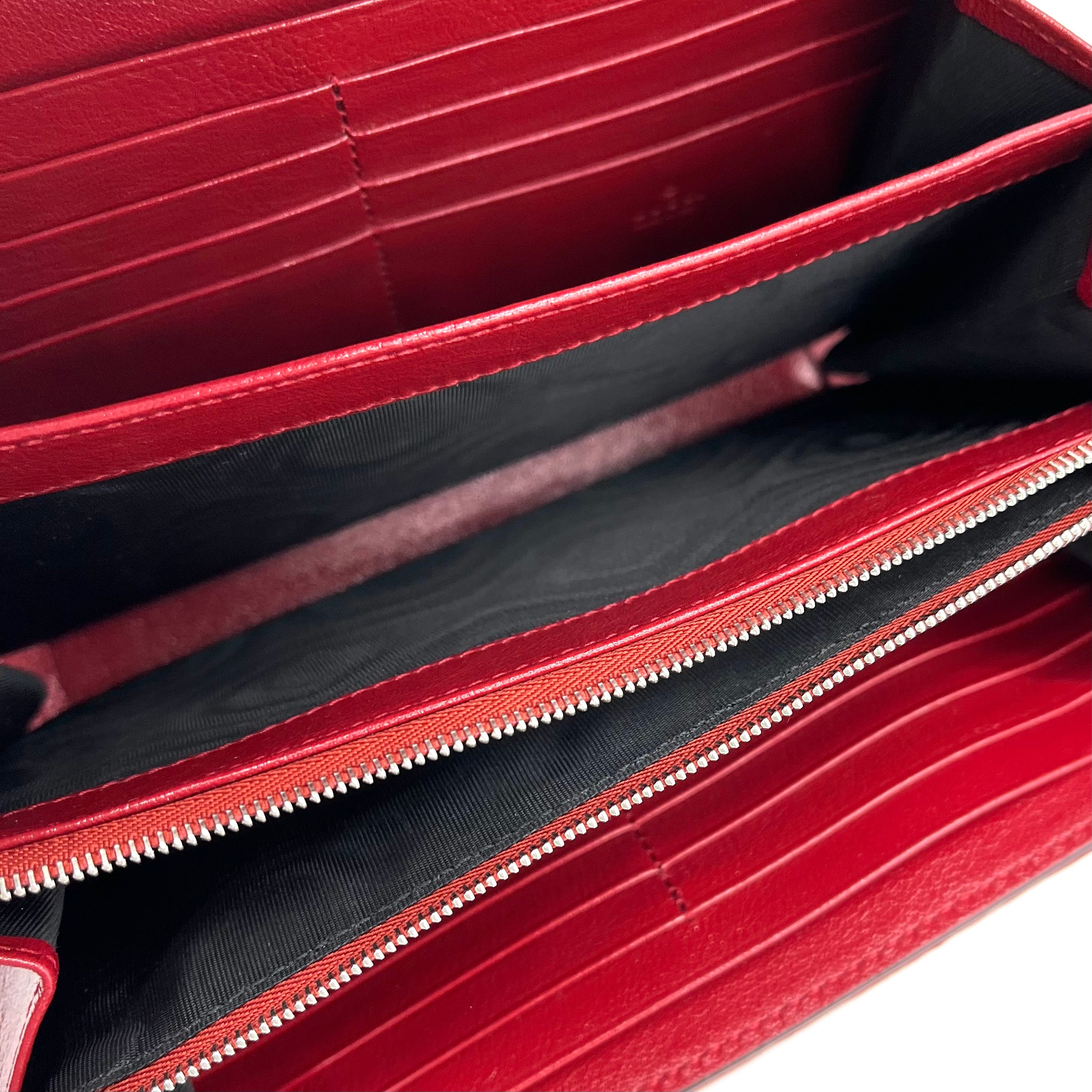 This is an authentic GUCCI Tweed GG Monogram Mini Dionysus Chain Wallet in White, Black, and Romantic Cherry. This stylish bag is crafted of Gucci monogrammed tweed fabric in black and white. This bag features red leather trim, an optional silver chain shoulder strap, and a textured horseshoe closure with tiger head spurs. This opens to a partitioned red leather interior with card slot panels, patch pockets, and a zipper compartment.