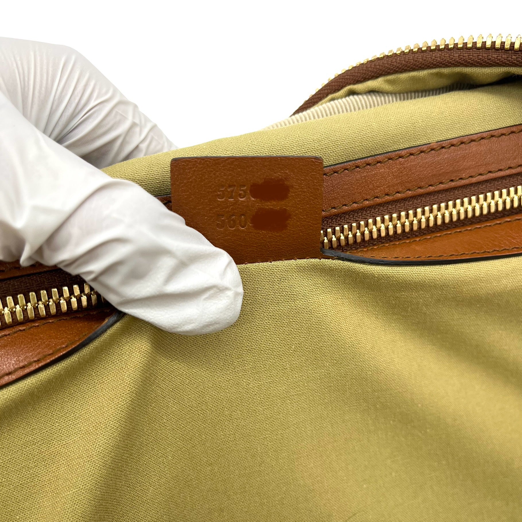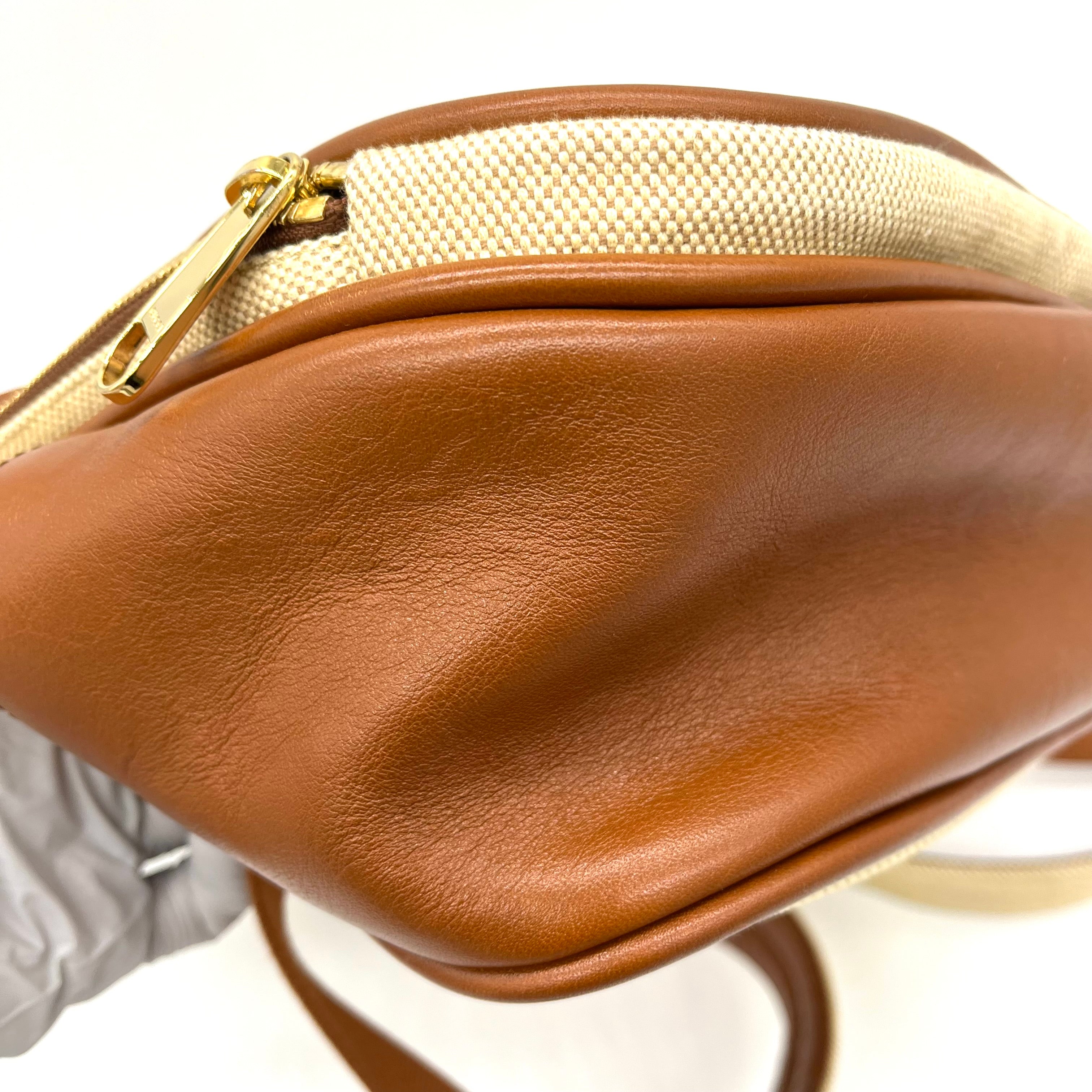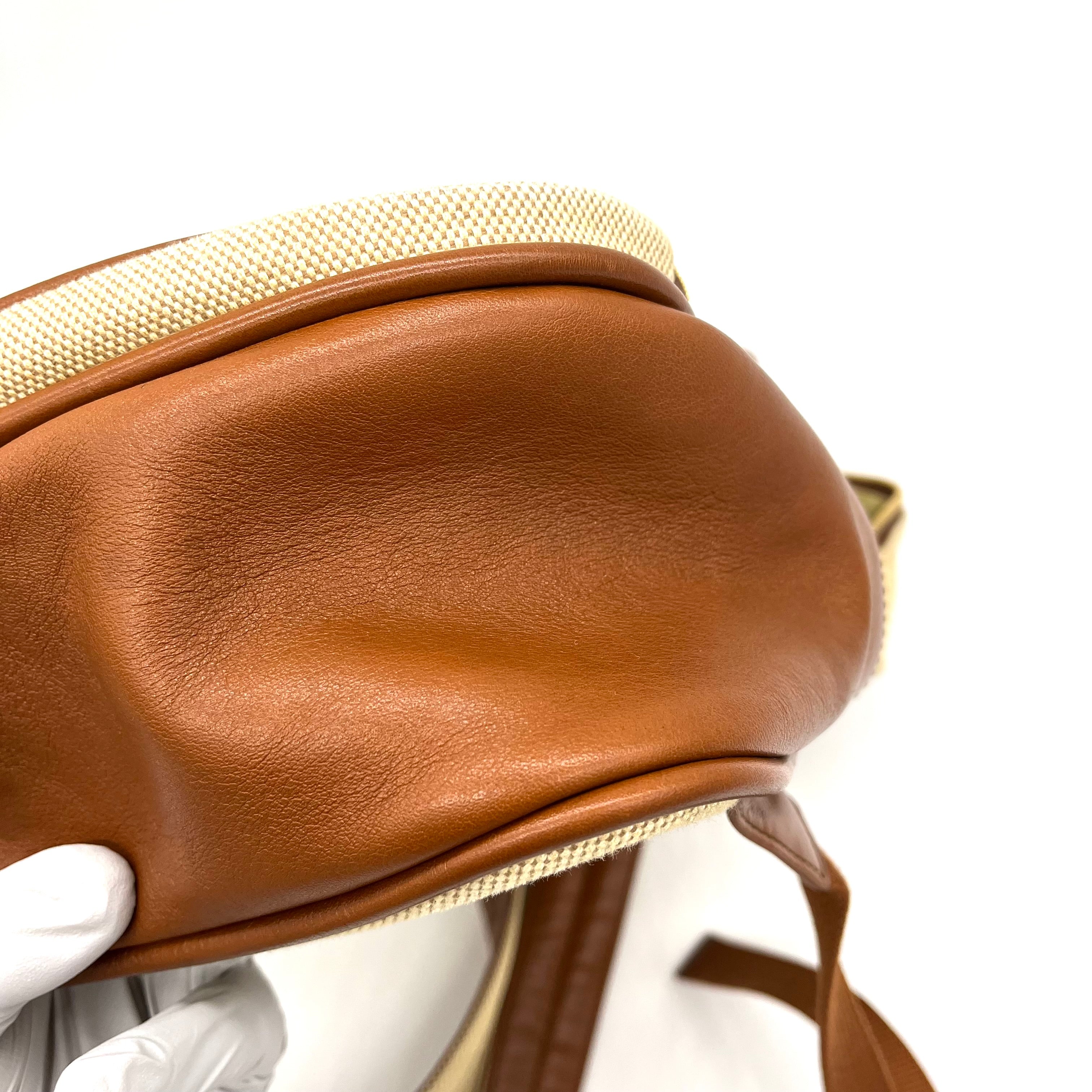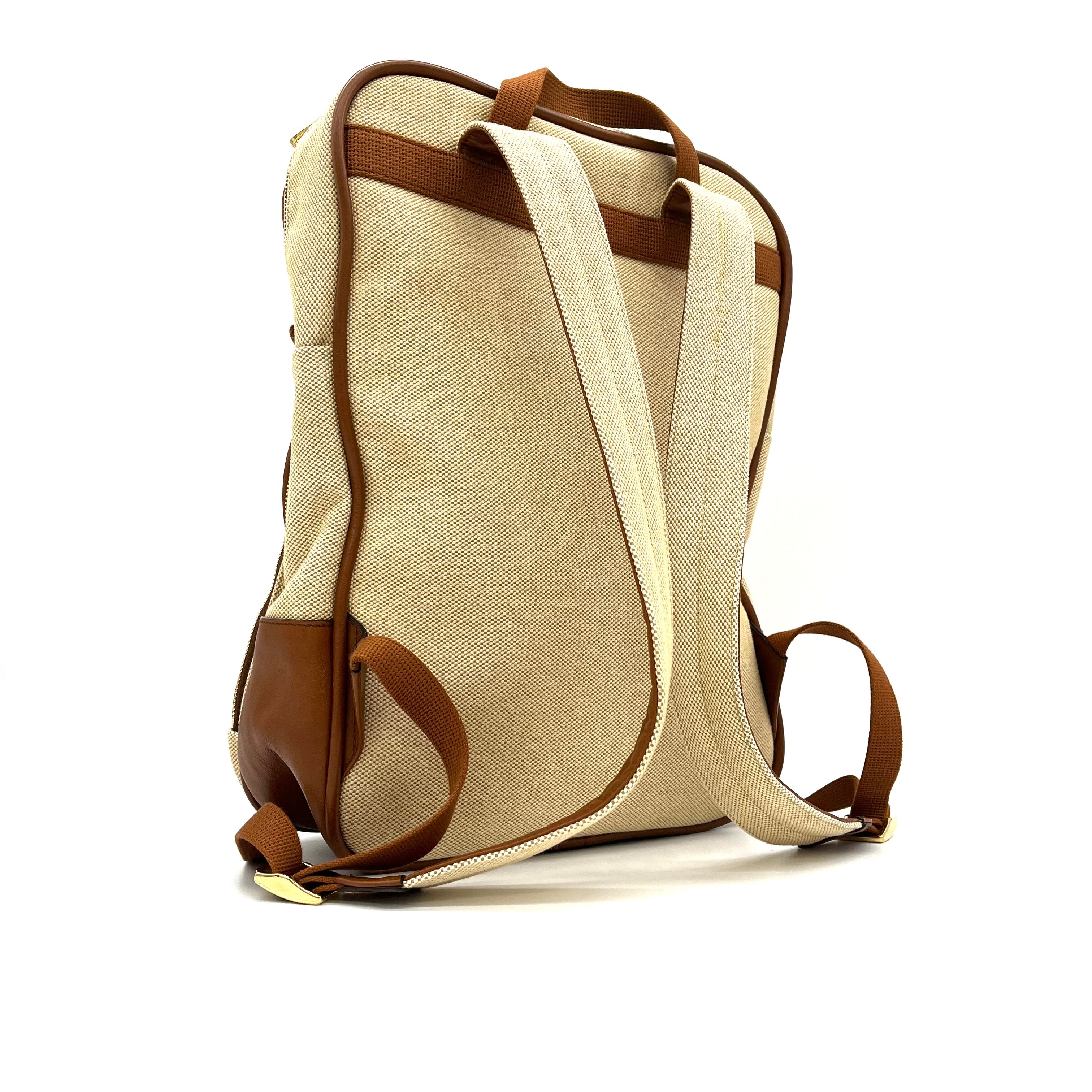 This is an authentic GUCCI Vintage Canvas Calfskin Web Backpack in Sand and Light Cuir. This stylish backpack is finely crafted beige canvas with brown leather trim. It features a small gold GG logo on the front, red and green web striping, and a front zipper pocket. The top zipper opens to a light green fabric interior with a zipper pocket.
