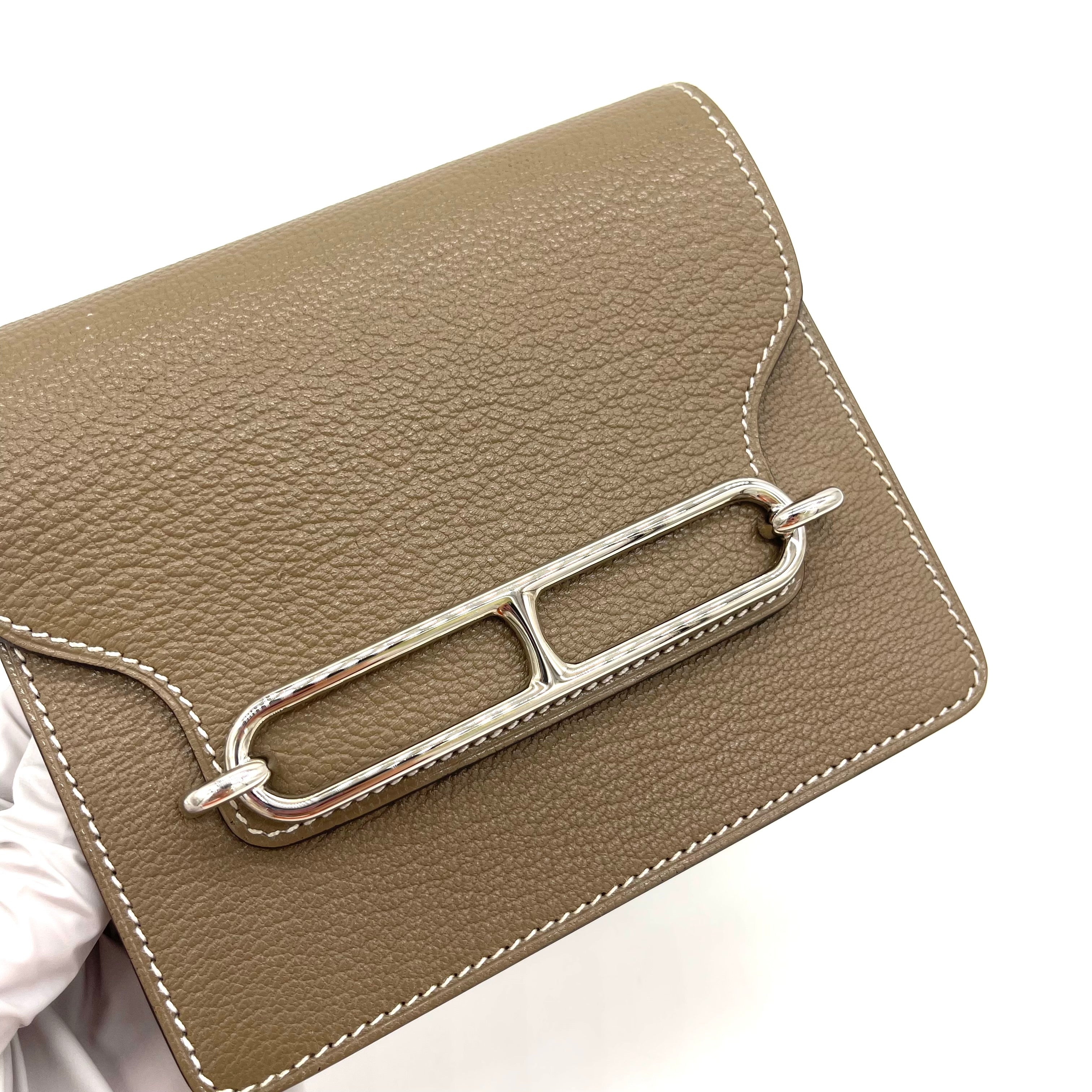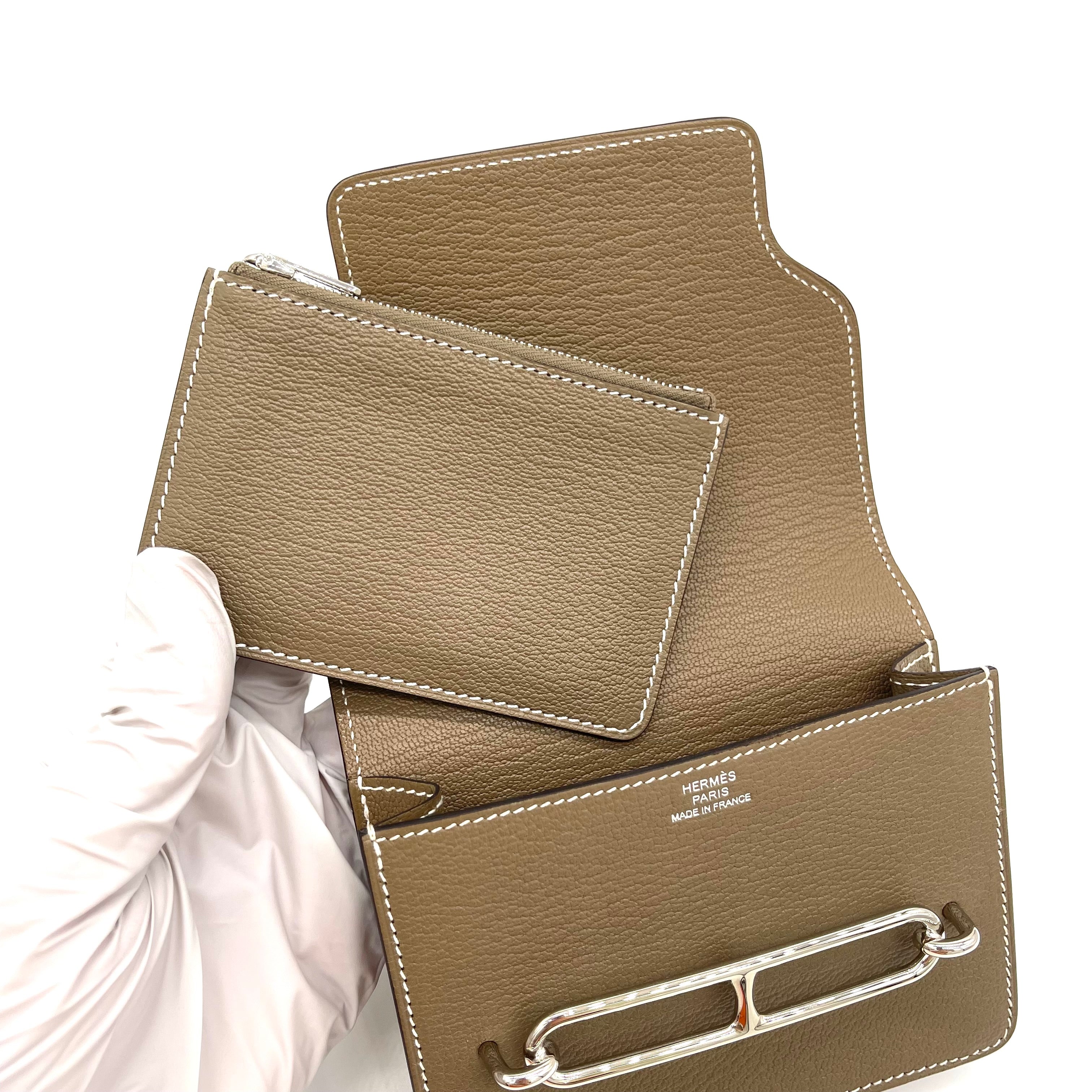 This is an authentic HERMES Chevre Mysore Roulis Slim Wallet in Etoupe. This compact essential wallet is crafted of Epsom calfskin leather in Etoupe and features a frontal silver plated H clasp that opens to a matching Etoupe leather interior with card slots.