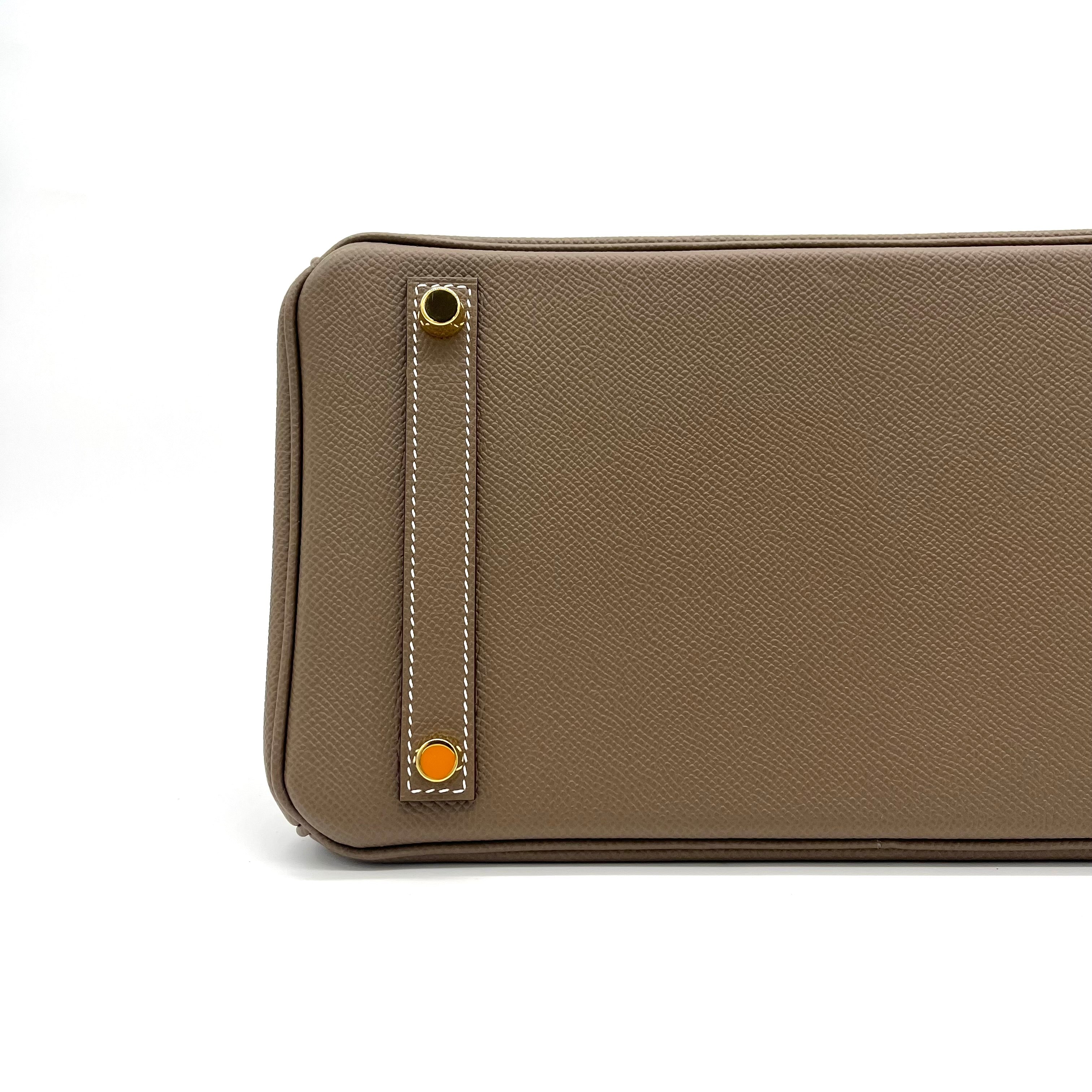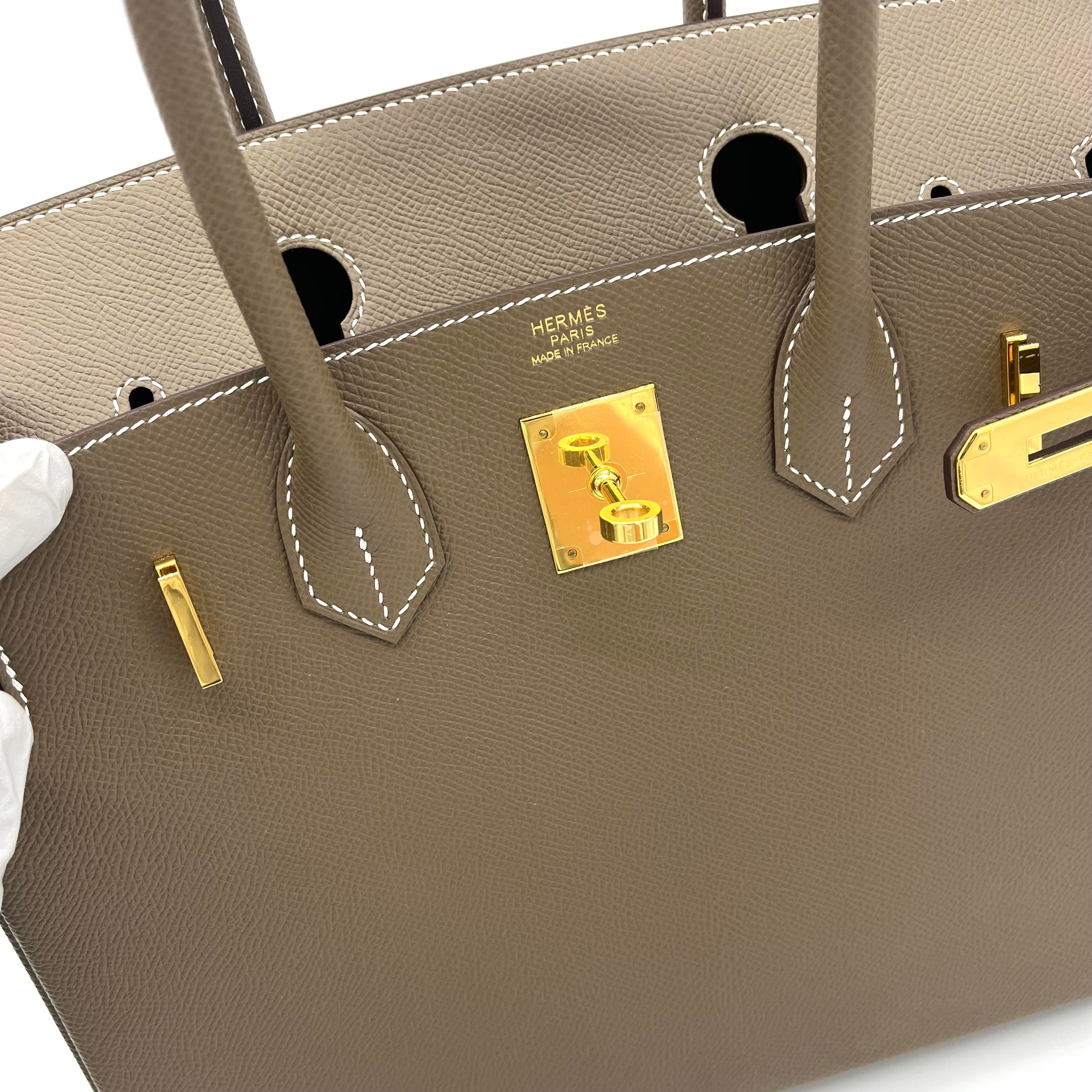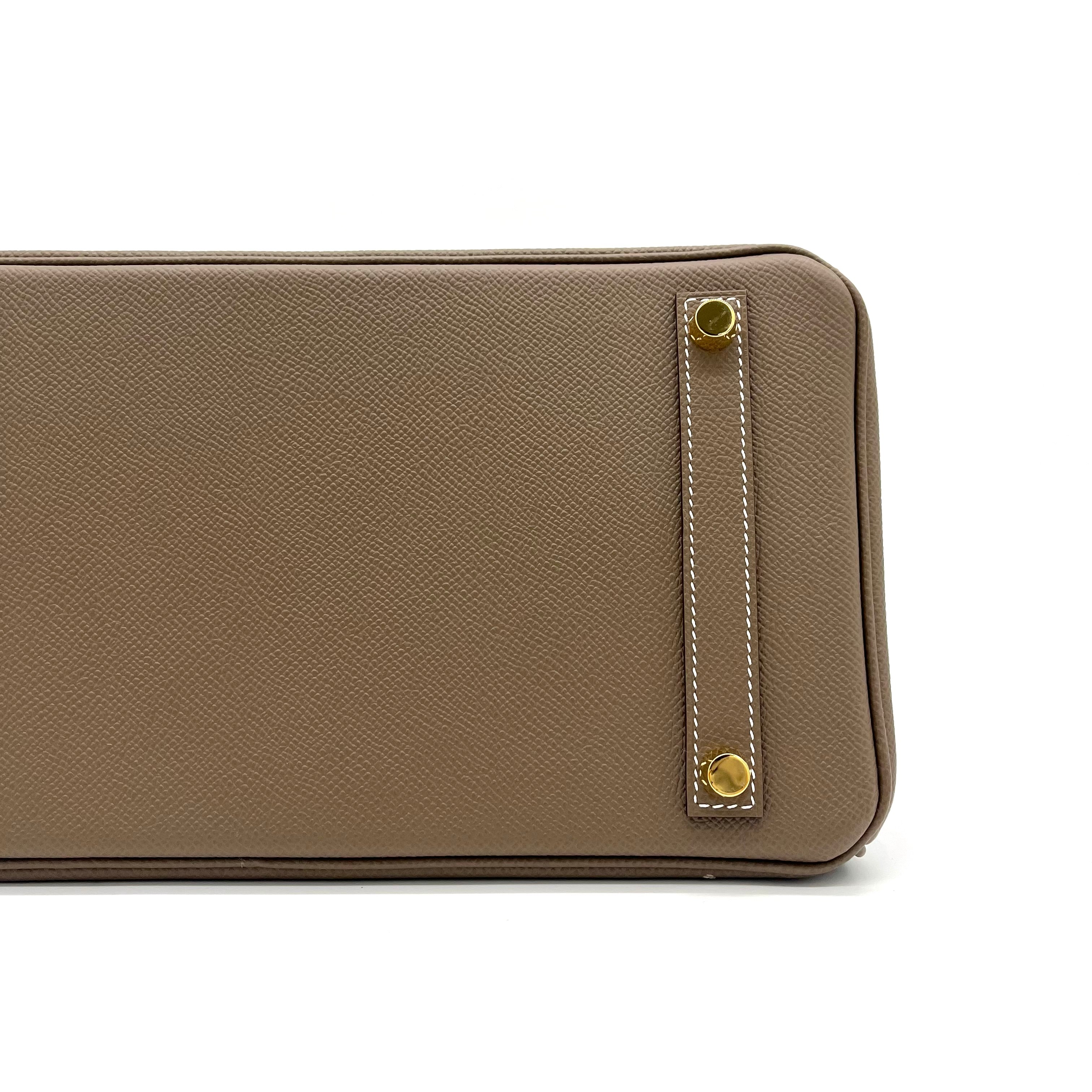 This is an authentic HERMES Epsom Birkin 30 in Etoupe. This iconic handbag is finely crafted of grained calfskin leather in taupe. The bag features rolled leather top handles, a leather belt, and polished gold plated hardware, including a turn lock, a padlock. The front flap opens to a matching goatskin leather interior with zipper and patch pockets.