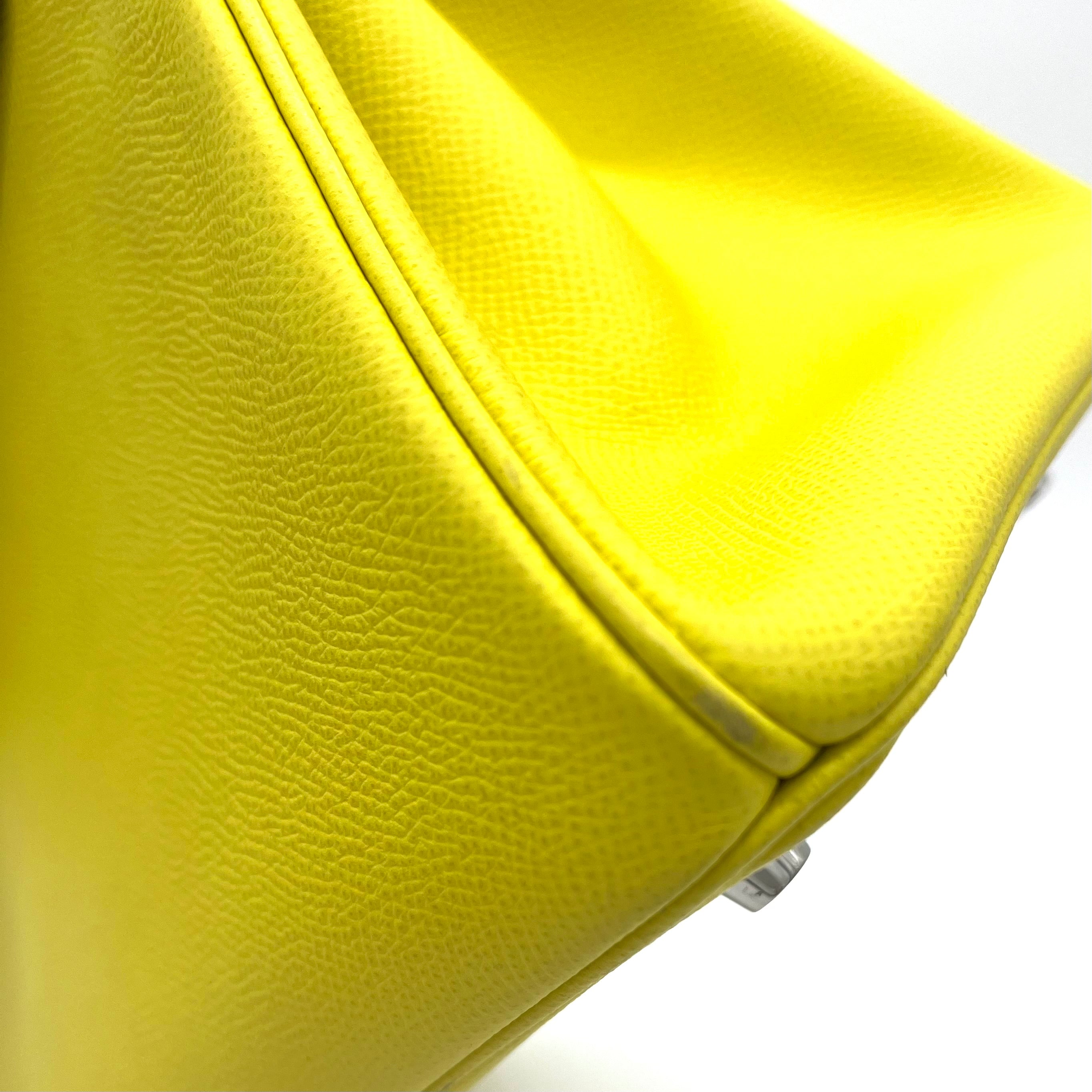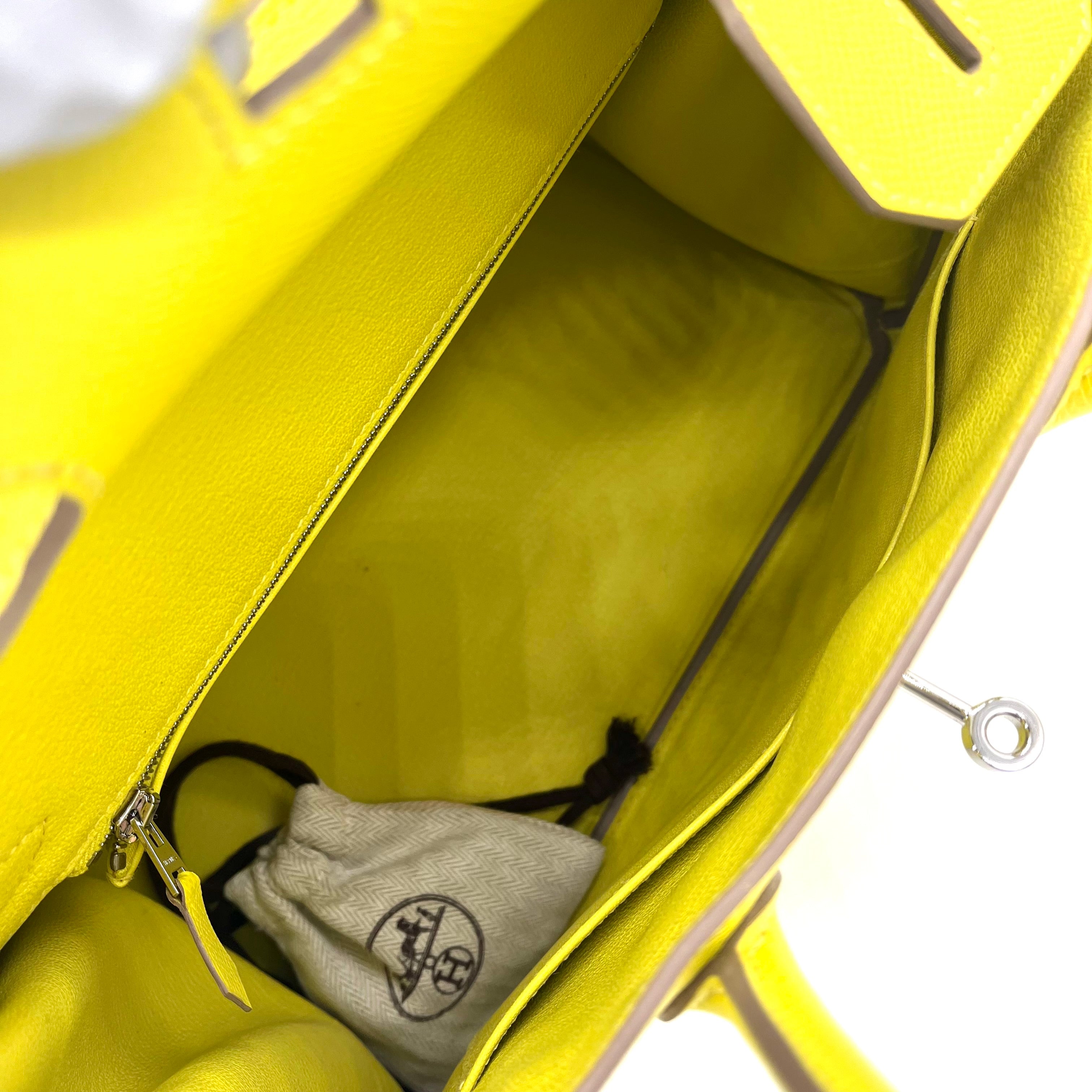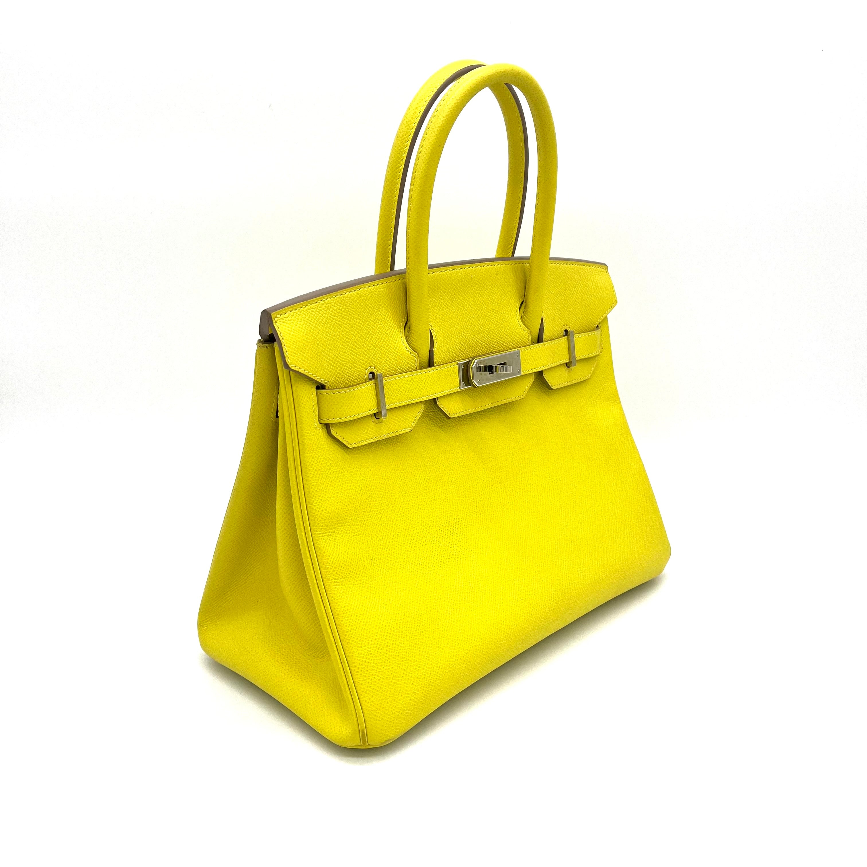 This is an authentic HERMES Epsom Birkin 30 in Lime. This stylish tote is beautifully crafted of epsom stamped calfskin leather in lime. The bag features rolled leather top handles, a frontal flap and strap closure, and polished silver hardware including a turn lock. This opens to a matching leather interior with zipper and patch pockets.