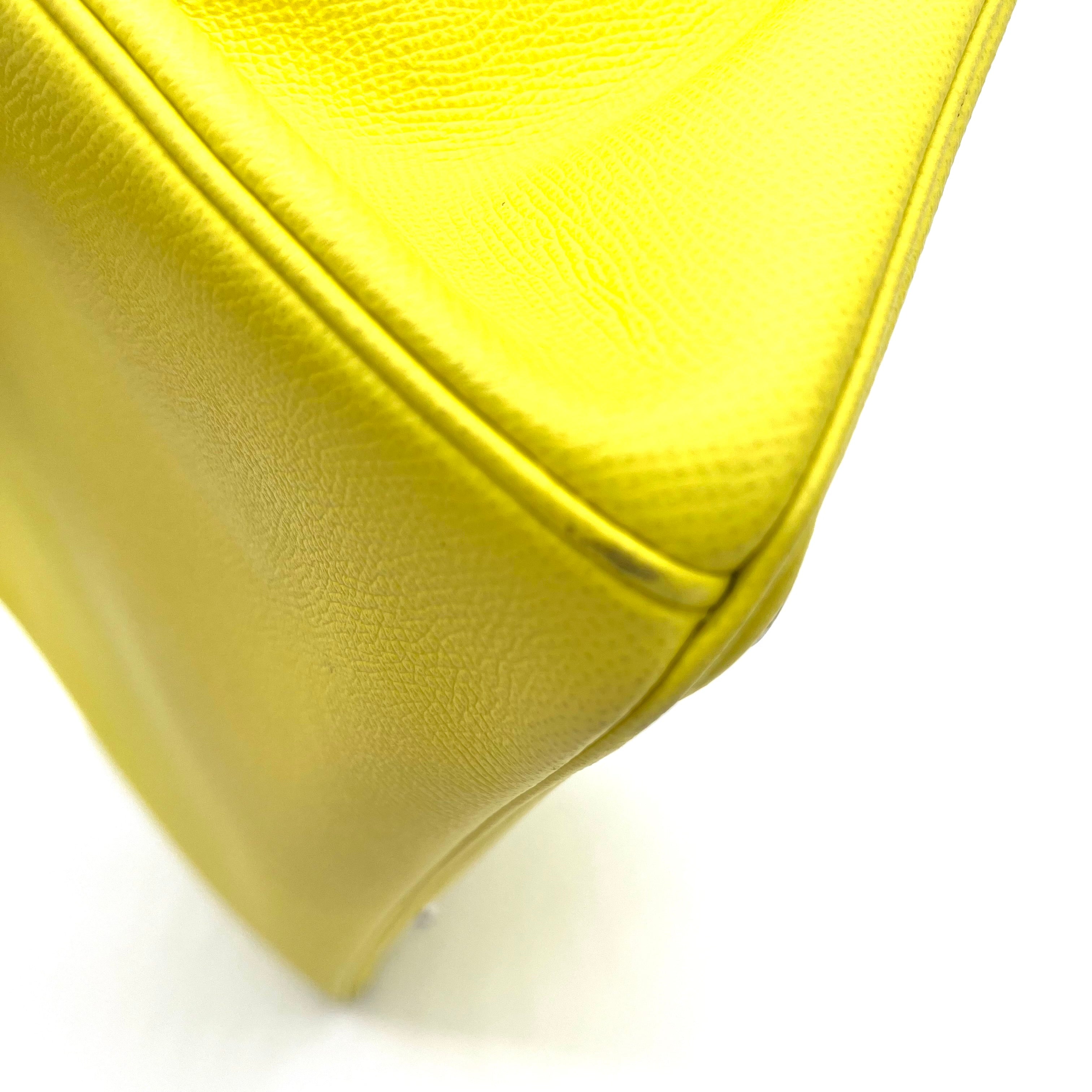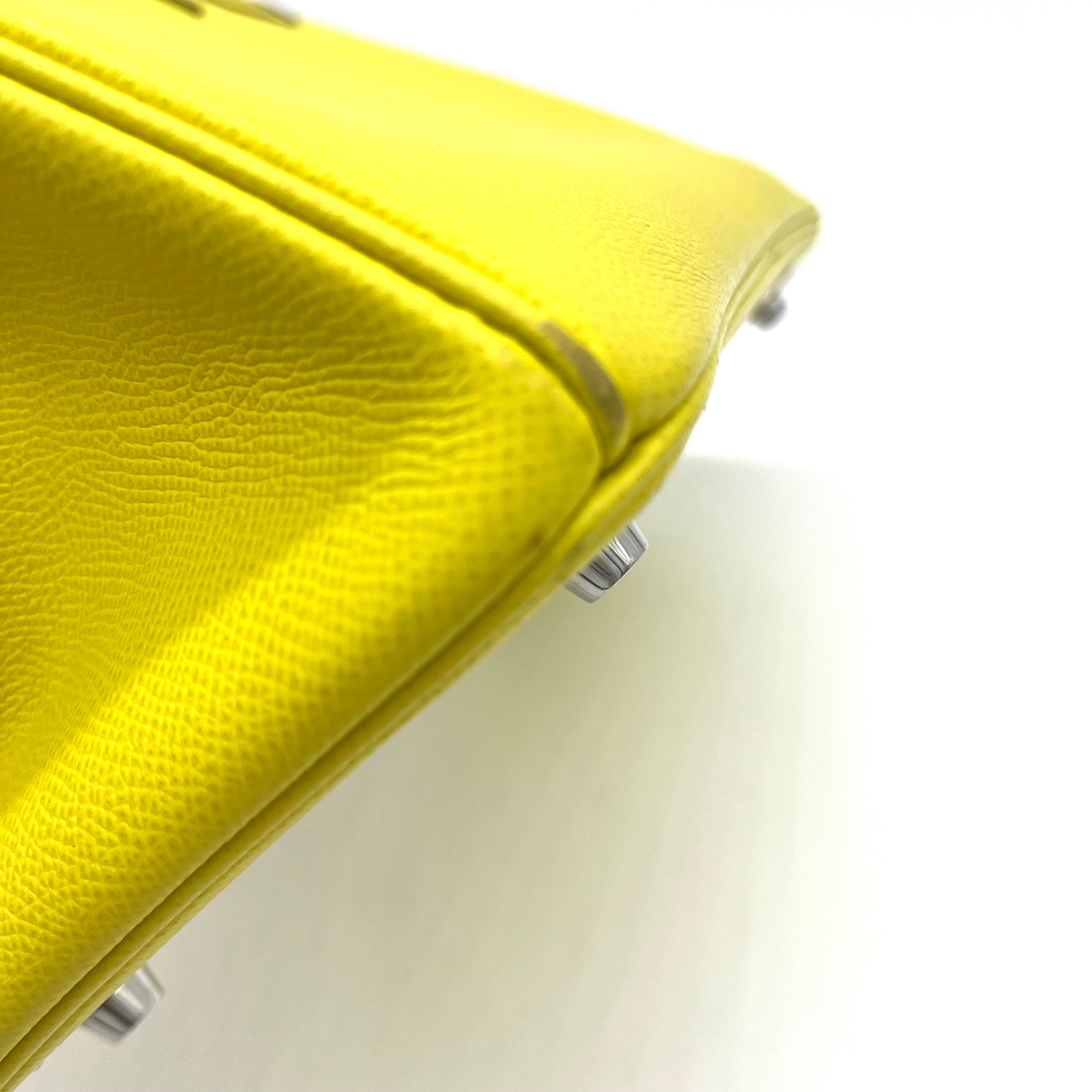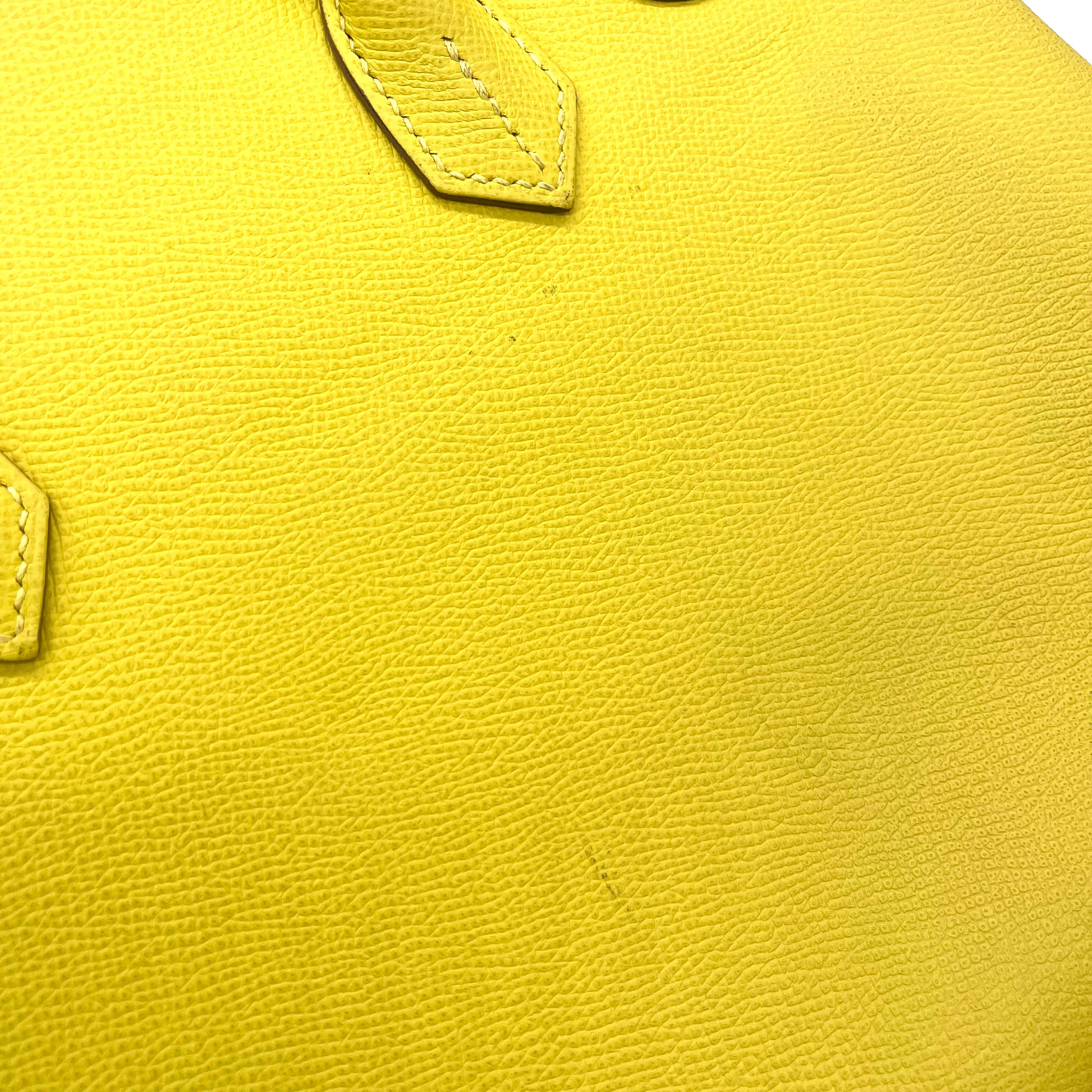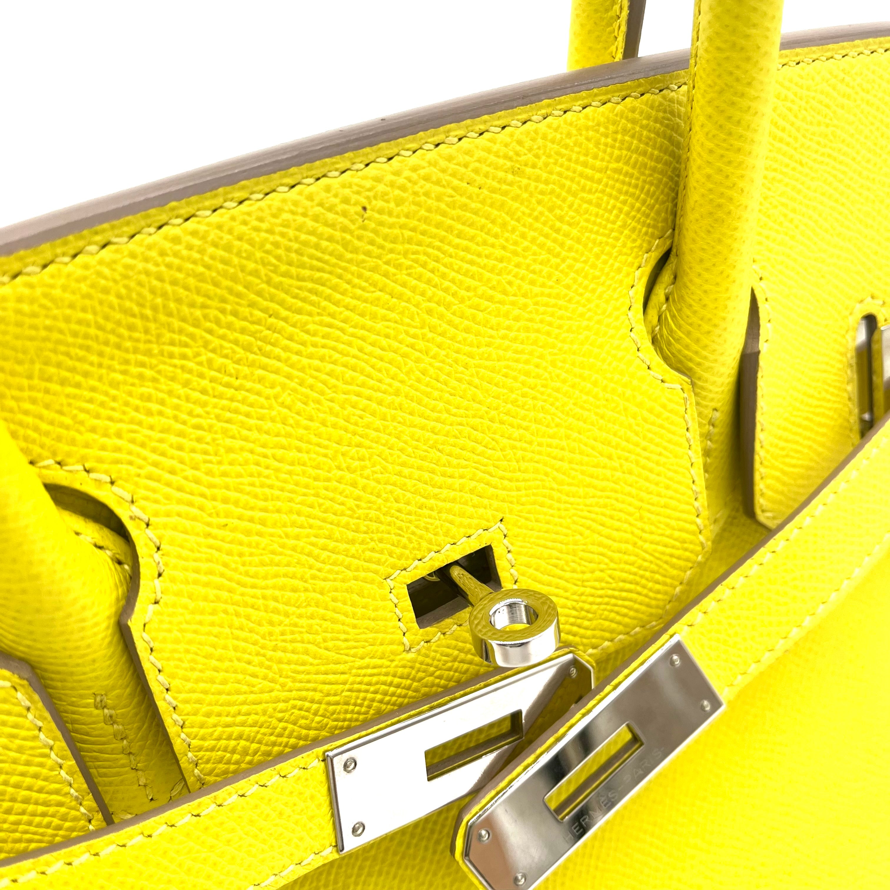 This is an authentic HERMES Epsom Birkin 30 in Lime. This stylish tote is beautifully crafted of epsom stamped calfskin leather in lime. The bag features rolled leather top handles, a frontal flap and strap closure, and polished silver hardware including a turn lock. This opens to a matching leather interior with zipper and patch pockets.