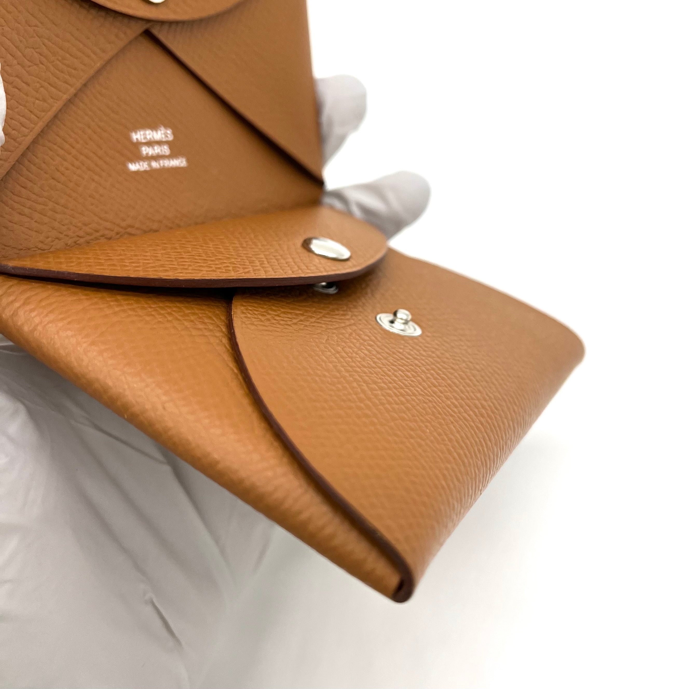 This is an authentic HERMES Epsom Calvi Duo Card Case in Gold. This stylish case is crafted of richly grained epsom calf leather in golden brown. The case opens with a snap to an origami folded pocket and a coin pocket.