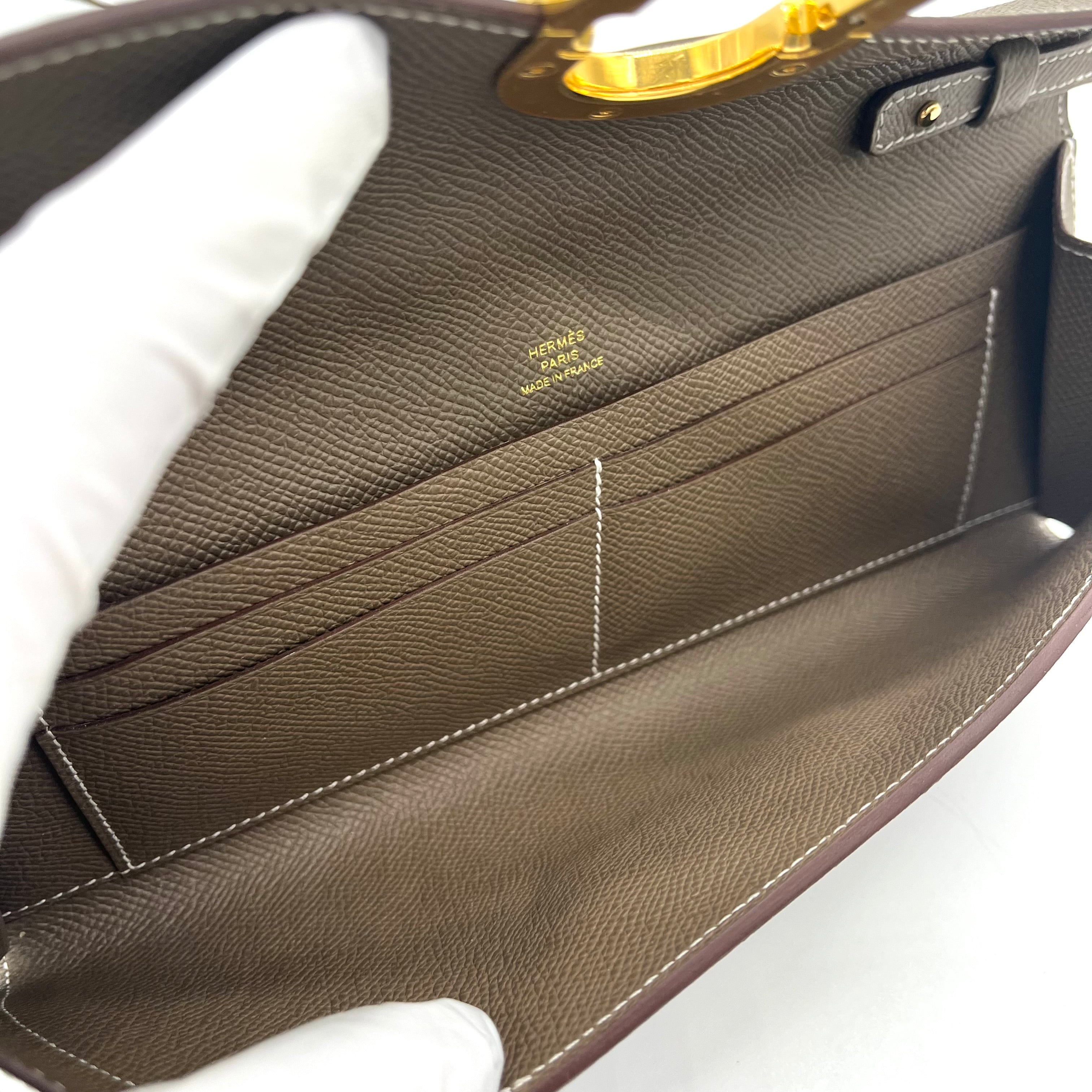 This is an authentic HERMES Epsom Chaine D'Ancre Wallet in Taupe Gold Hardware . This chic wallet is crafted of fine Epsom calfskin leather in Taupe. The wallet features a front flap, an optional shoulder strap, and a signature H gold plated press-lock. This opens to a partitioned leather interior with card slots, patch pockets, and a zipper compartment.