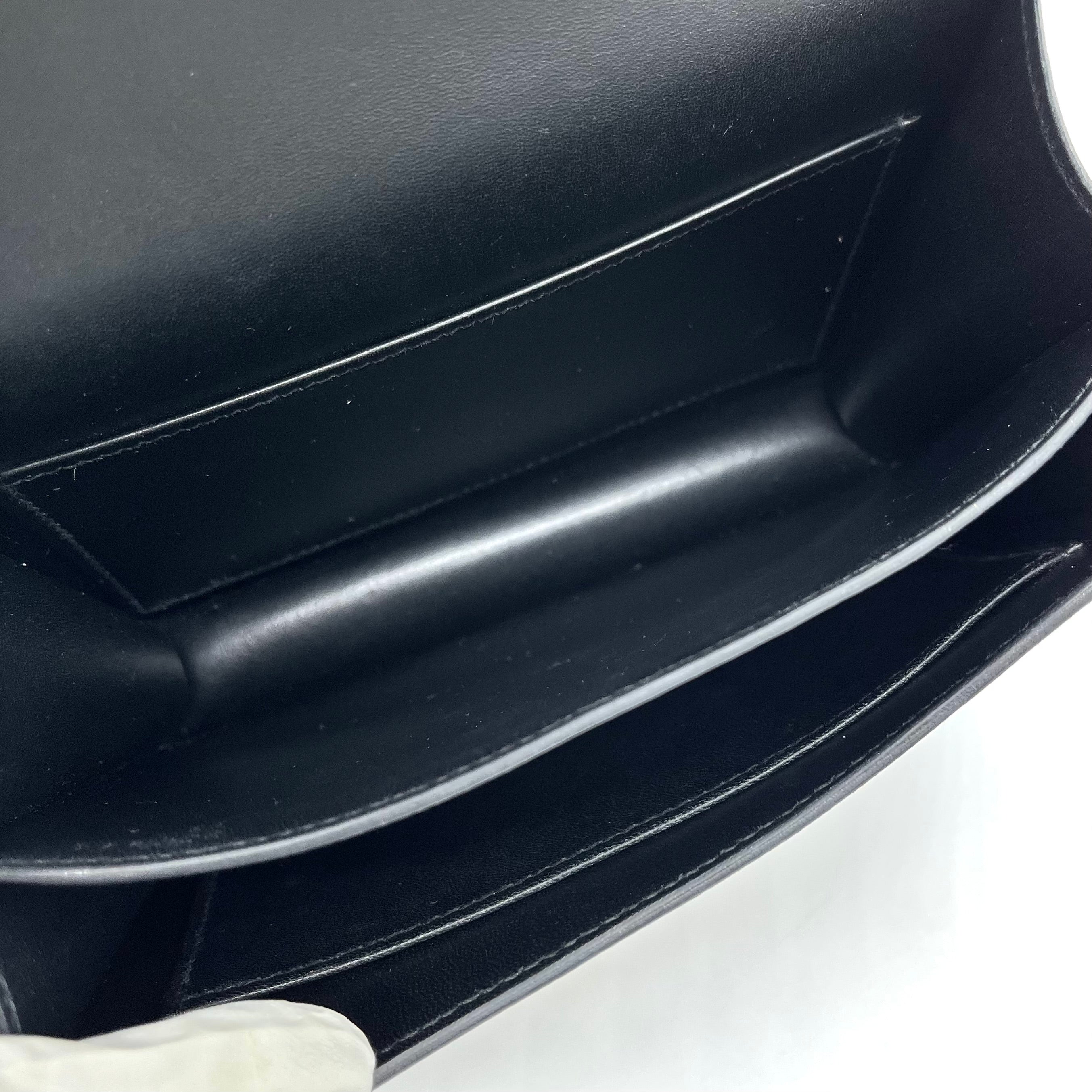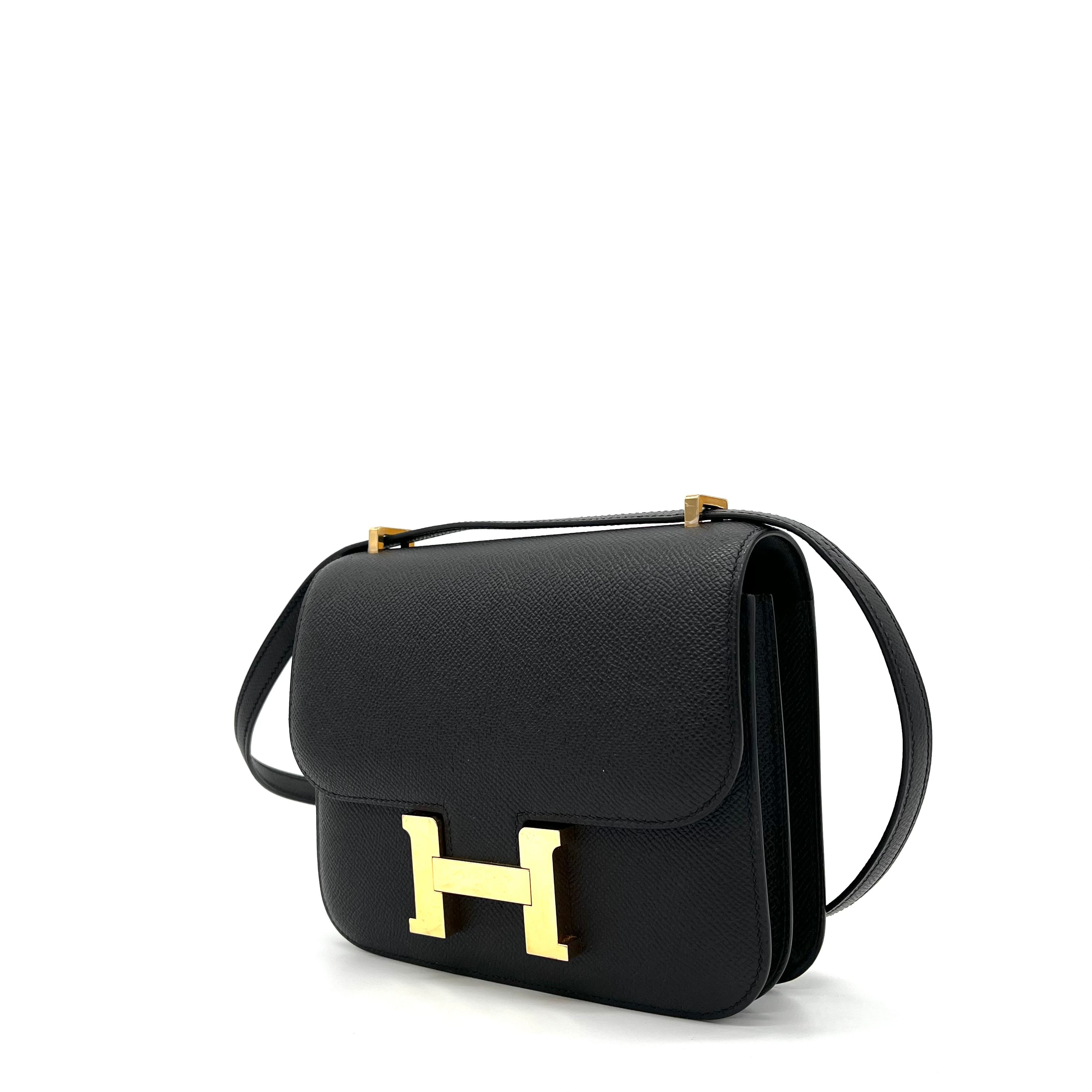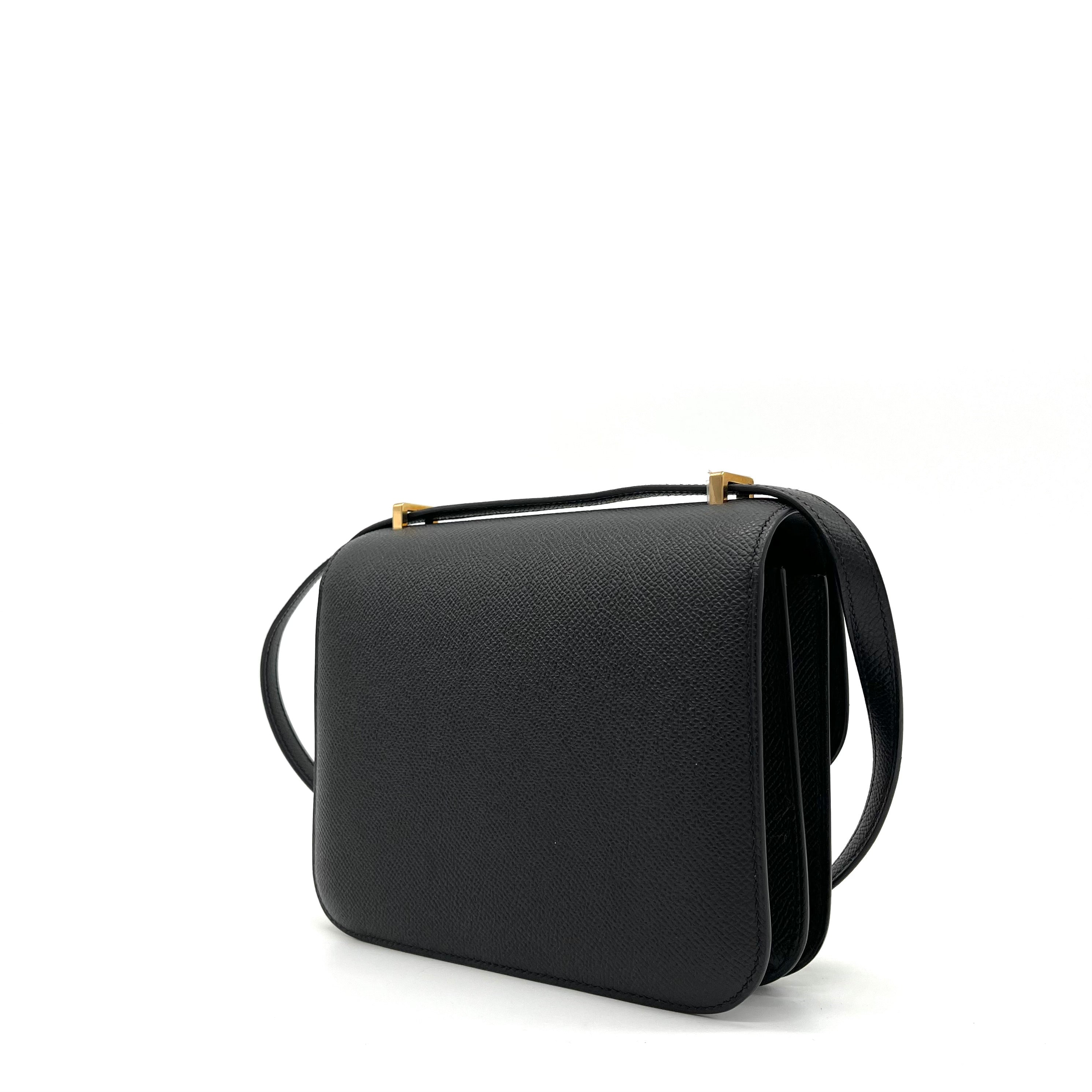 This is an authentic HERMES Epsom Constance 18 in Black. This stylish shoulder bag is finely crafted of Epsom calfskin leather in black. The bag features a crossbody strap with gold hardware including an H buckle at the front flap. The flap opens to a compact partitioned black leather interior with patch pockets.