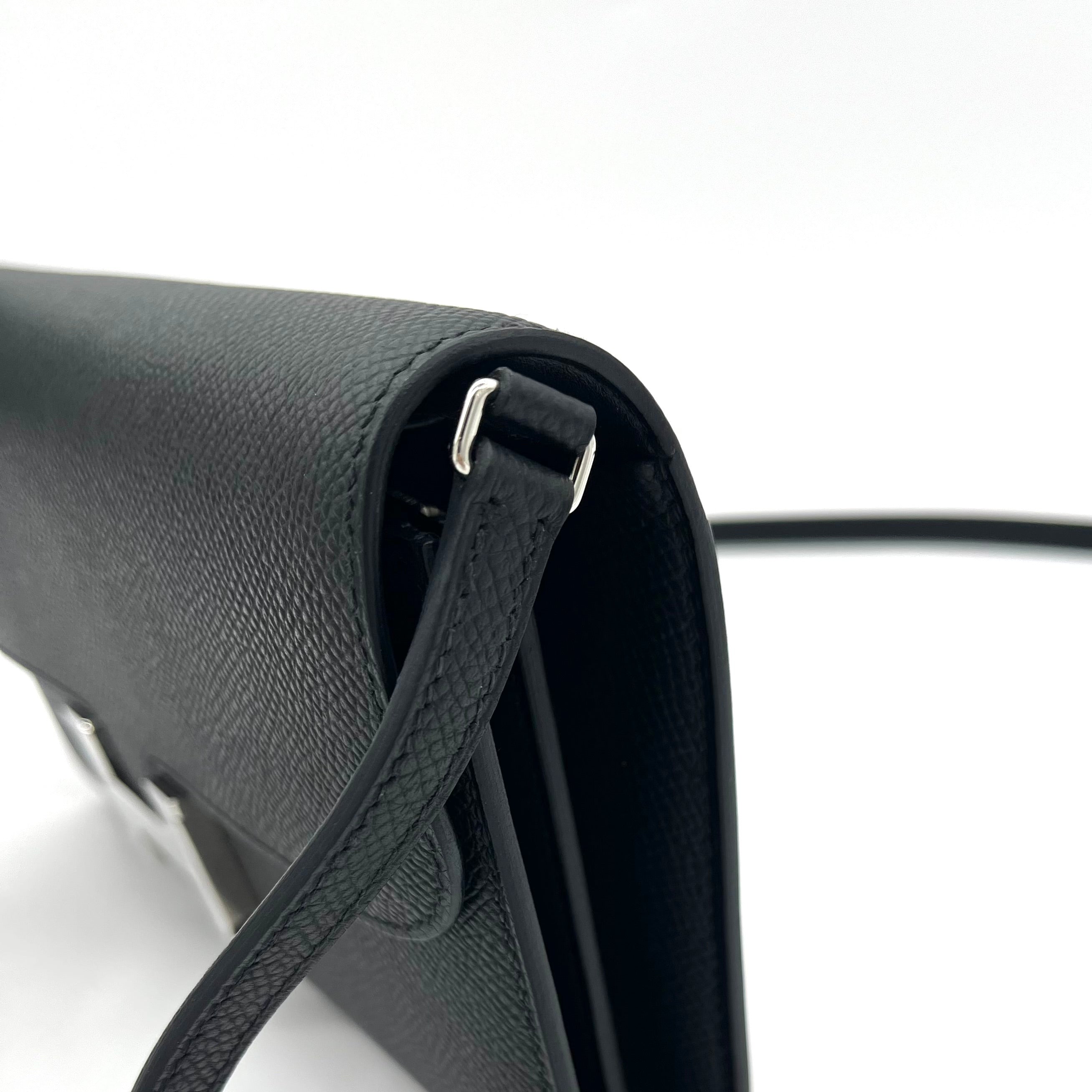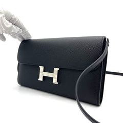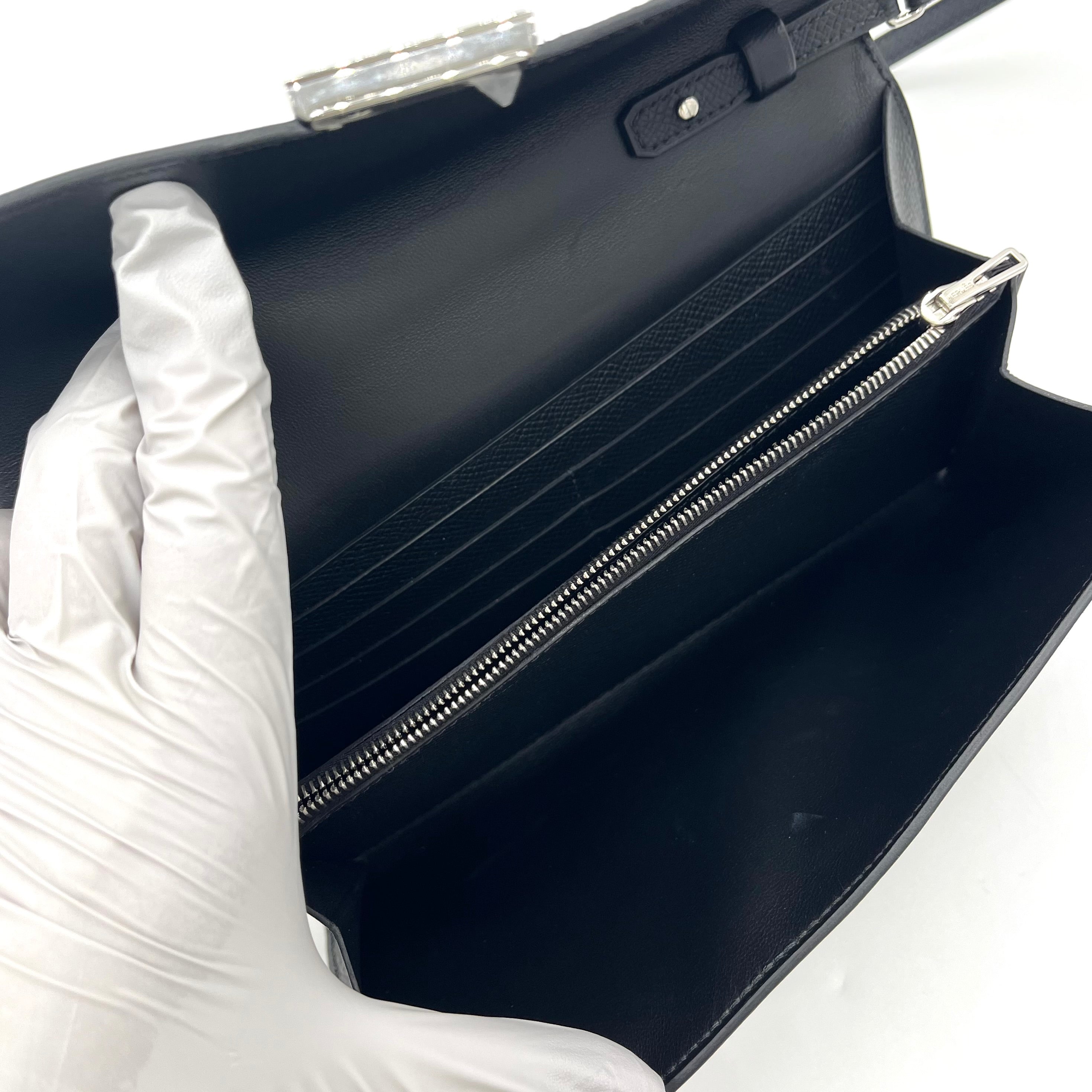 This is an authentic HERMES Epsom Constance Wallet To Go in Black This chic wallet is crafted of fine Epsom calfskin leather in black. The wallet features a front flap, strap, and signature polished silver palladium H press lock. This opens to a partitioned black leather interior with card slots, patch pockets, a detachable strap and a zipper pocket.