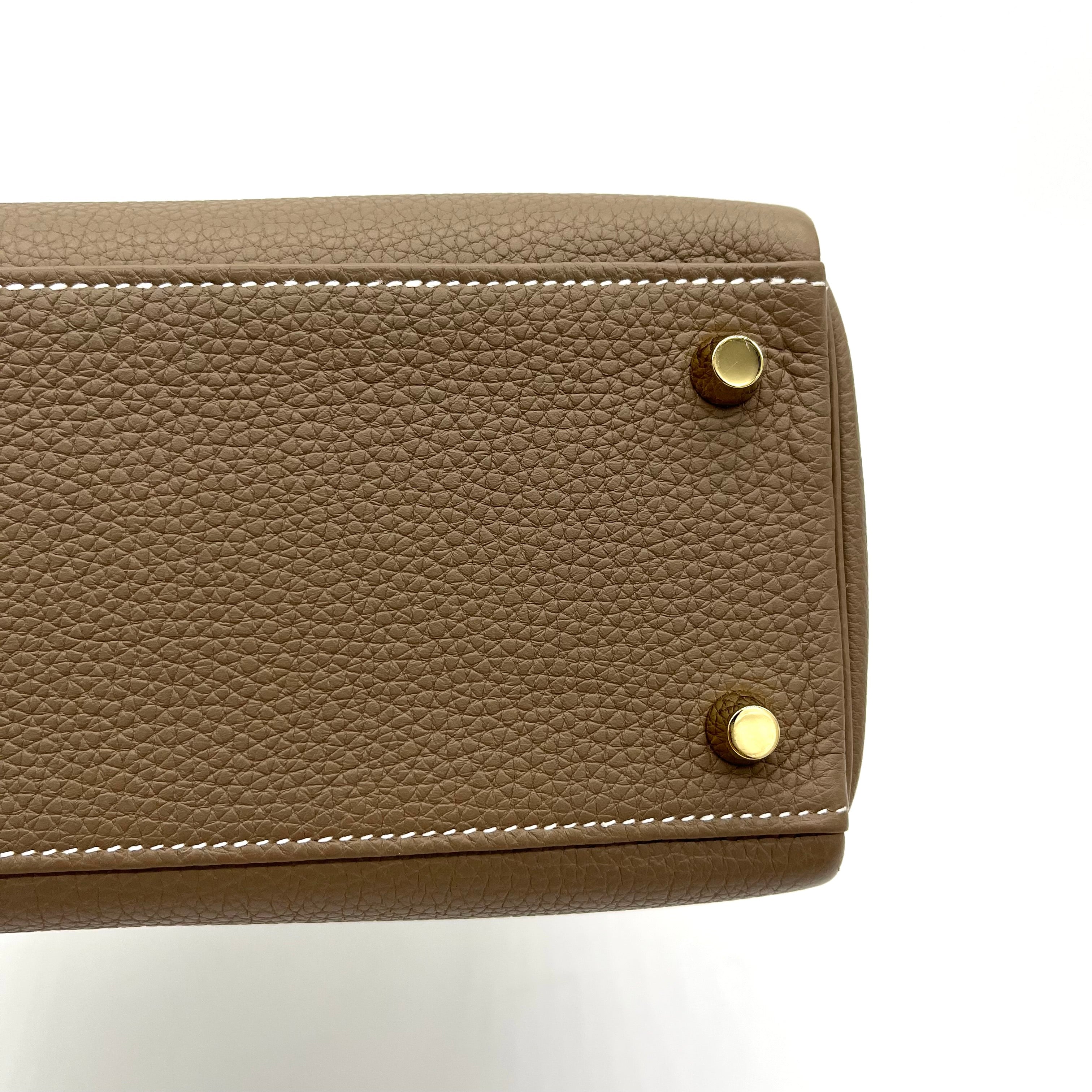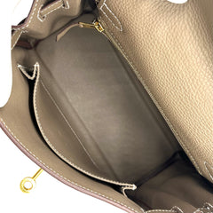 This is the authentic HERMES Epsom Kelly Sellier 25 in Etoupe. This classic Kelly handbag tote is crafted of luxuriously textured calfskin leather in taupe. The bag features a sturdy rolled leather top handle, an optional shoulder strap, and a crossover flap and strap closure with gold plated hardware including a padlock with a clochette for the keys. This opens to a leather interior with zippered and flat pockets.