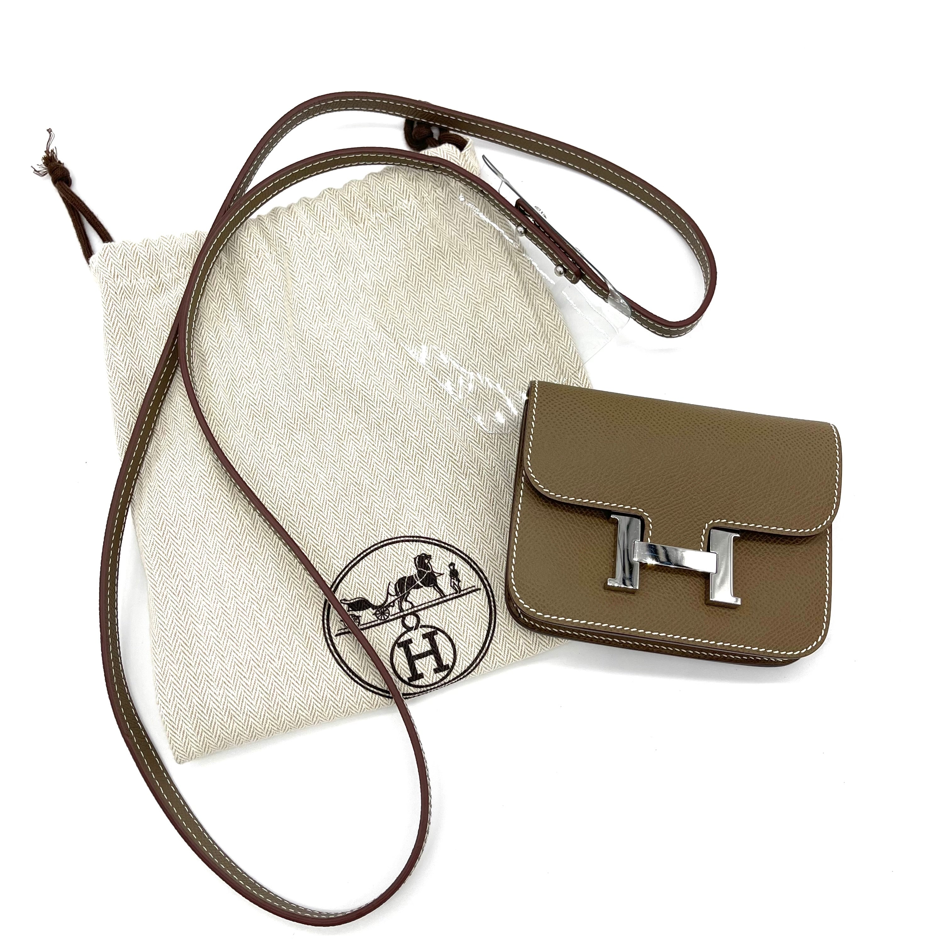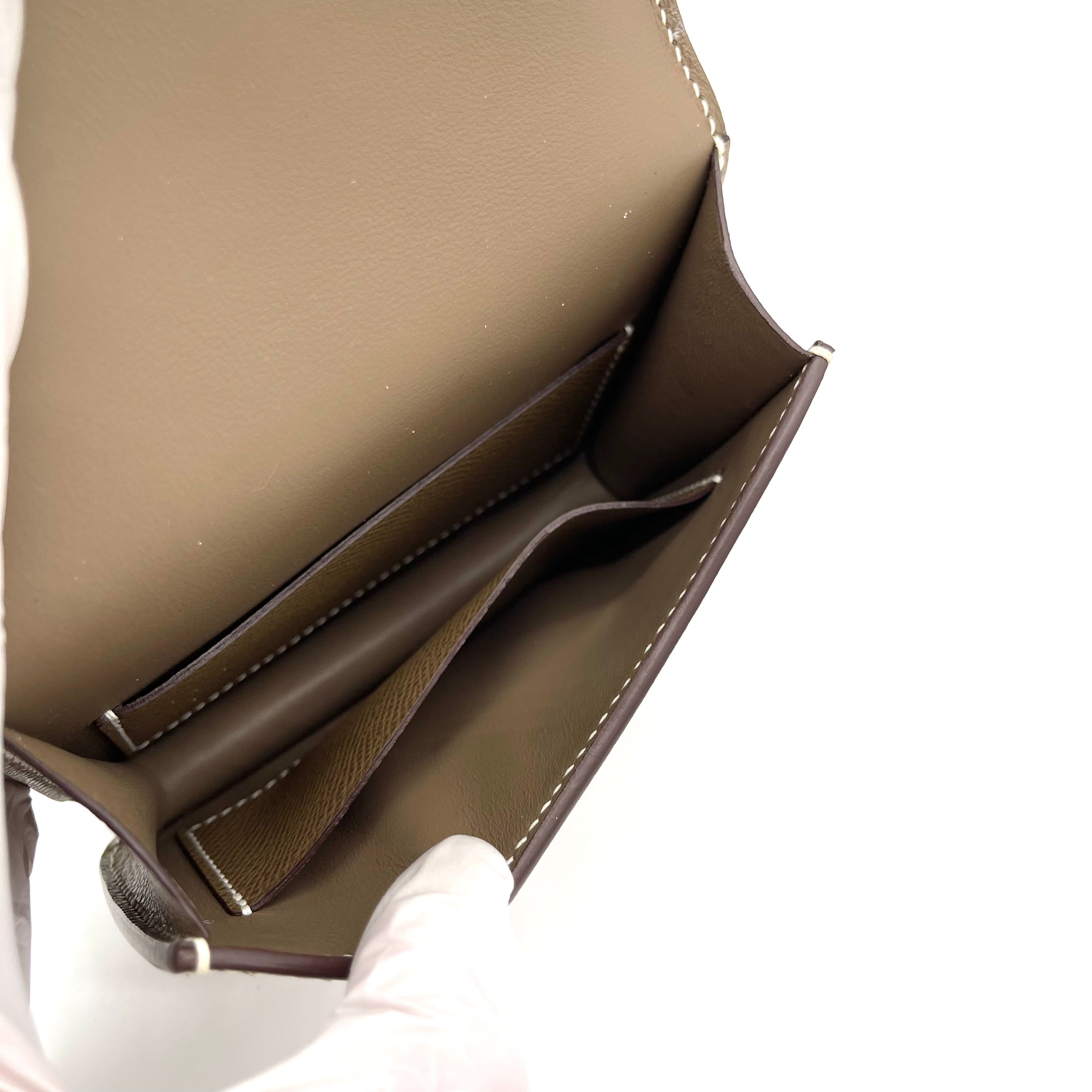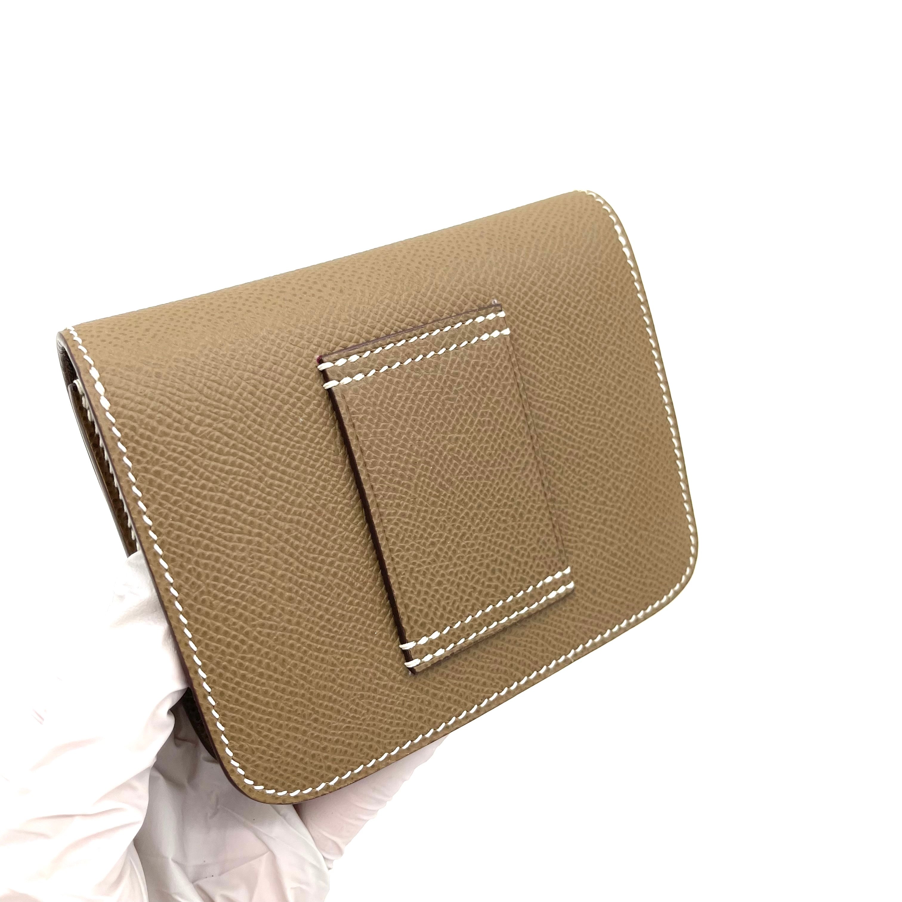 스트랩이 포함된 에투페 콘스탄스 슬림 지갑 실버. 이 컴팩트한 에센셜 지갑은 에투페 소재의 고급 엡솜 송아지 가죽으로 제작되었으며, 전면 플랩이 삽입되어 열리면 카드 슬롯이 있는 크로스 그레인 컴팩트한 내부로 이어지는 팔라듐 도금 H 패턴이 특징입니다.