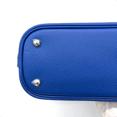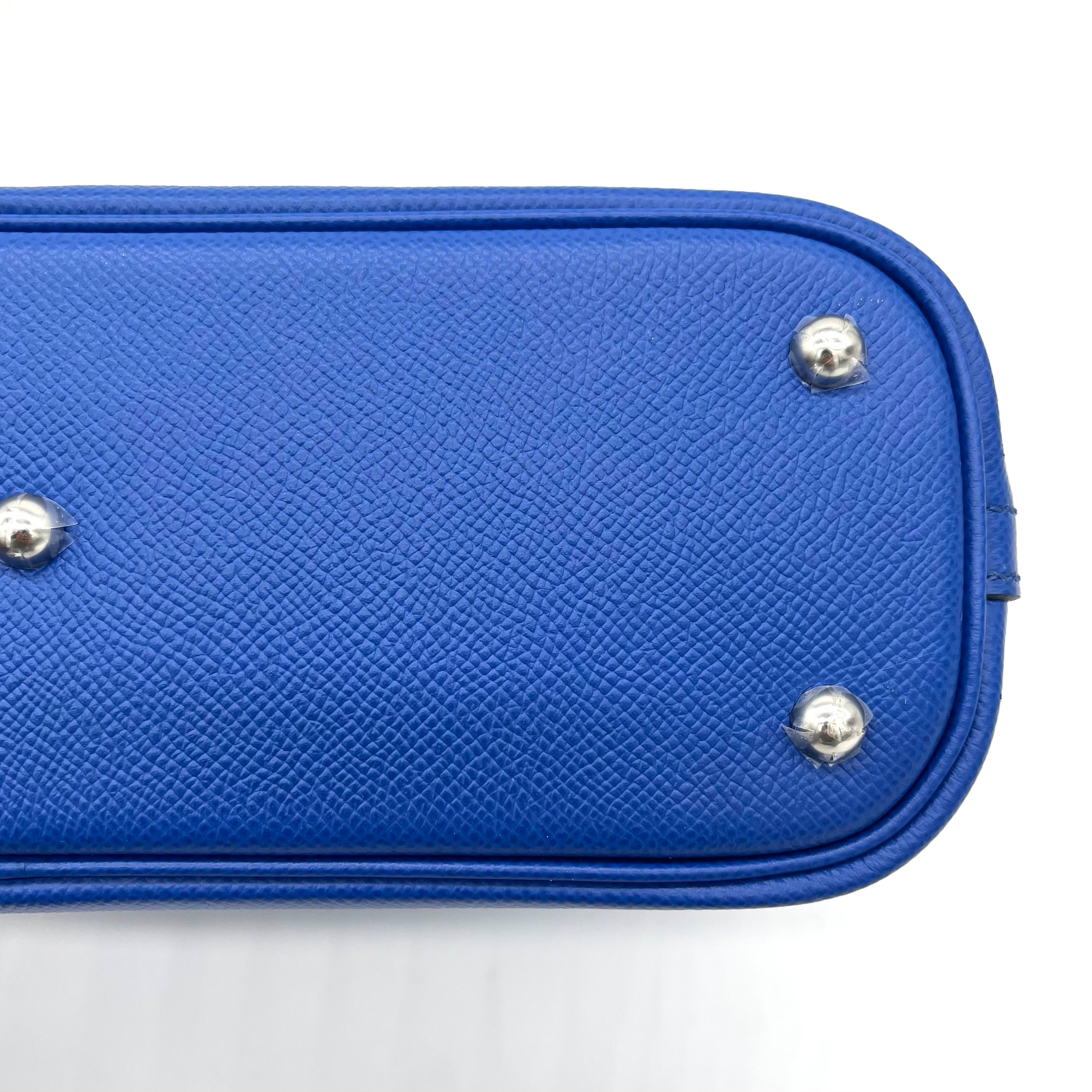 This is an authentic HERMES Evercolor 1923 Bolide 25 in Bleu France. This tote is crafted of calfskin leather in blue. This mini handbag features rolled leather top handles, an optional leather shoulder strap, and silver palladium hardware. The top zipper opens to a matching grey leather interior with patch pockets.