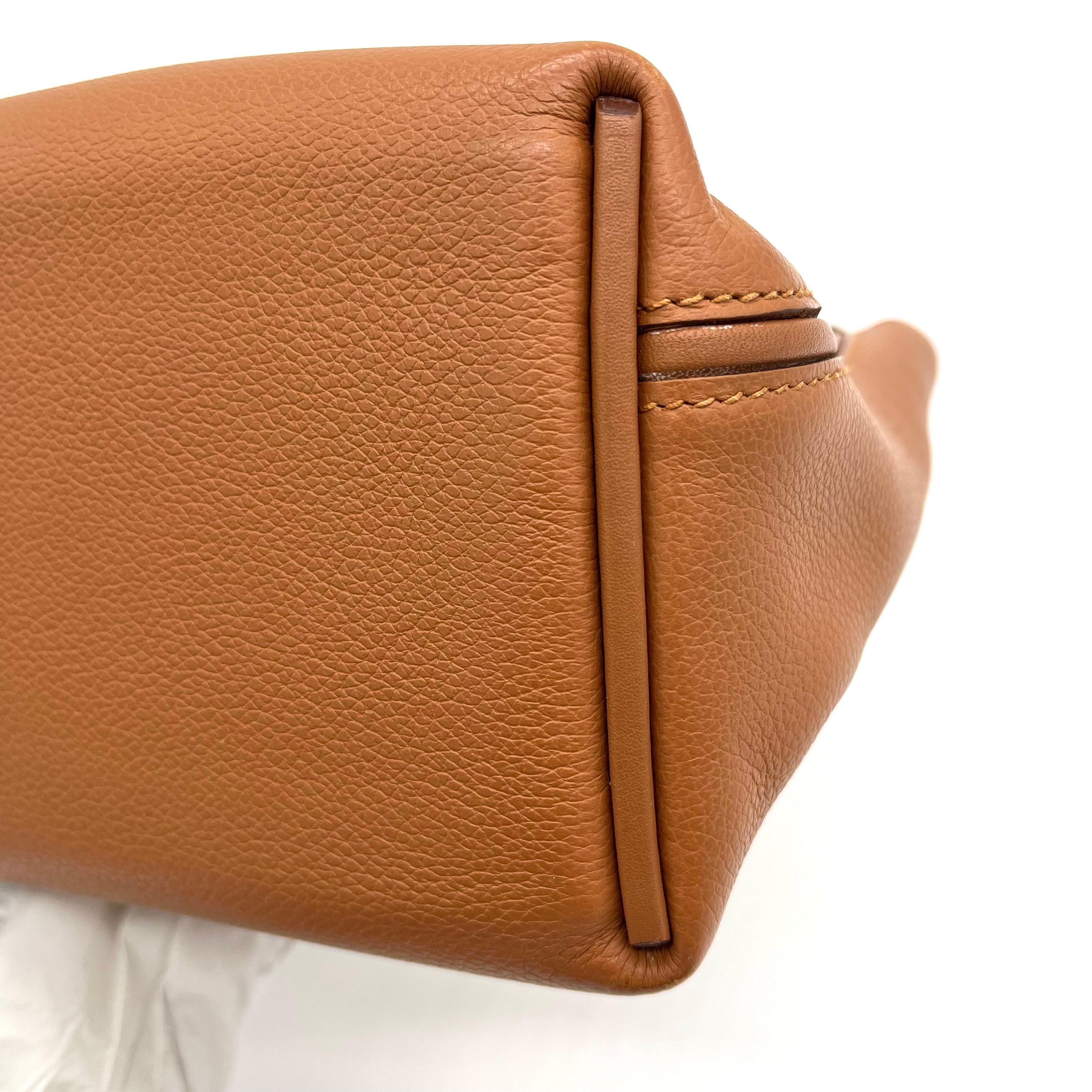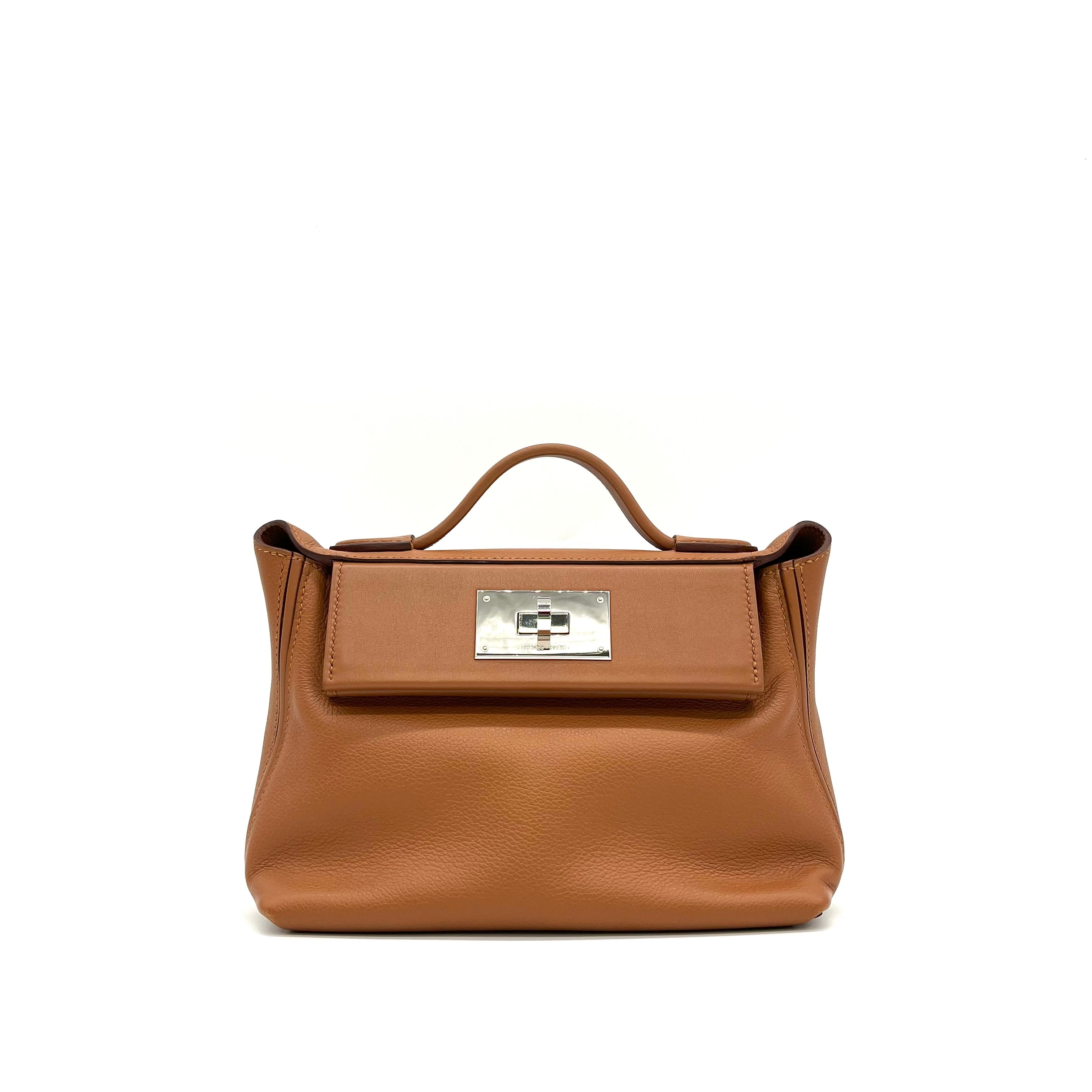 This is an authentic HERMES Evercolor Swift 24/24 21 in Gold. This handbag is crafted of richly textured calfskin leather in golden brown. The bag features a reinforced leather top handle, an optional leather shoulder strap, and silver palladium hardware. This bag can also be styled as a belt bag. The flap opens to a matching smooth leather interior with a zipper pocket.