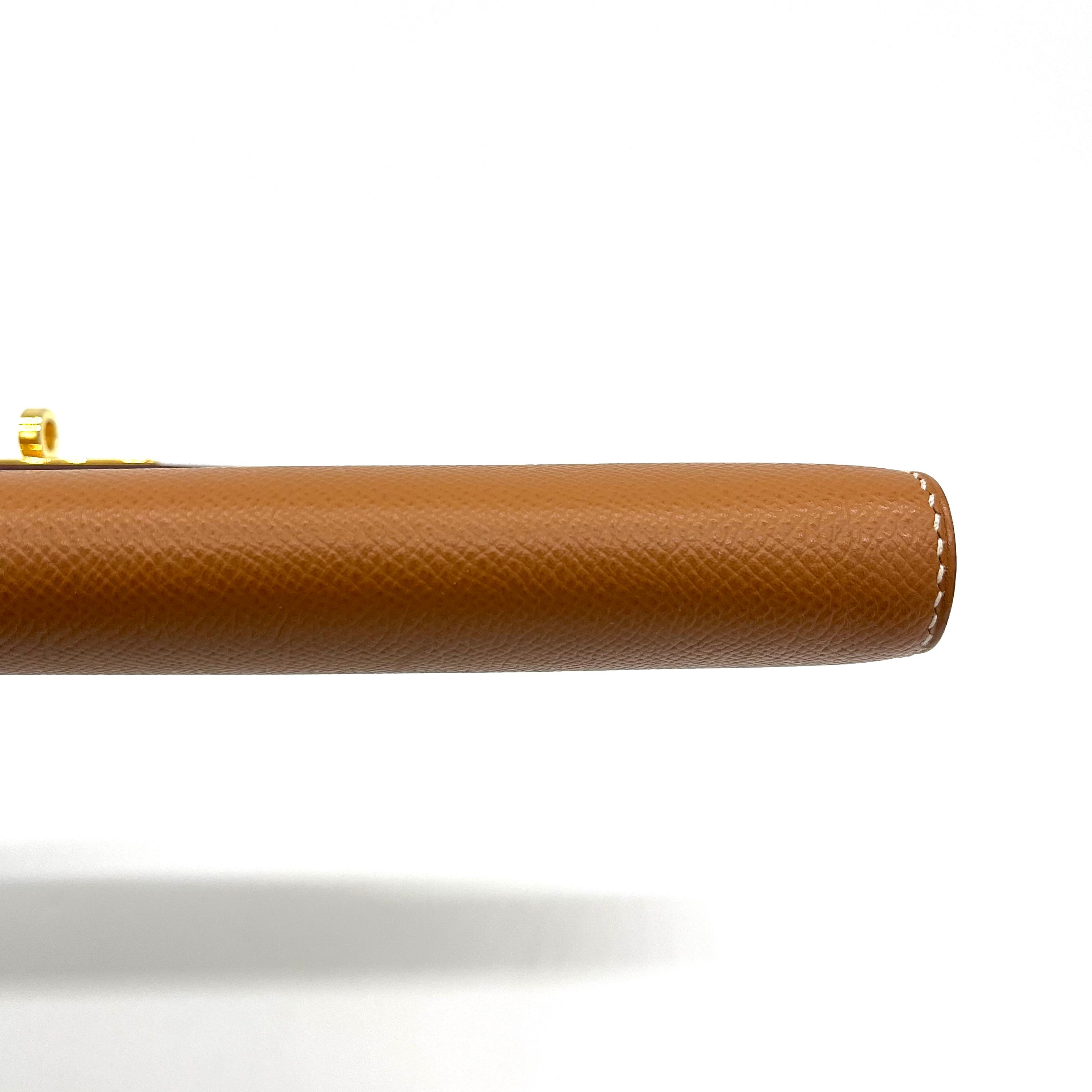 This is a HERMES Swift Kelly Cut Clutch Pochette in Gold. This chic clutch is crafted of fine swift calfskin leather in brown. In the style of the Kelly handbags, the clutch has a leather strap handle, a cross-over flap, and strap closure with polished brass turn lock. This opens to a matching leather interior with a patched pocket.