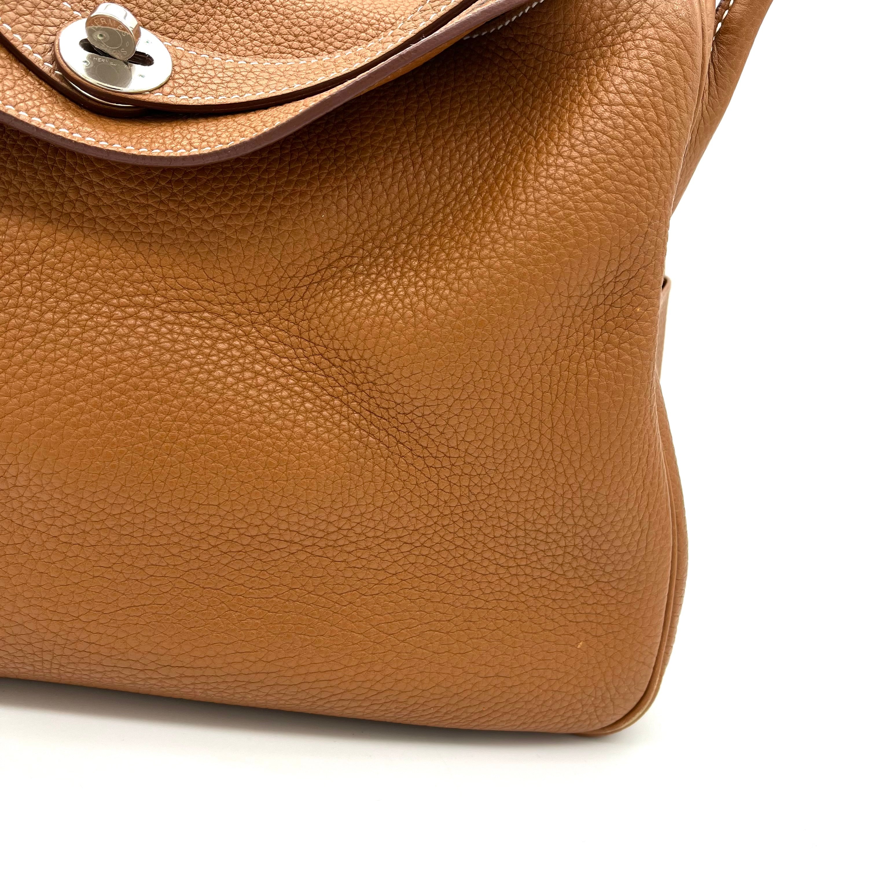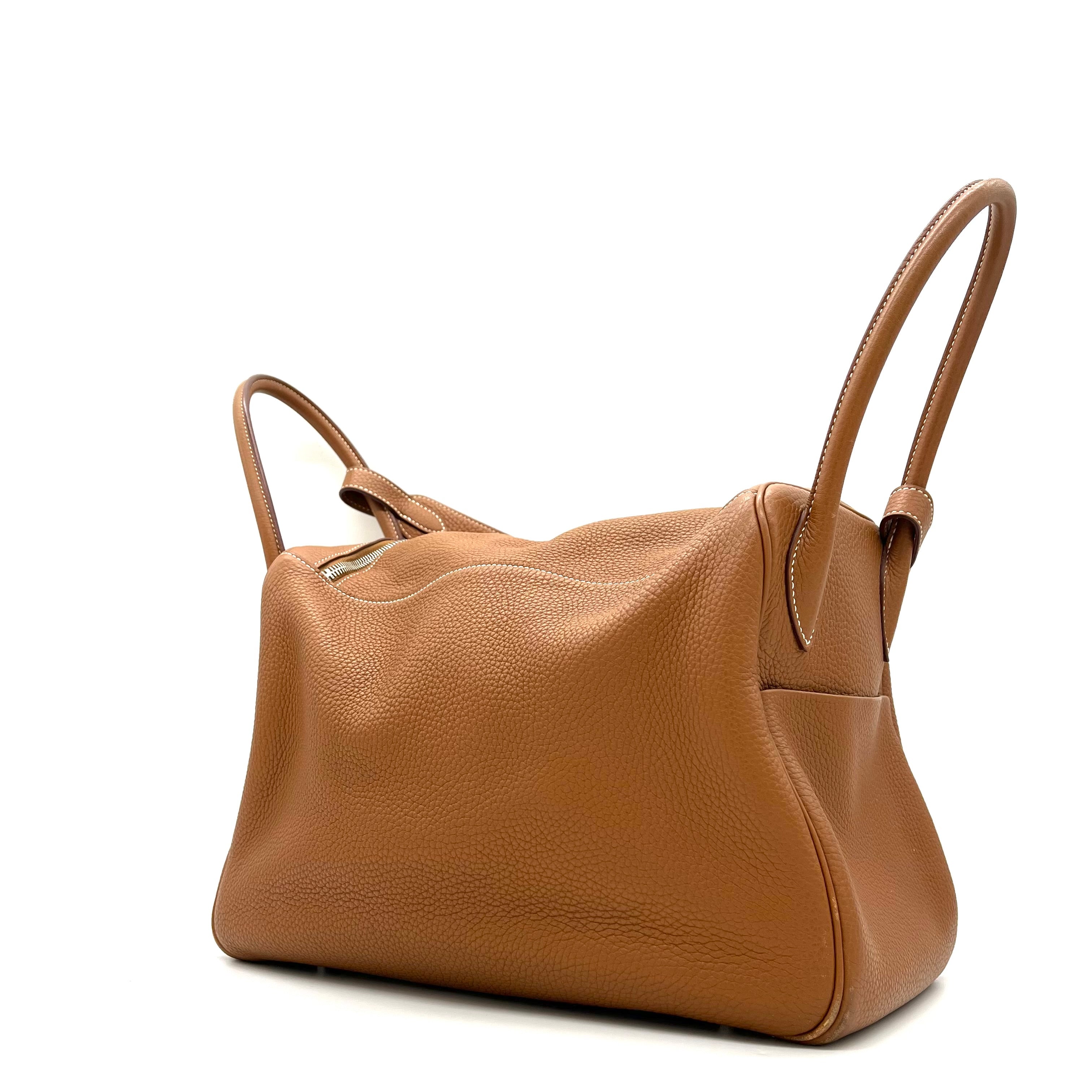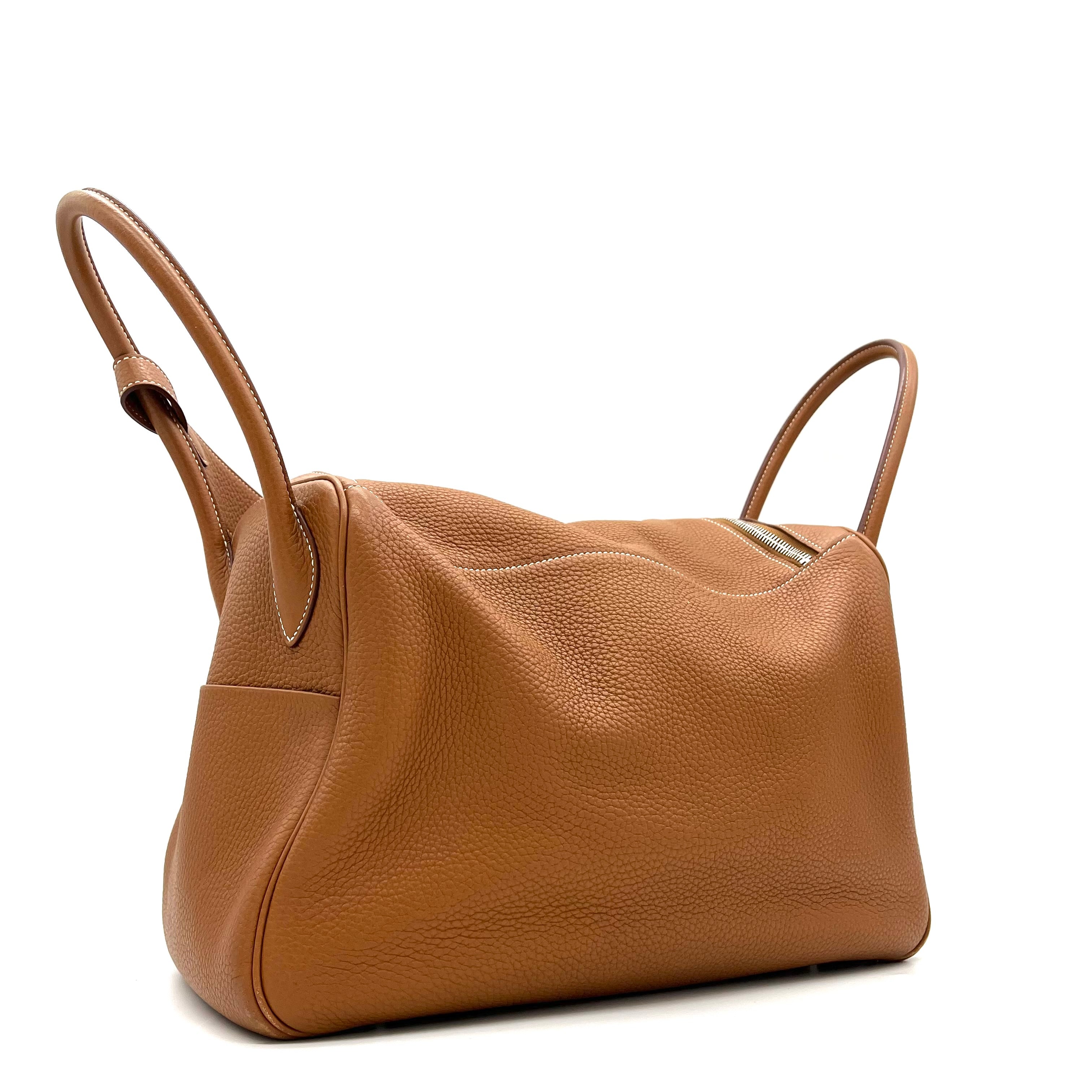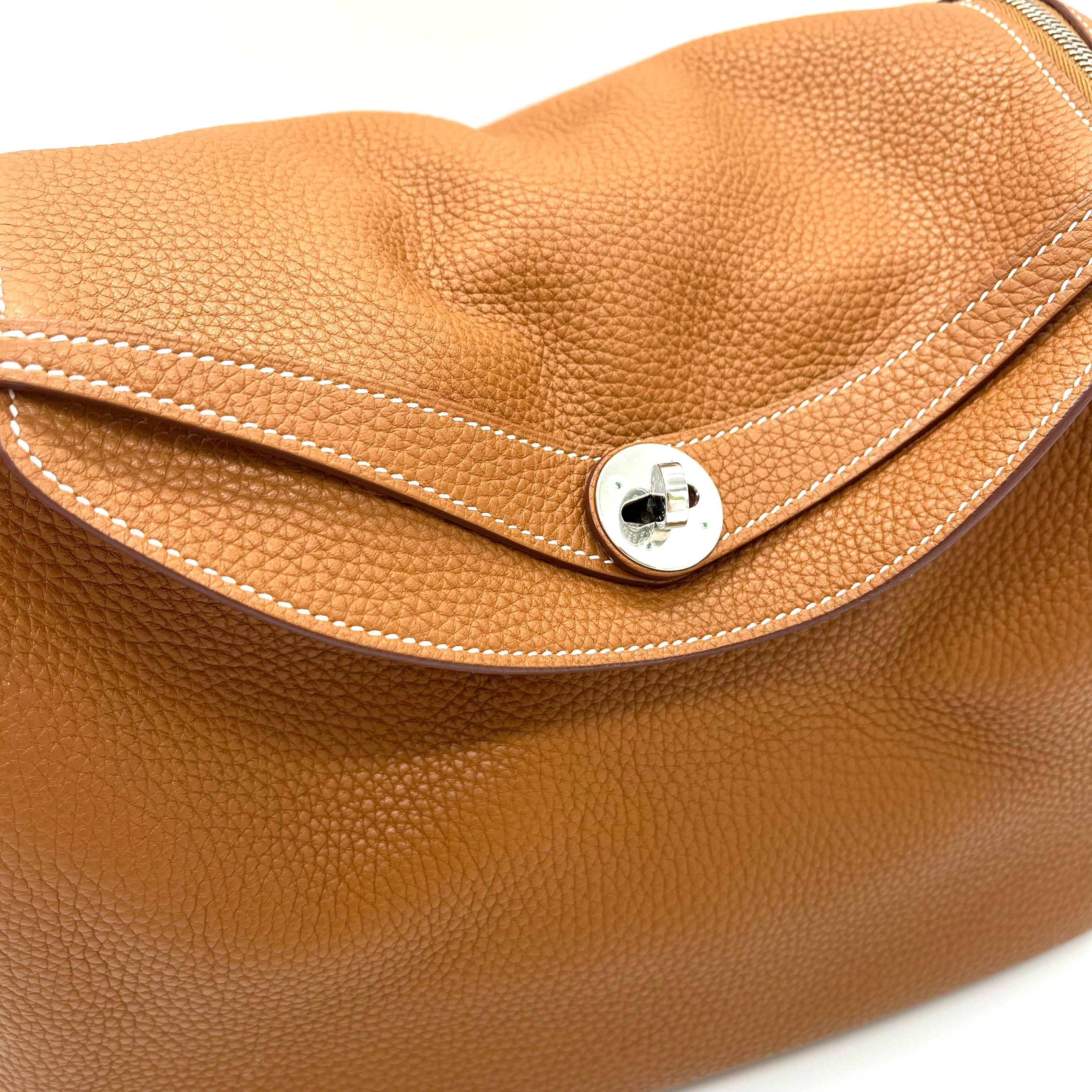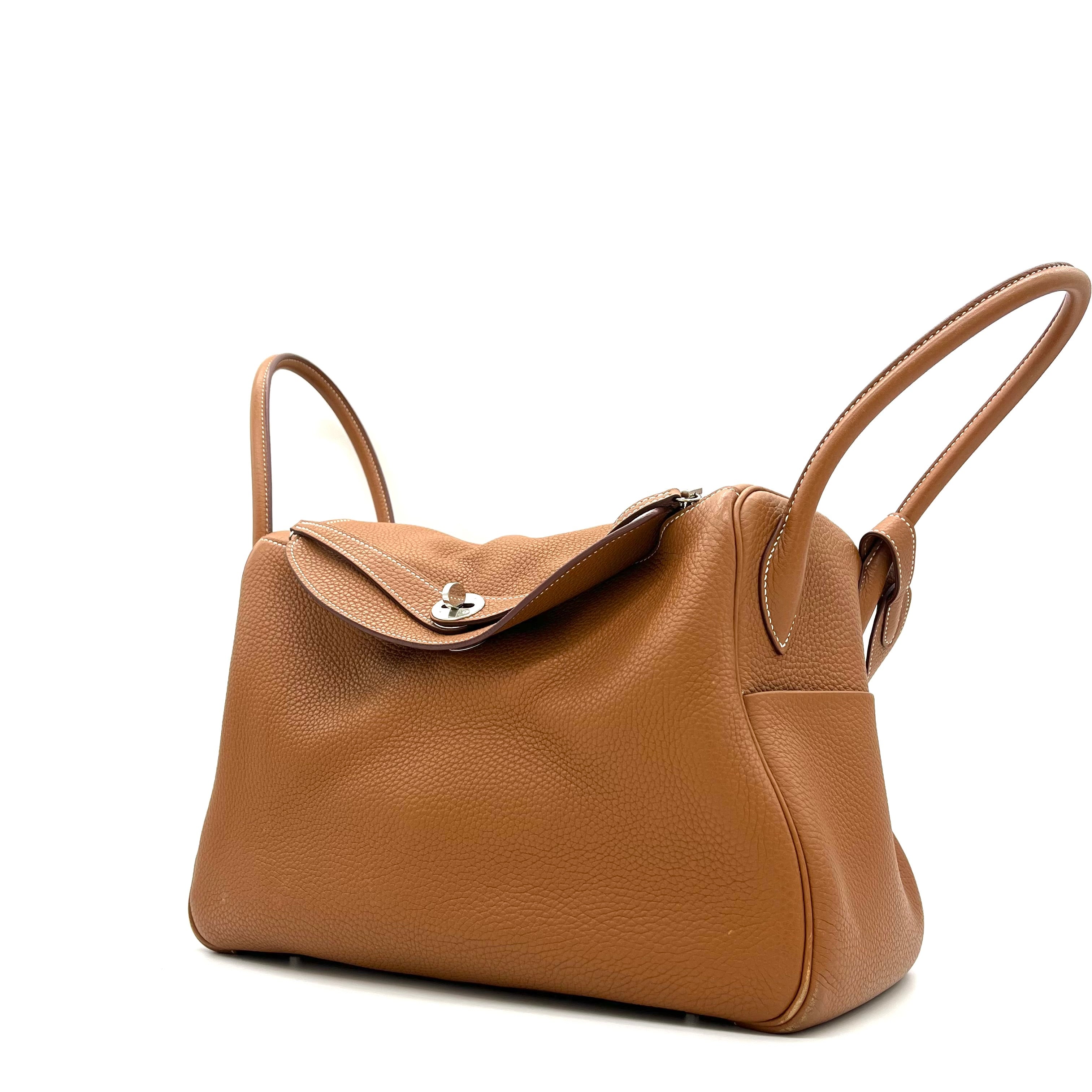 This is an authentic HERMES Taurillon Clemence Lindy 34 in Gold. This chic shoulder bag is crafted of luxurious calfskin leather with a distinctive grain in golden brown. This stylish bag features a leather shoulder strap linked to hoops of the signature leather, a crossover flap, a polished palladium silver turn lock and side patch pockets. This opens to a brown matte leather interior with side patch pockets.