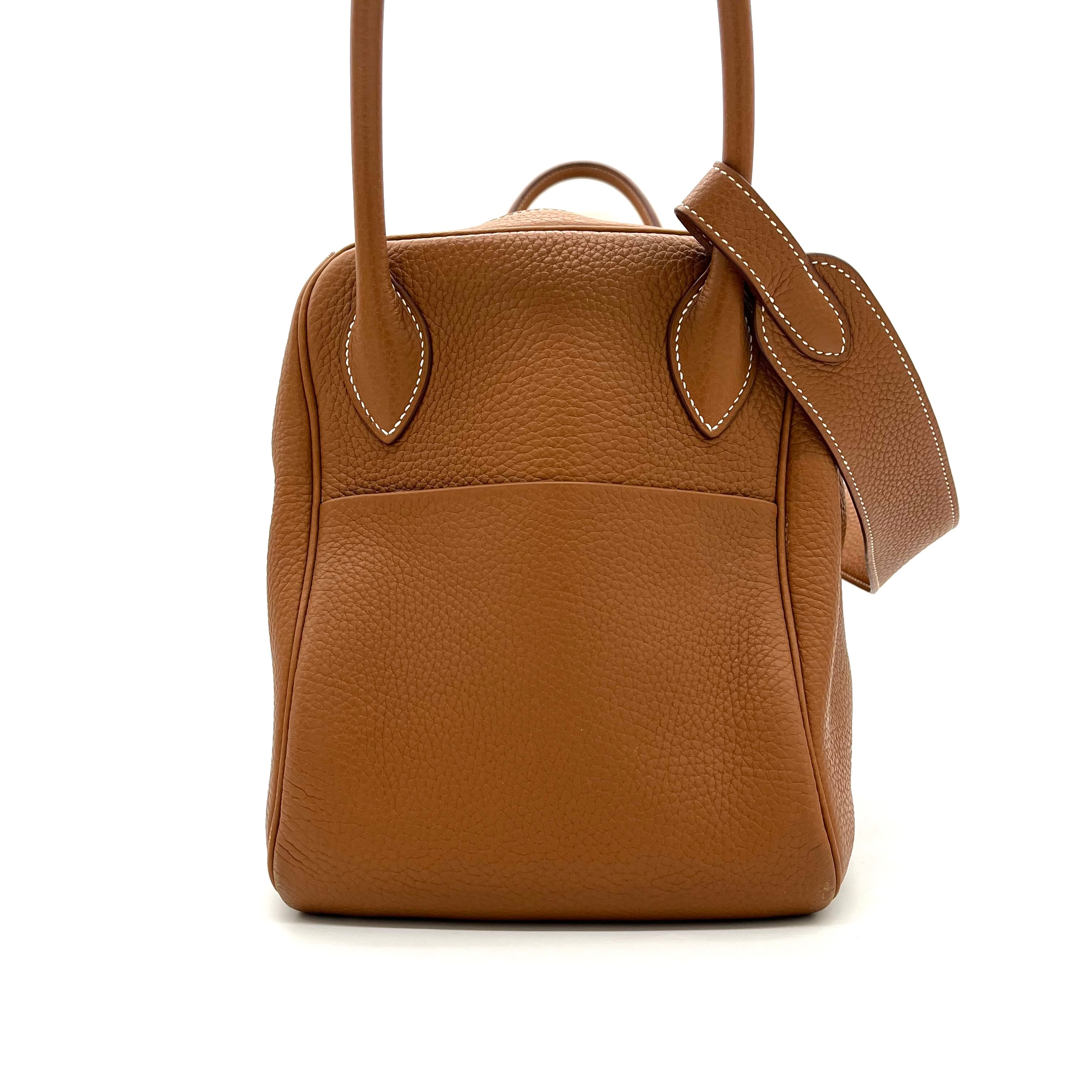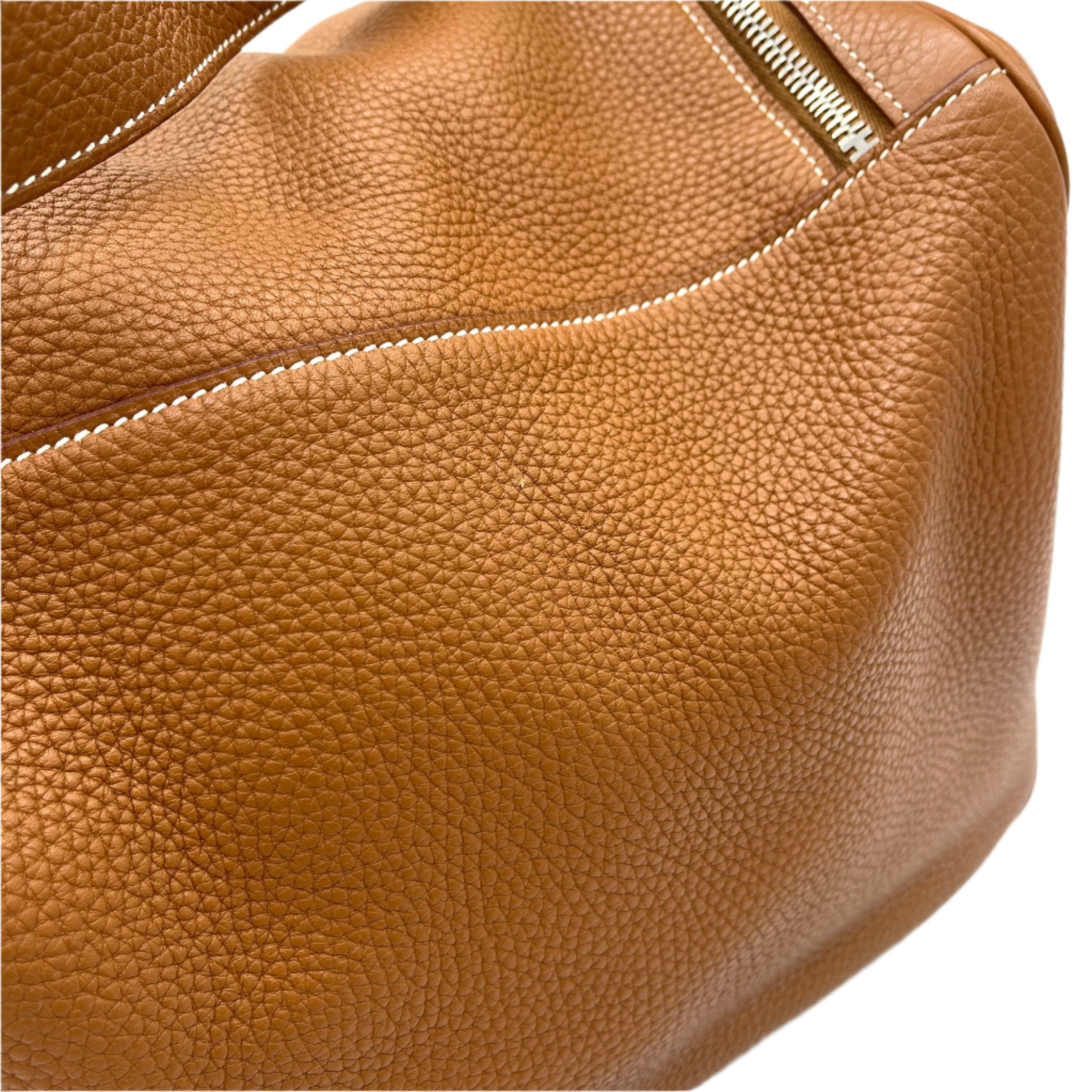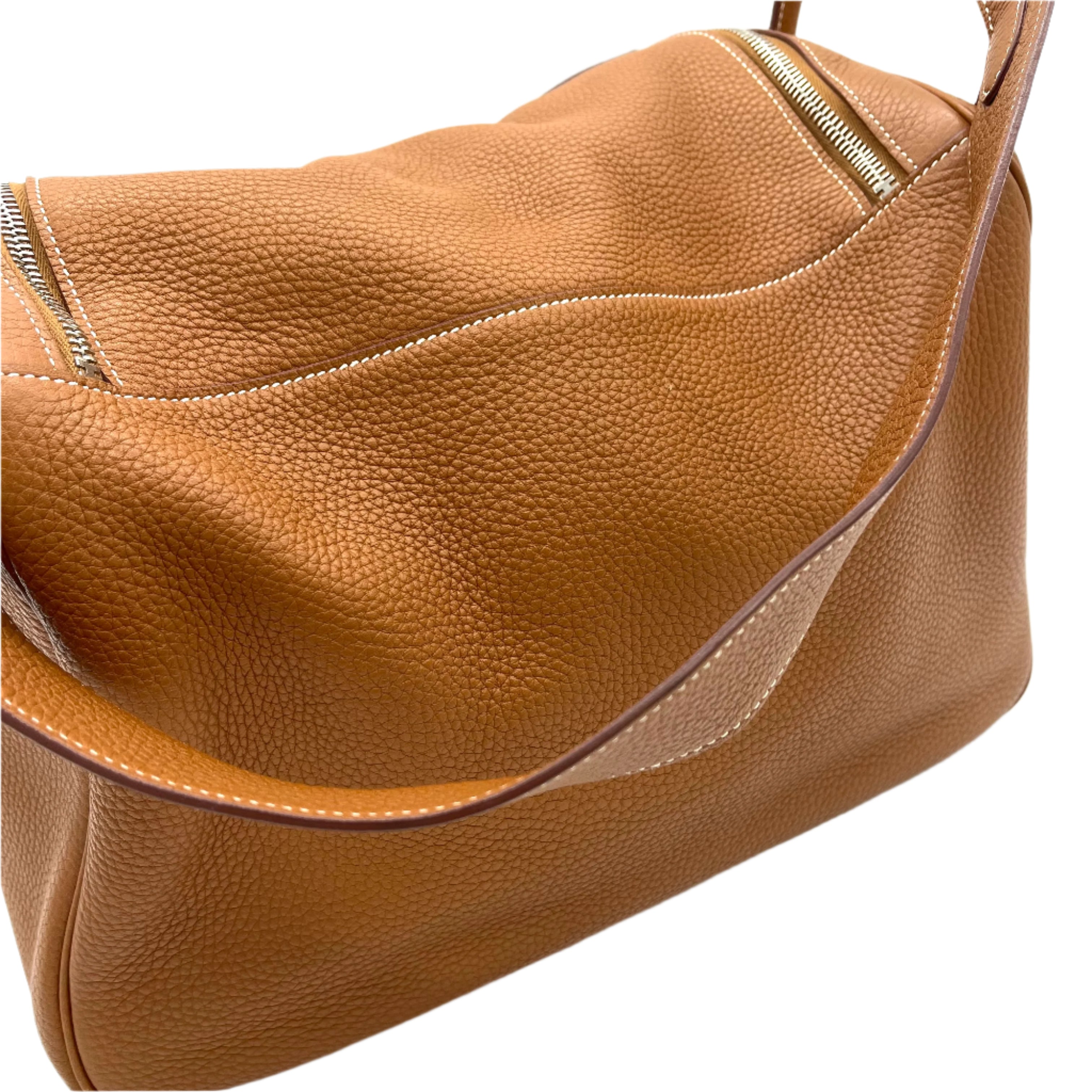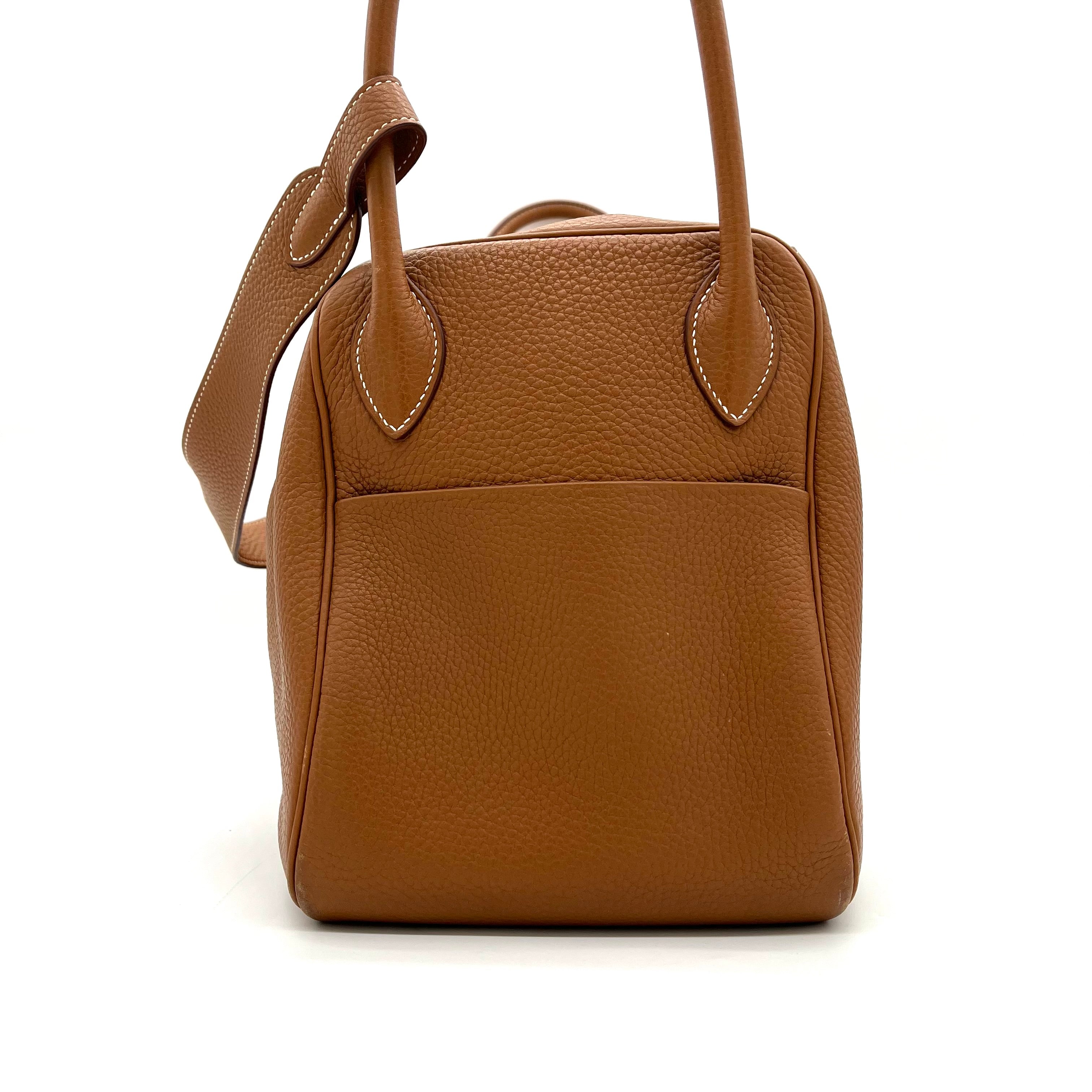 This is an authentic HERMES Taurillon Clemence Lindy 34 in Gold. This chic shoulder bag is crafted of luxurious calfskin leather with a distinctive grain in golden brown. This stylish bag features a leather shoulder strap linked to hoops of the signature leather, a crossover flap, a polished palladium silver turn lock and side patch pockets. This opens to a brown matte leather interior with side patch pockets.