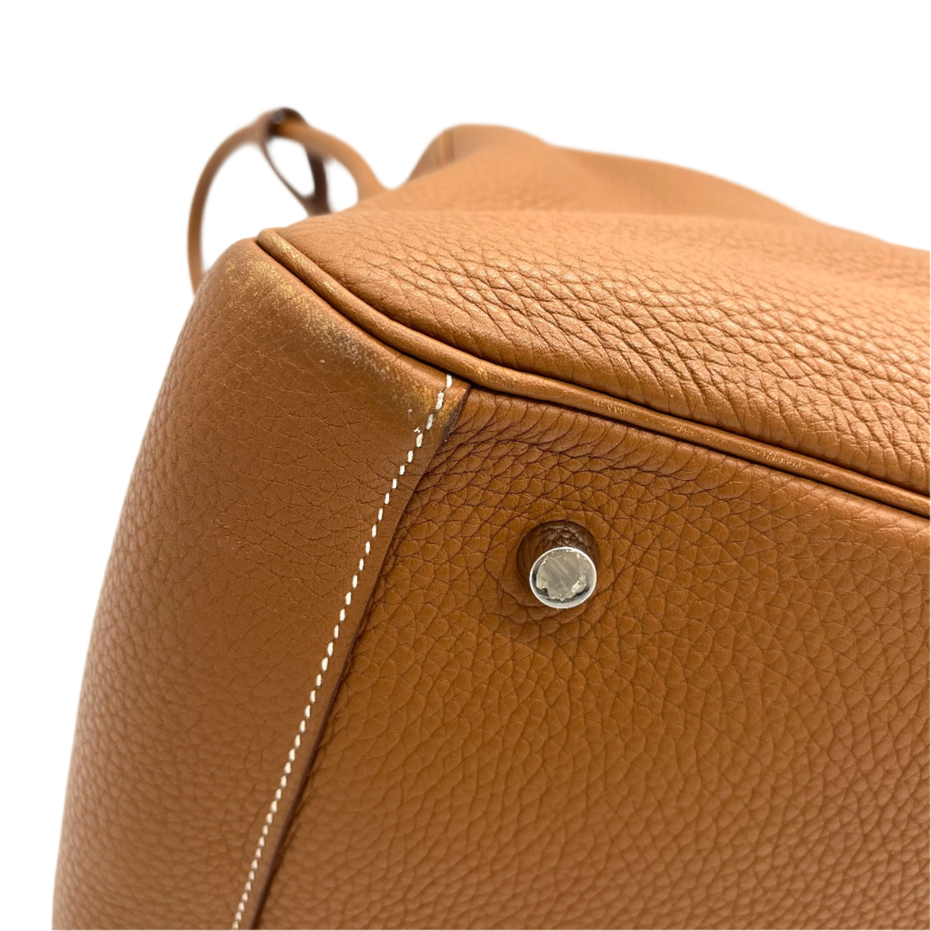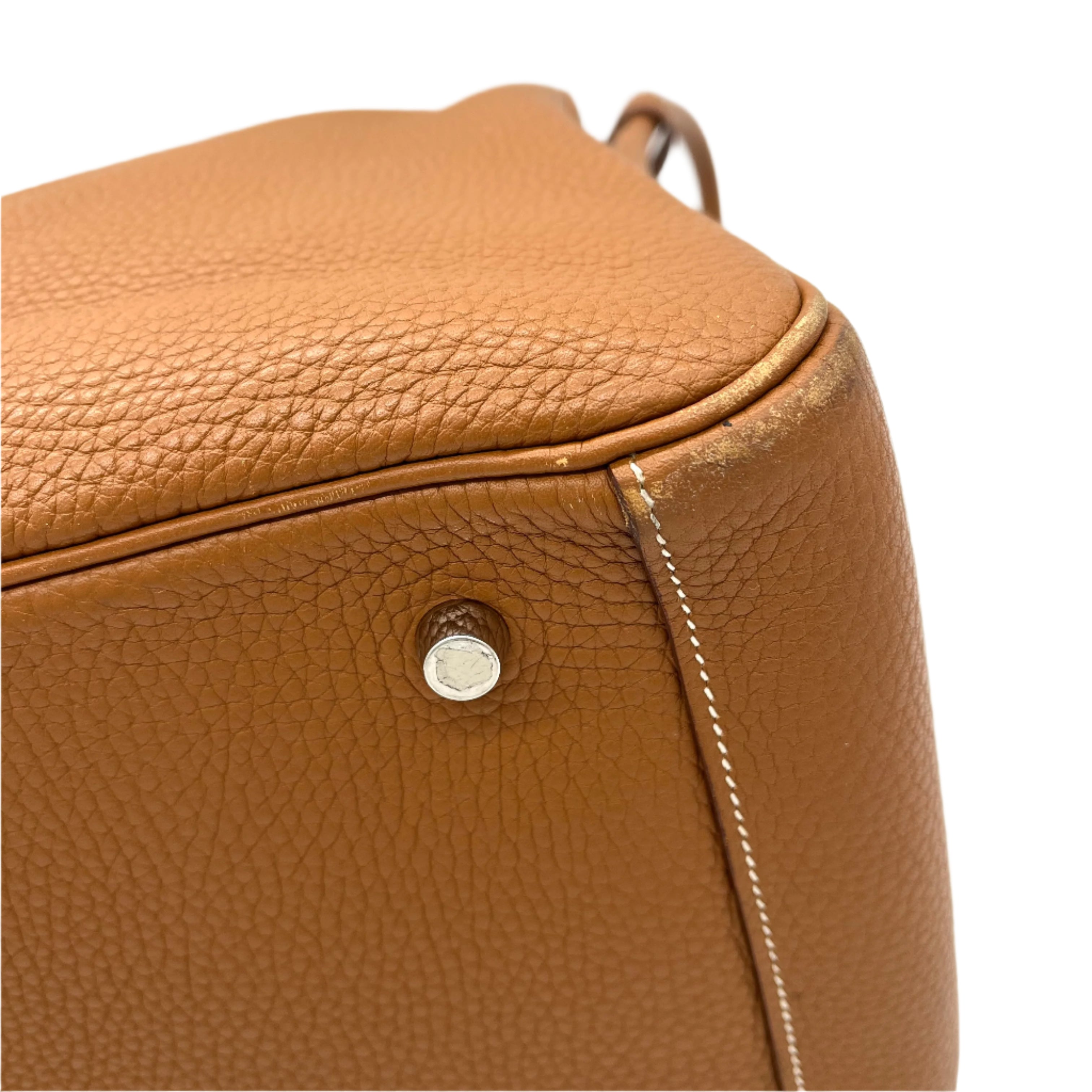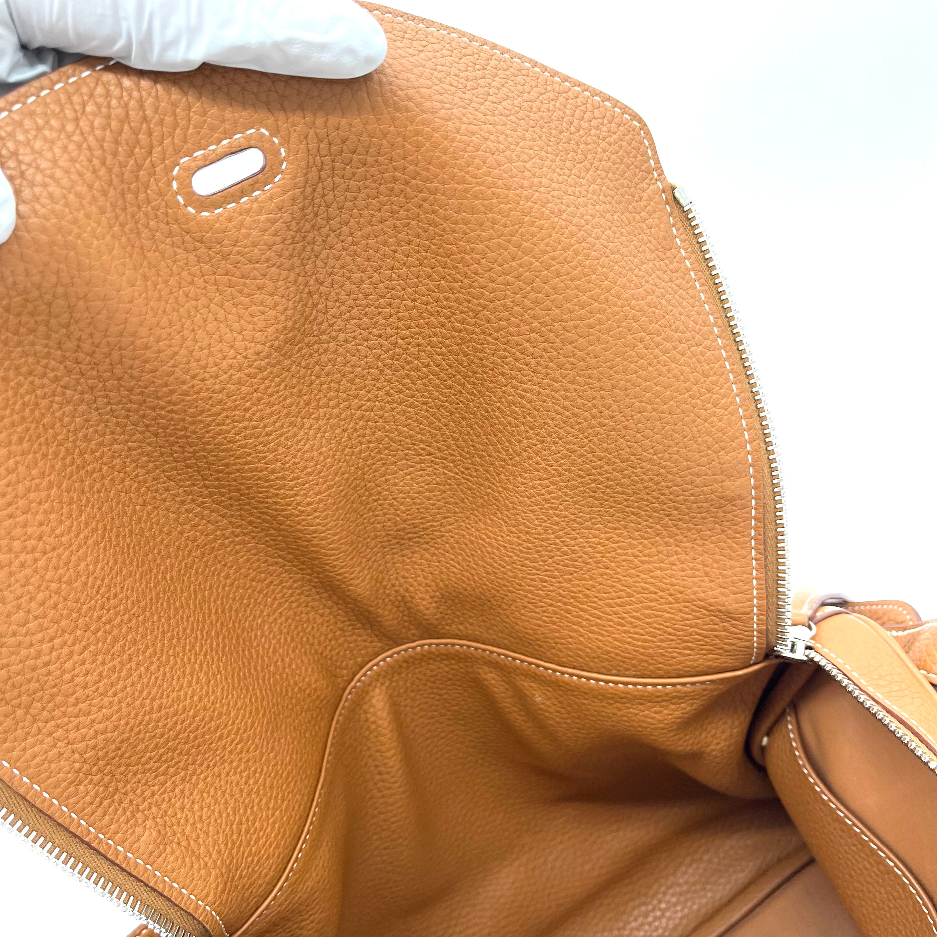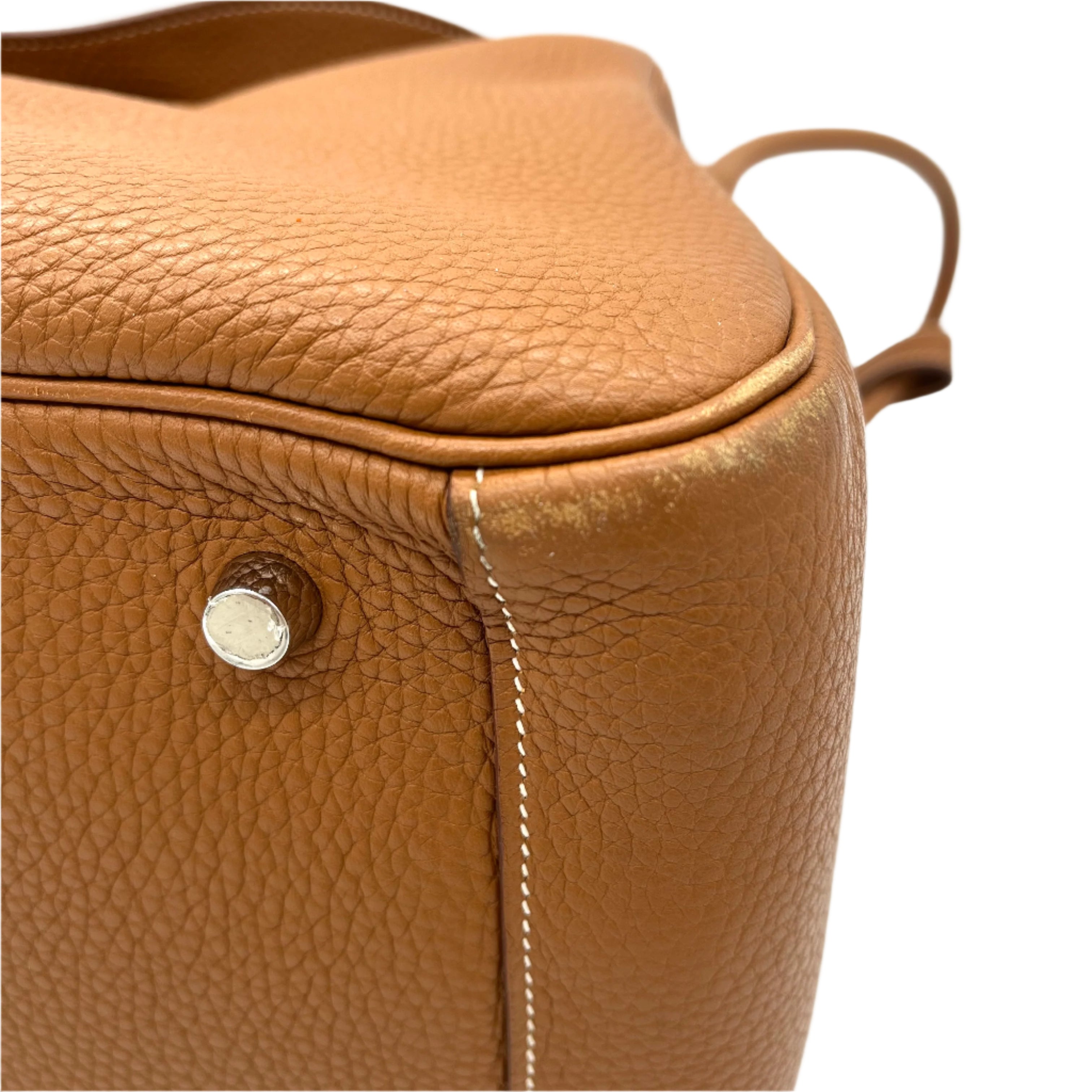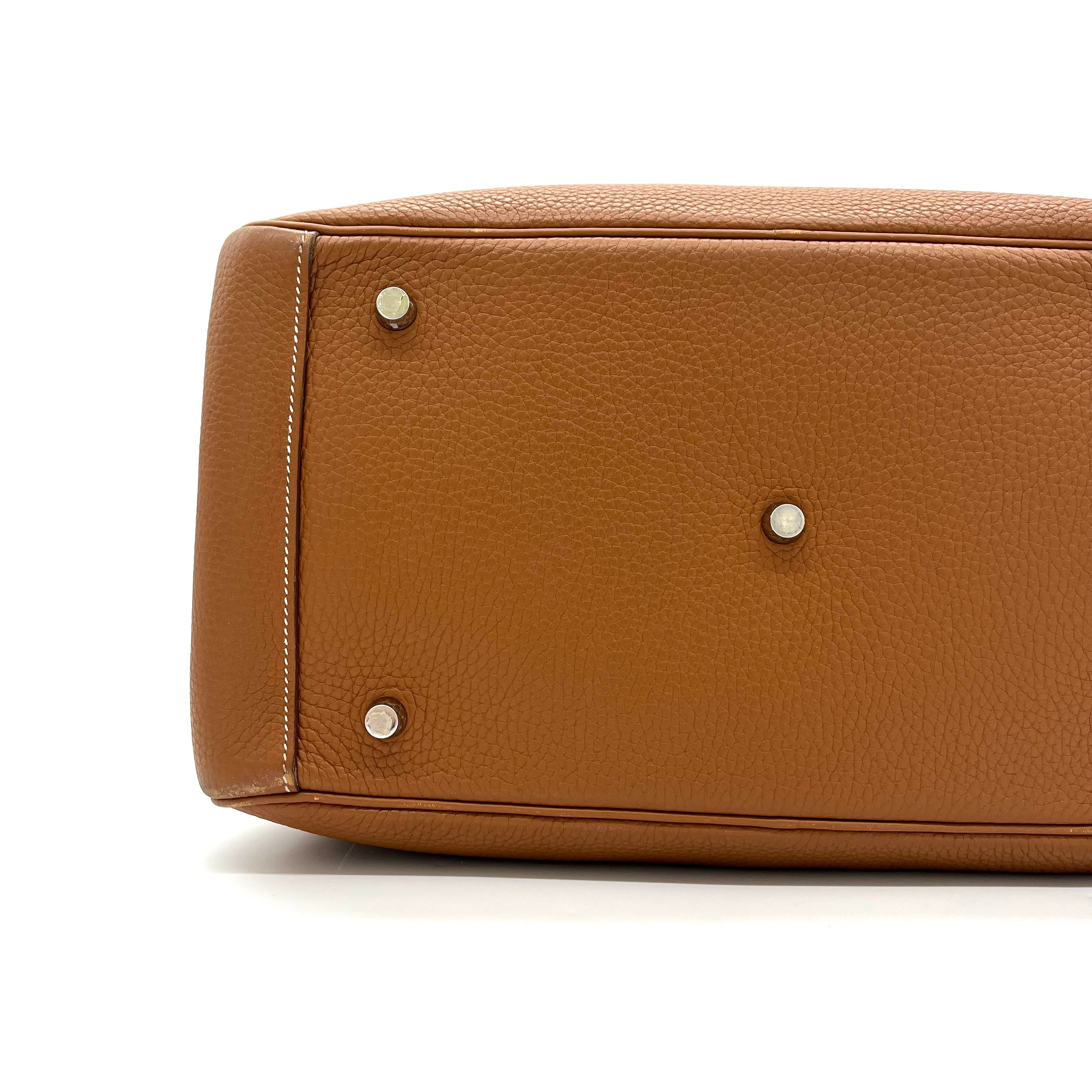 This is an authentic HERMES Taurillon Clemence Lindy 34 in Gold. This chic shoulder bag is crafted of luxurious calfskin leather with a distinctive grain in golden brown. This stylish bag features a leather shoulder strap linked to hoops of the signature leather, a crossover flap, a polished palladium silver turn lock and side patch pockets. This opens to a brown matte leather interior with side patch pockets.