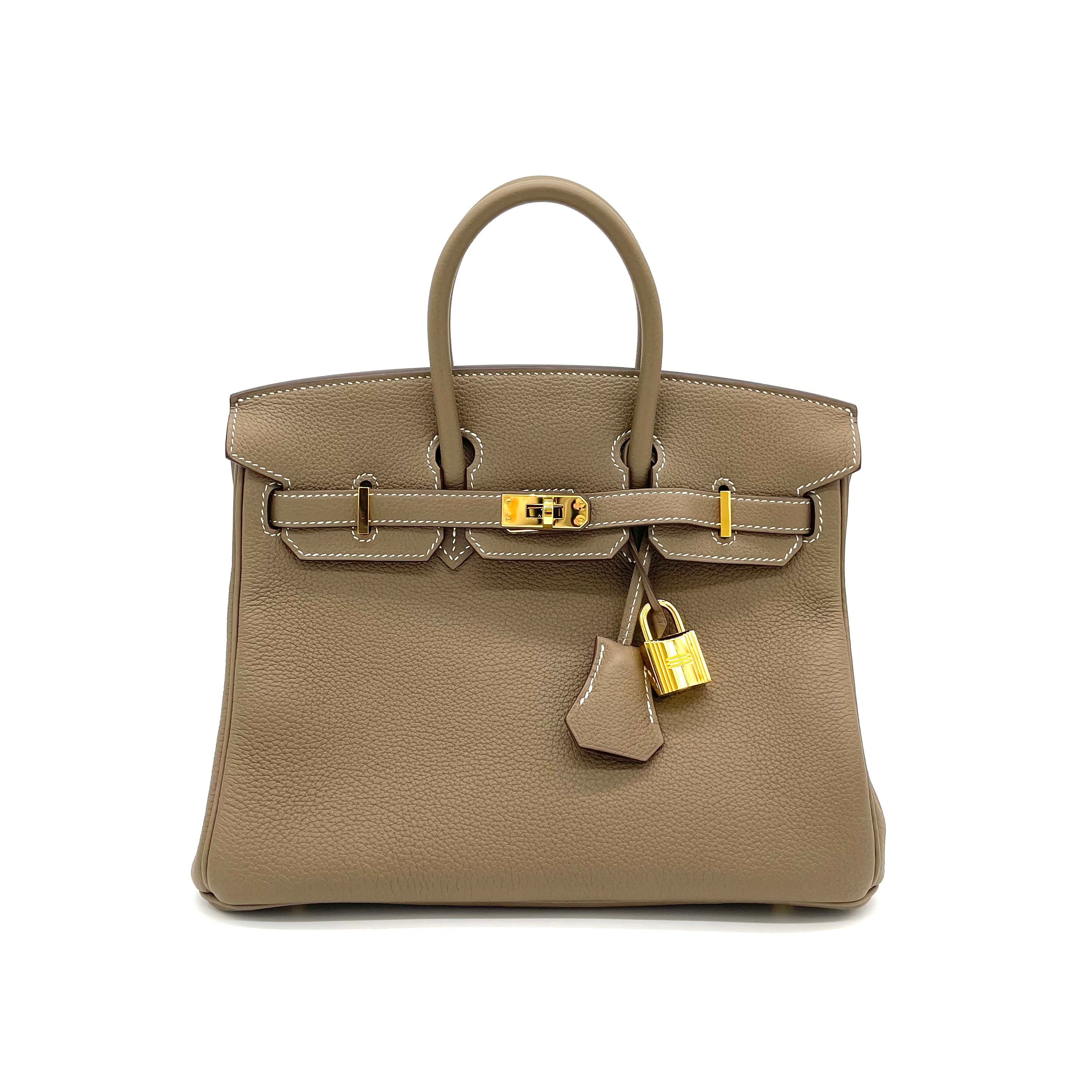 This is an authentic HERMES Togo Birkin 25 in Etoupe. This iconic handbag is hand-crafted of togo leather in taupe with white contrast stitching. The bag features rolled leather top handles, a short flap, and a cinch-style strap closure with gold plated links secured by a signature turn lock and optional padlock. The flap opens to a matching matte chevre goatskin leather interior with zipper and patch pockets.