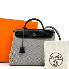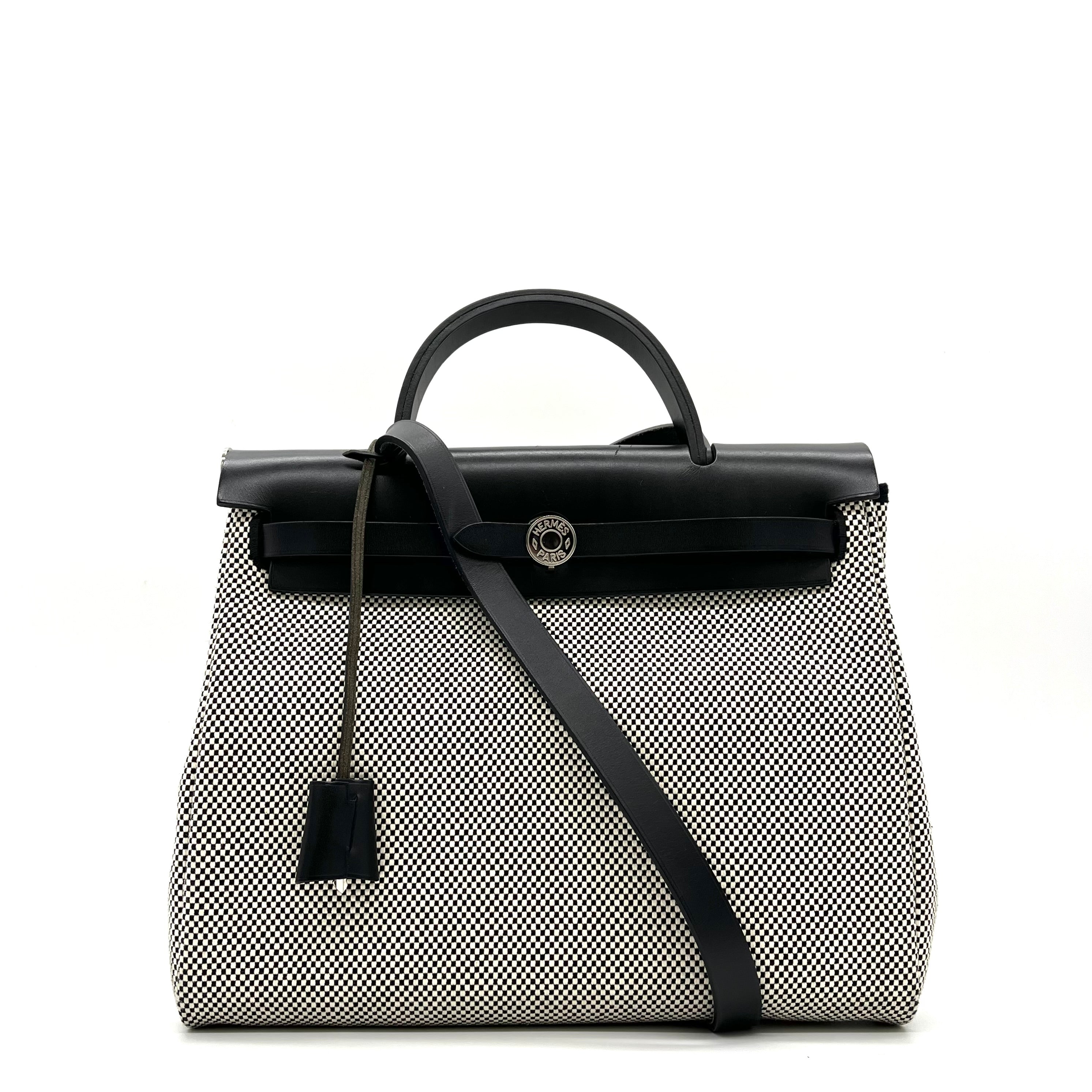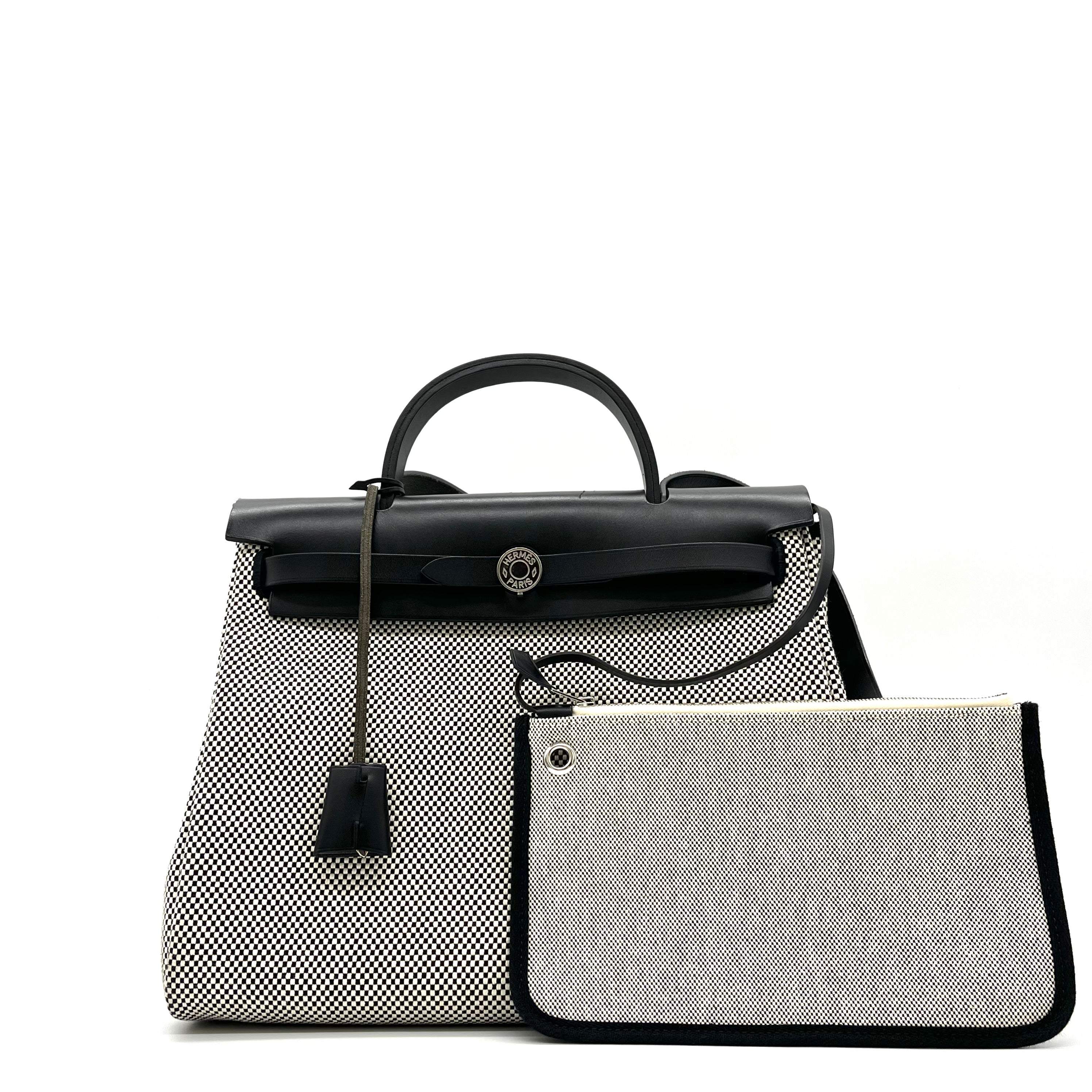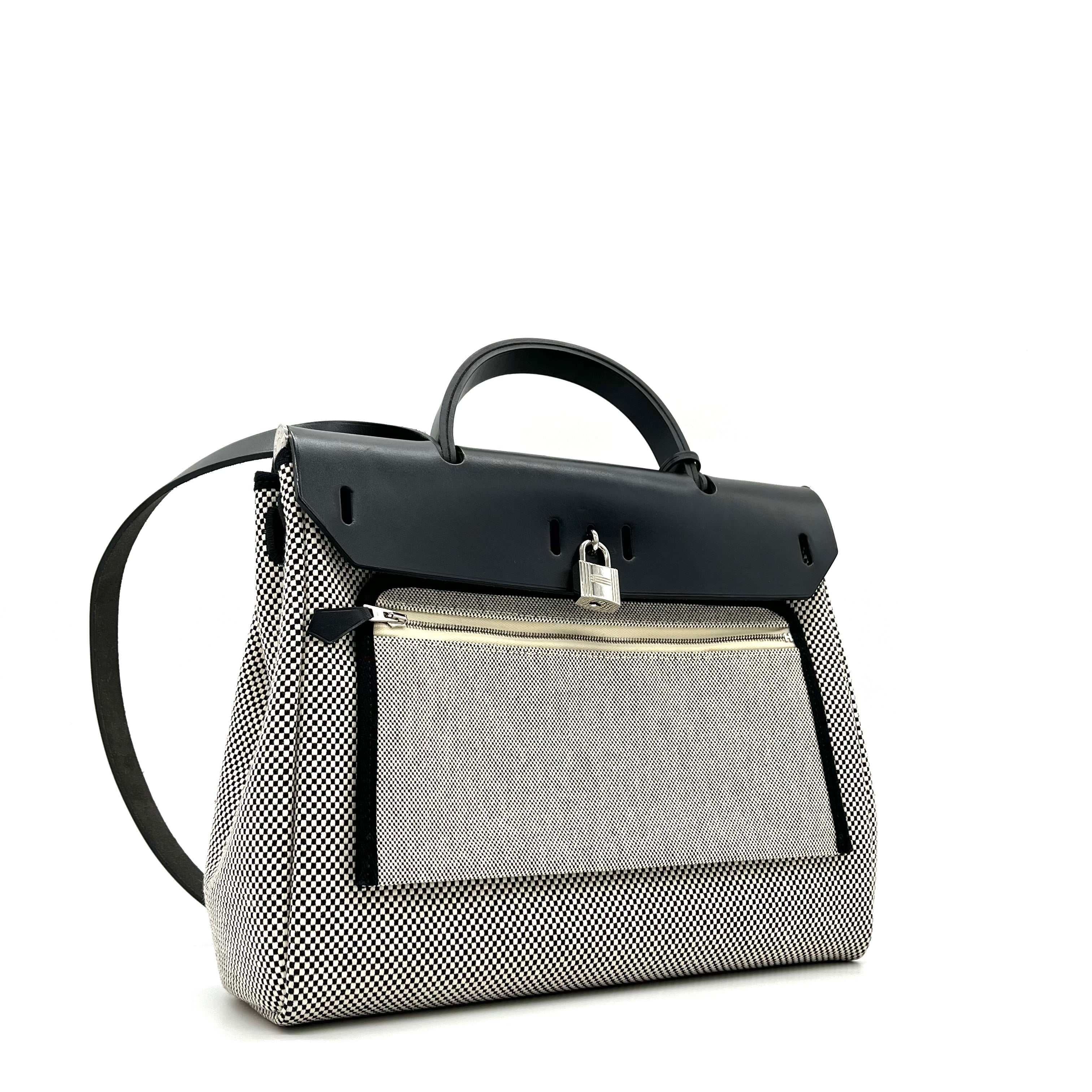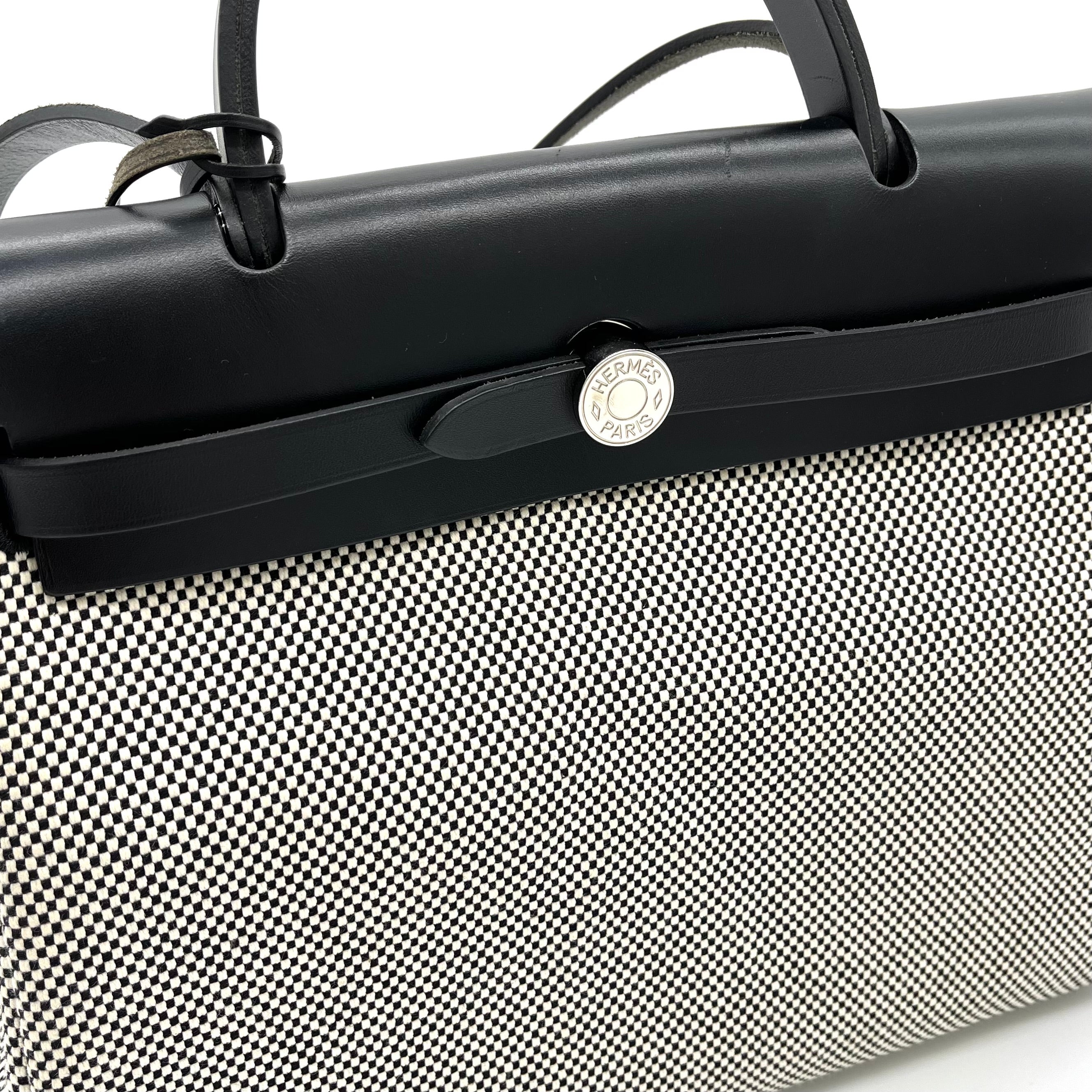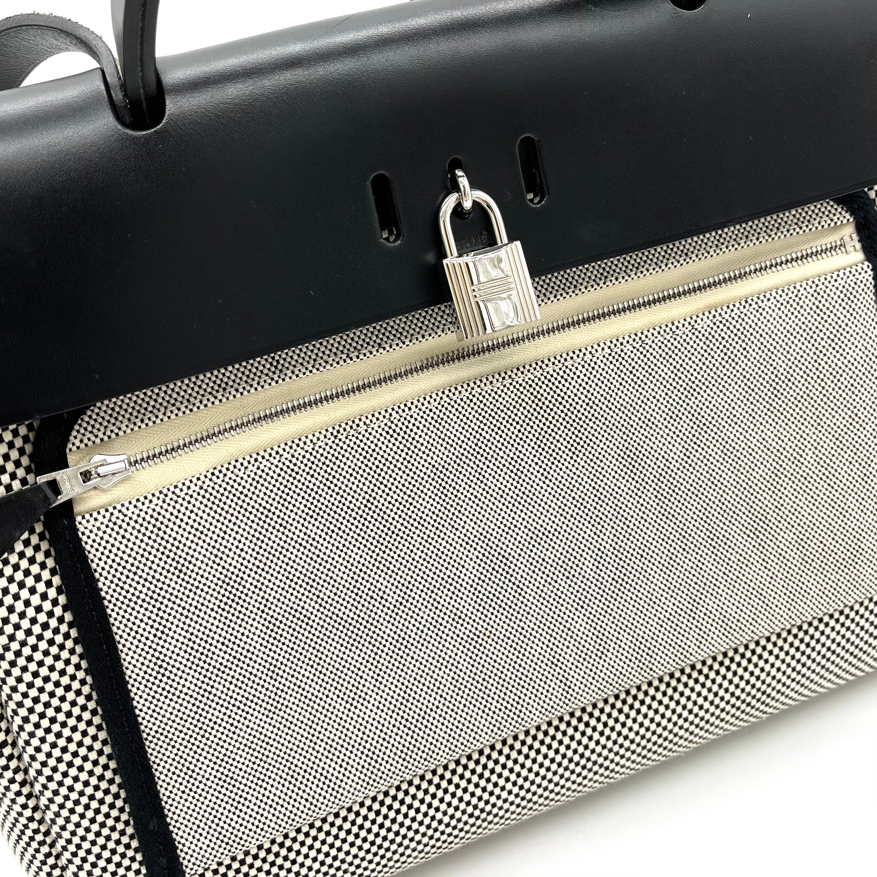This is an authentic HERMES Vache Hunter Criss Viking Herbag Zip Retourne 31 PM in Ecru and Black. This stylish tote is crafted of sturdy toile canvas in small black and white squares. The handbag features a rear exterior zip pocket, a black leather top crest with a leather top handle, shoulder strap, and strap closure with palladium hardware with a padlock. This opens to a toile canvas interior.