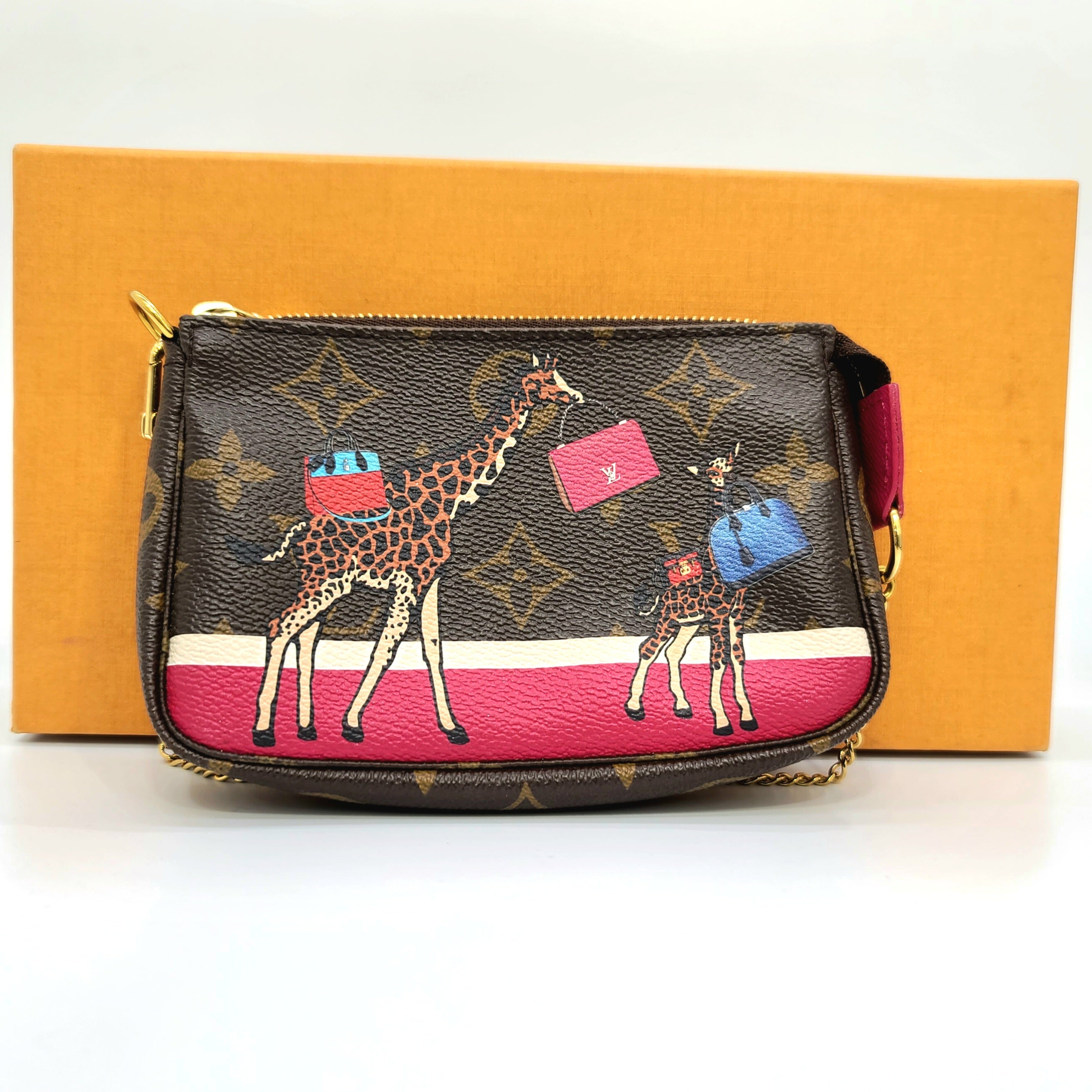 세상에, 한정판 루이 비통 미니 포셰트 액세서리의 귀여움에 푹 빠졌어요! 골드 하드웨어와 자홍색 가죽 트리밍이 돋보이는 브라운 모노그램 캔버스로 제작되었으며, 앞면에 LV 백을 들고 있는 세련된 엄마와 그녀의 작은 송아지 두 마리의 기린이 프린트되어 있습니다. 지퍼를 열면 브라운 패브릭 안감의 포켓 없는 내부가 나옵니다. 체인 스트랩의 드롭 길이는 5.75인치이며 한쪽 끝을 분리하여 더 큰 가방에 걸거나 내부에 넣어 손으로 들고 다닐 수 있습니다. 한 번도 착용하지 않은 새 제품이며 더스트백과 상자가 함께 제공됩니다. 특징을 더하자면, 이 작은 귀여운 아이는 2017 크리스마스 애니메이션 컬렉션에 속합니다!