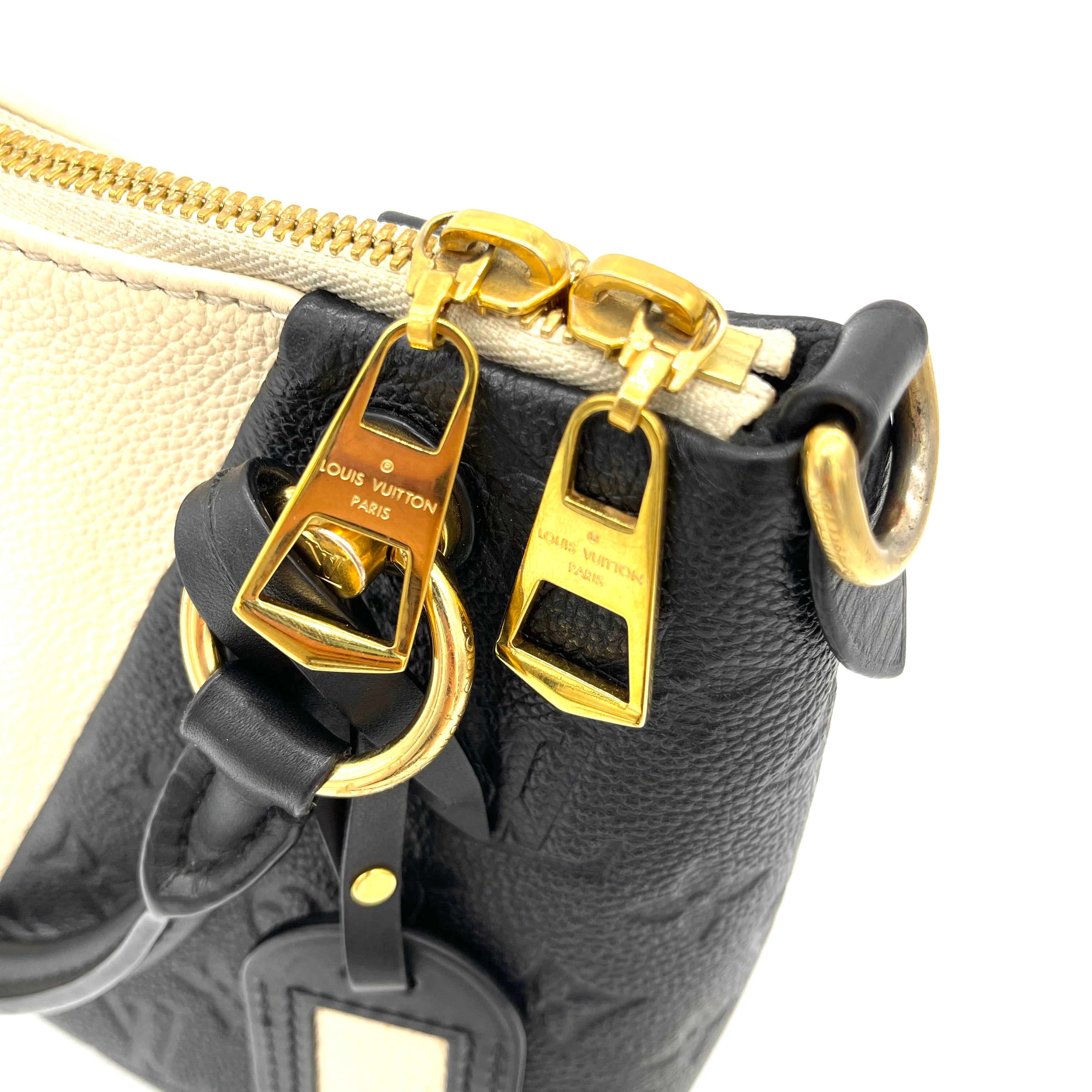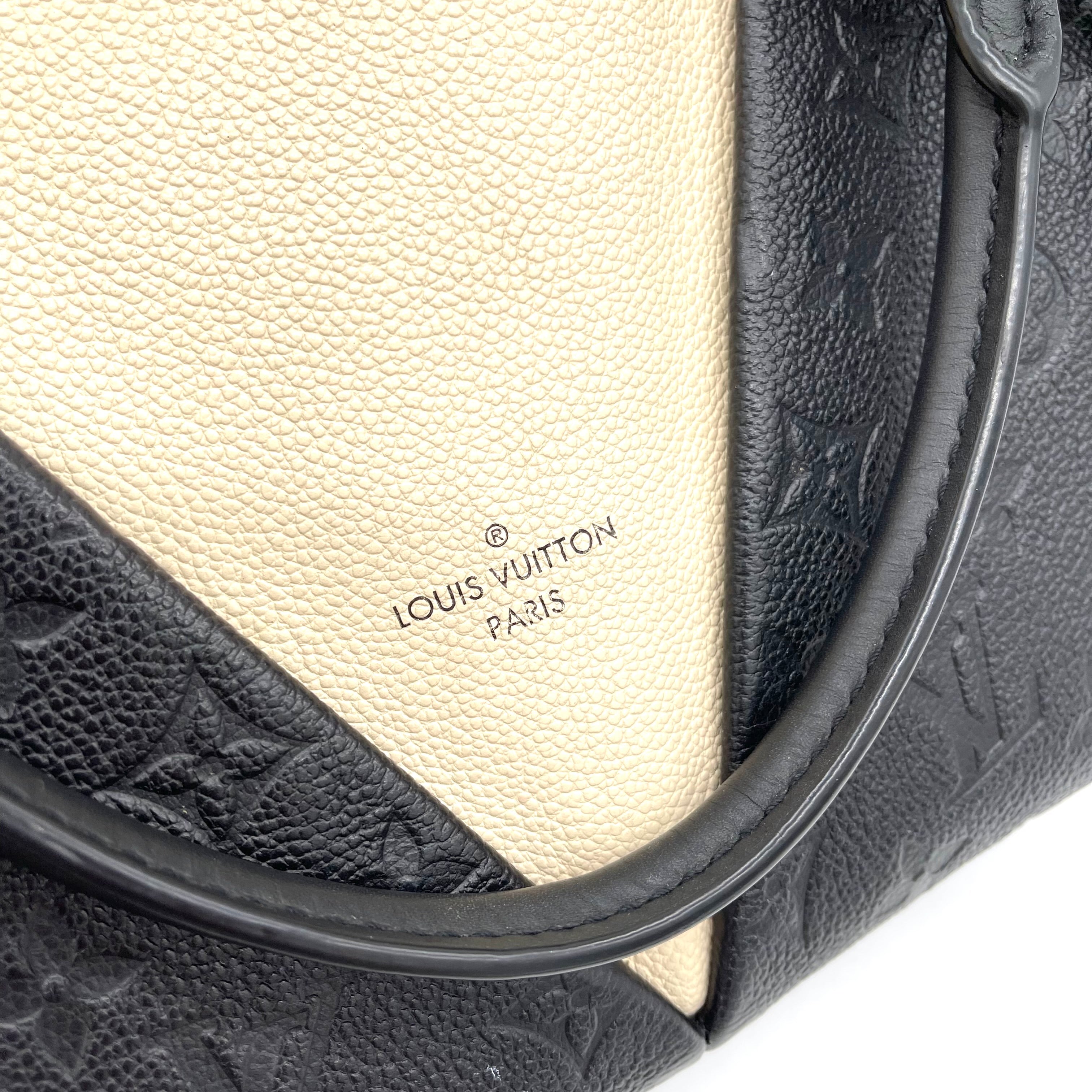 This is an authentic LOUIS VUITTON Empreinte V Tote BB in Black and Creme. This shoulder bag is crafted of soft calfskin leather with embossed Louis Vuitton monogram in black with beige leather accents on the front and back. The bag features black rolled leather handles, an optional shoulder strap with gold hardware, and a top zipper that opens to a black microfiber interior with patch pockets.