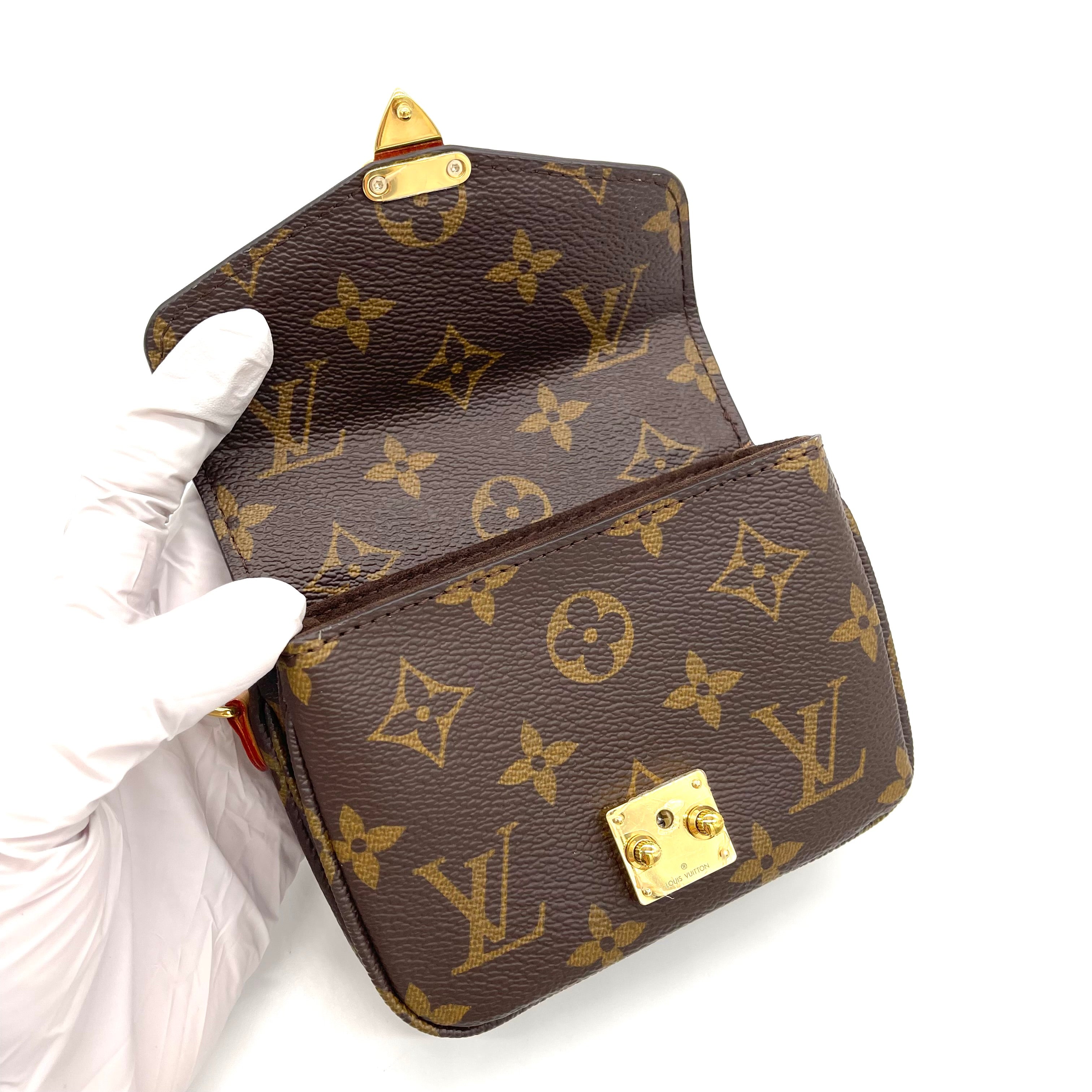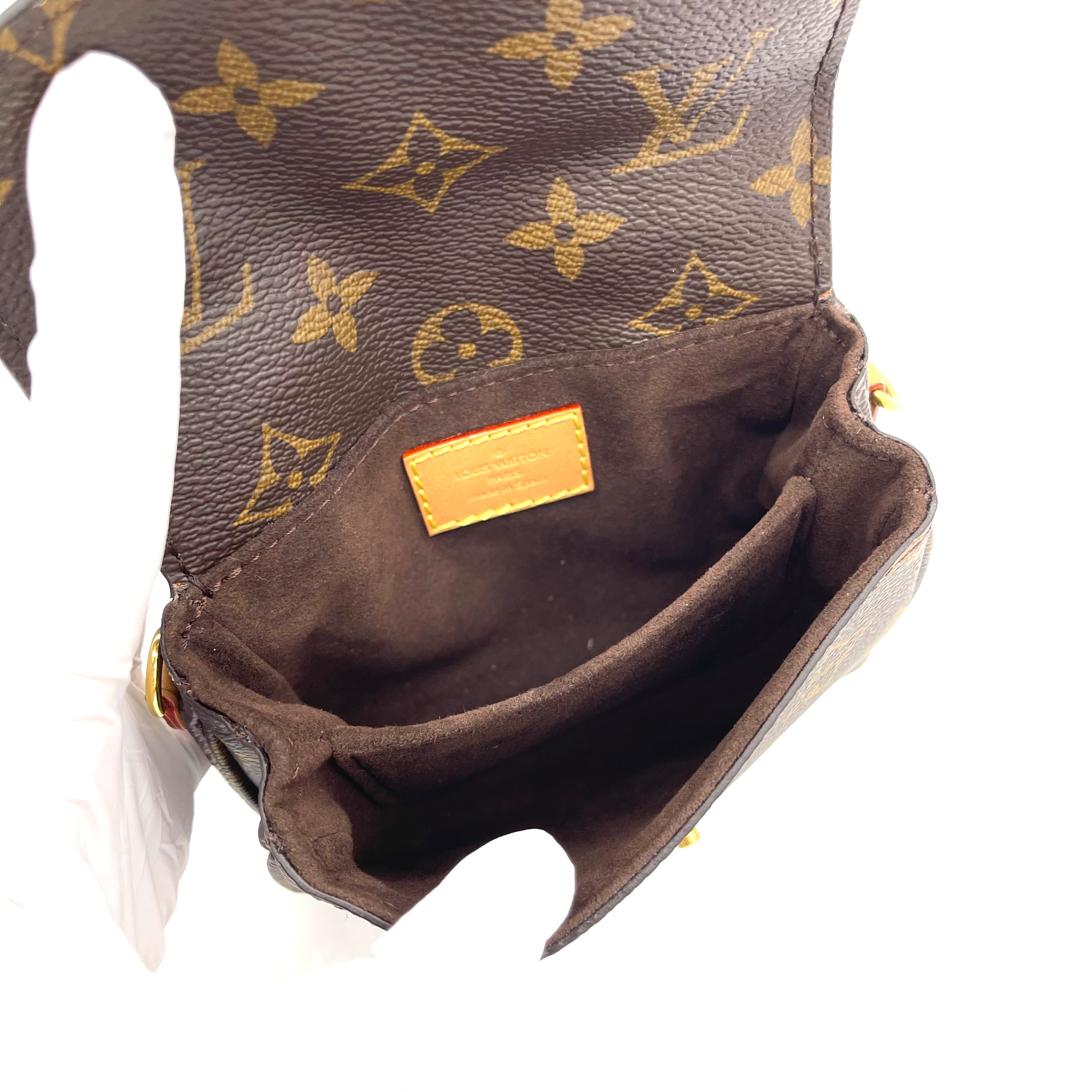 The Micro Métis in Monogram canvas is a miniature replica of the iconic Pochette Métis bag. This mini-satchel features carefully crafted details, notably a handle in Louis Vuitton's emblematic natural leather and an S-lock clasp inspired by the historic trunks. With its removable, gold-tone chain, it is a fashionable way to carry essentials for day or night.