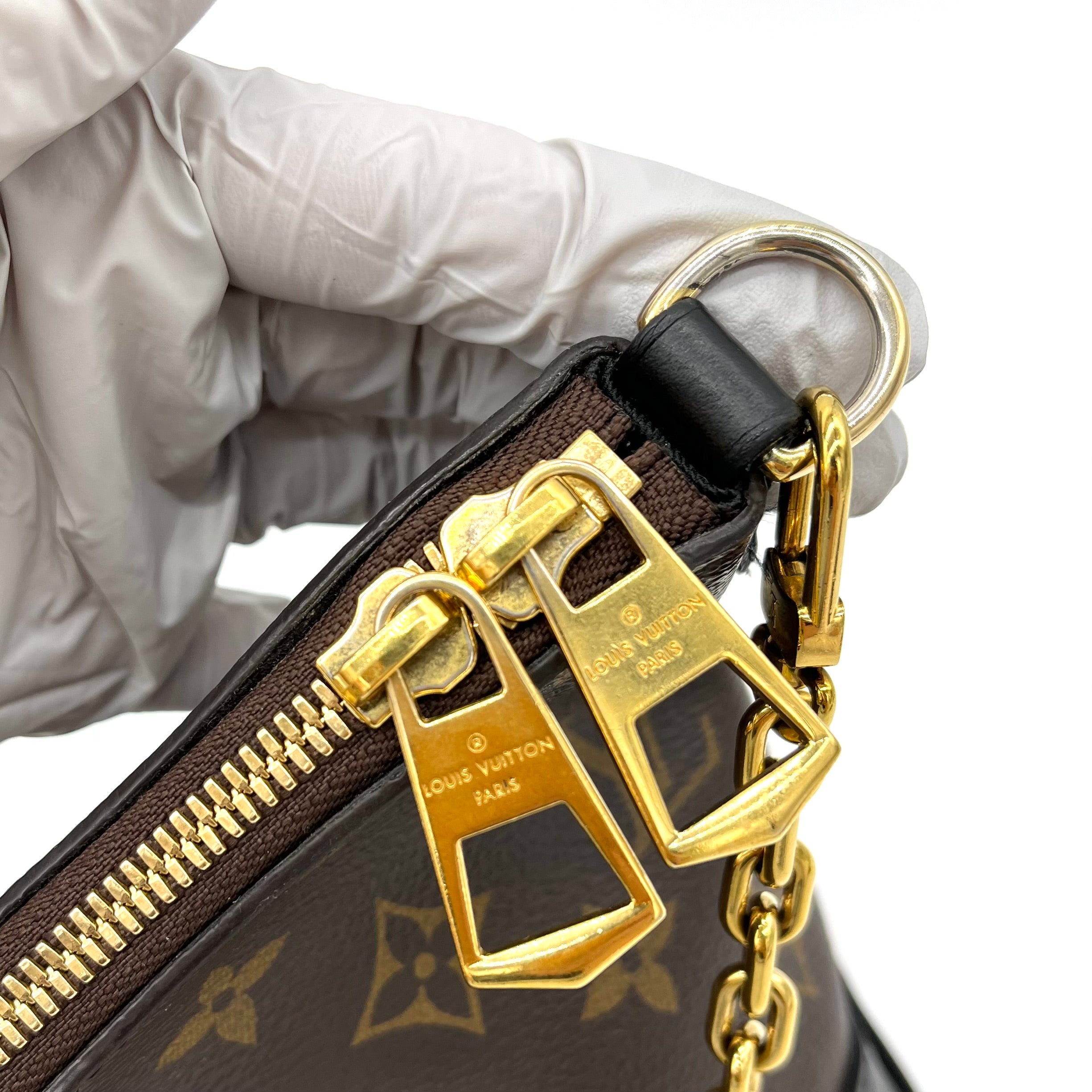 This is an authentic LOUIS VUITTON Monogram Boulogne NM in Black. This chic bag is crafted of Louis Vuitton monogram coated canvas with black leather trim. The bag features polished gold hardware, an adjustable leather shoulder strap, and an optional gold chain strap. The top zippers open to a black interior with a patch pocket.