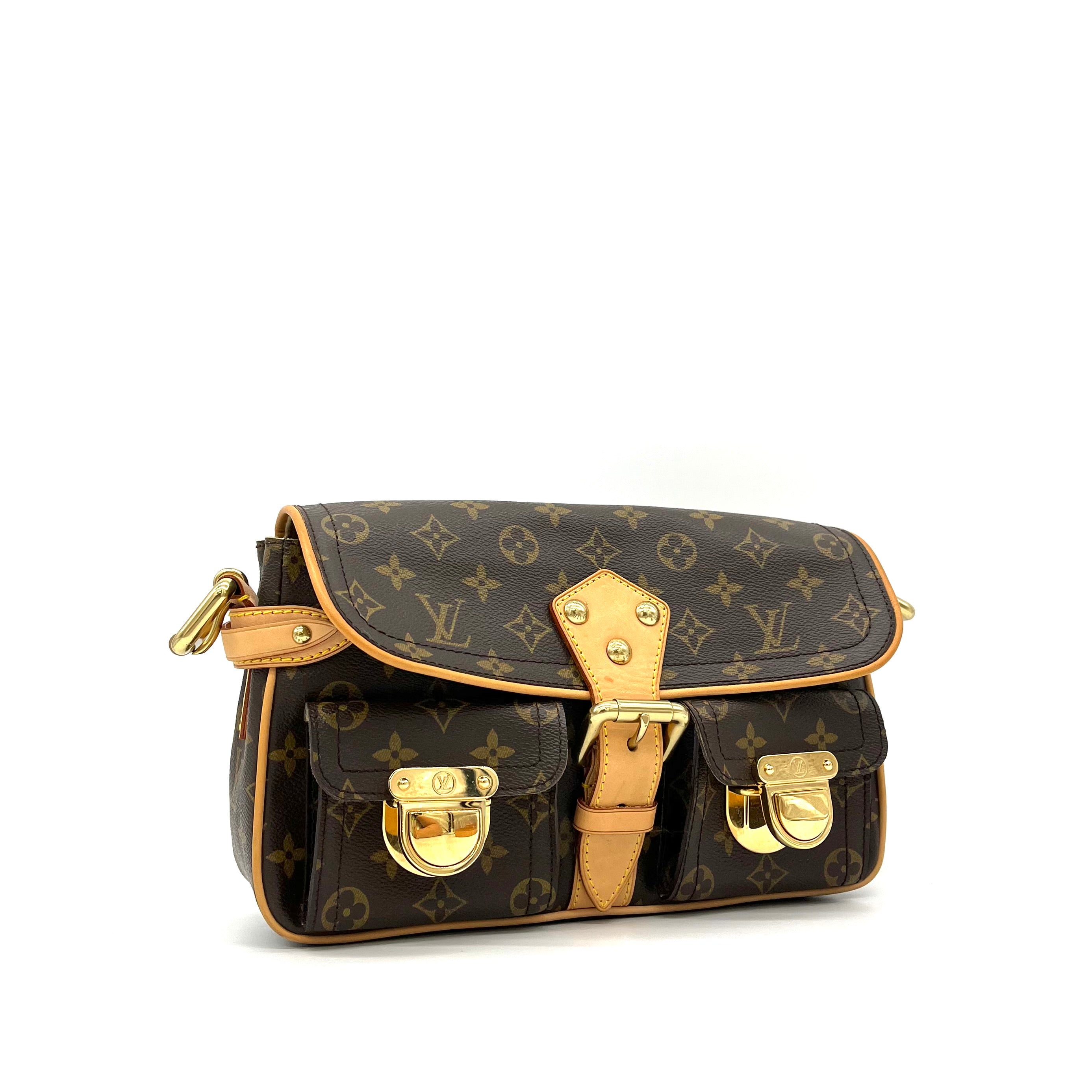 This is an authentic LOUIS VUITTON Monogram Hudson PM. This is a stylish shoulder bag that is finely crafted of classic Louis Vuitton monogram on toile canvas. The bag features vachetta cowhide trim with an adjustable leather shoulder strap, two front external pockets, a front flap with a buckle strap closure and polished gold hardware. This opens to an ivory alcantara microfiber interior with a patch pocket.
