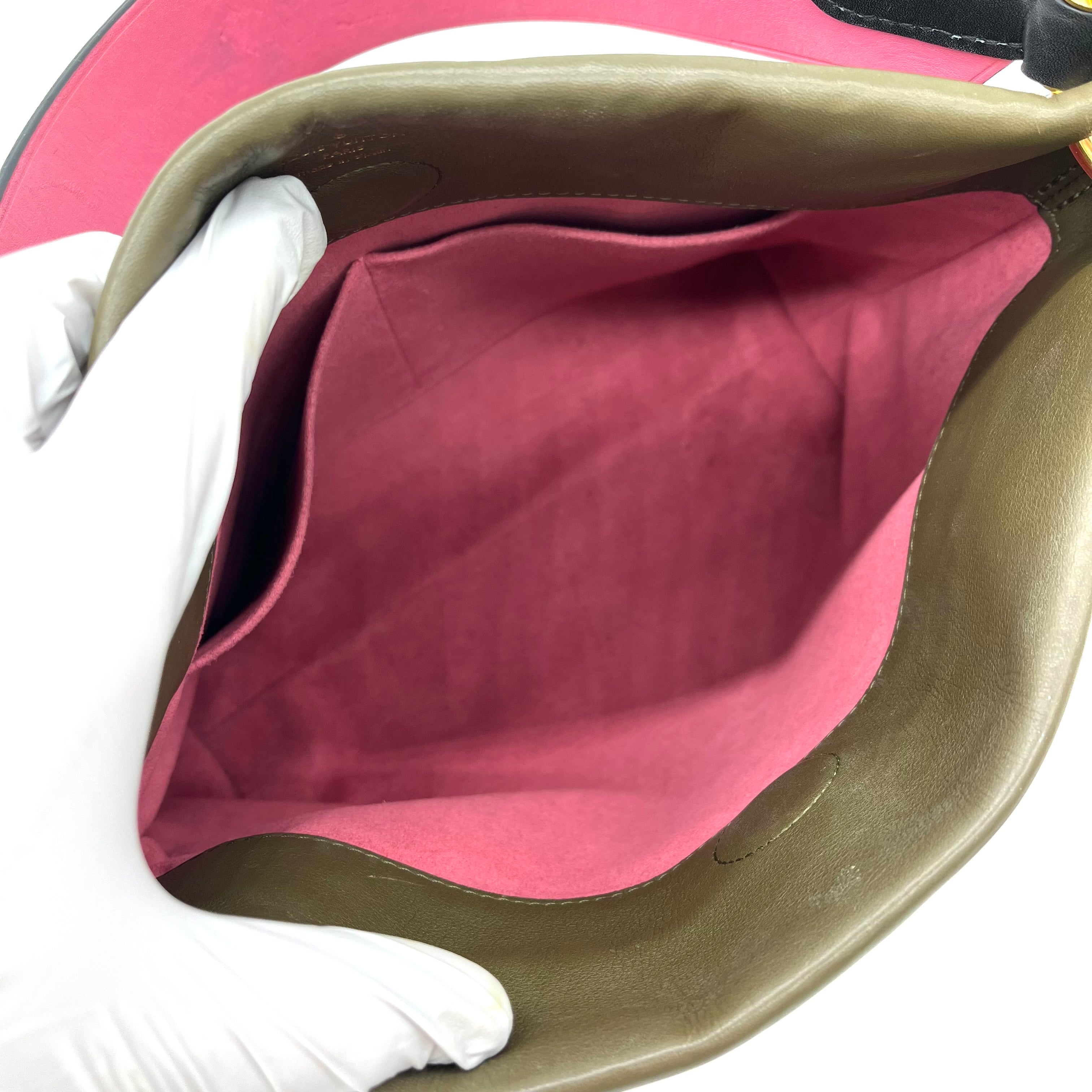 This is an authentic LOUIS VUITTON Monogram Tuileries Besace in Khaki. This handbag is crafted of Louis Vuitton monogram on toile coated canvas with olive green leather accents. This bag features a leather top handle, an optional shoulder strap and gold hardware. The top opens to a pink microfiber interior with a patch pockets. This is an excellent bag for day or night, from Louis Vuitton!