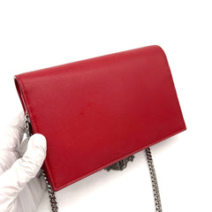 정품 생 로랑 스몰 클래식 모노그램 레드 컬러의 케이트 태슬 사첼입니다. 이 세련된 가방은 빨간색 질감의 가죽 으로 제작되었습니다. 이 백은 허리까지 내려오는 실버 비주 체인 숄더 스트랩과 실버 YSL 로고가 있는 앞면 플랩과 미니어처 실버 체인으로 장식된 태슬 펜던트가 특징입니다.