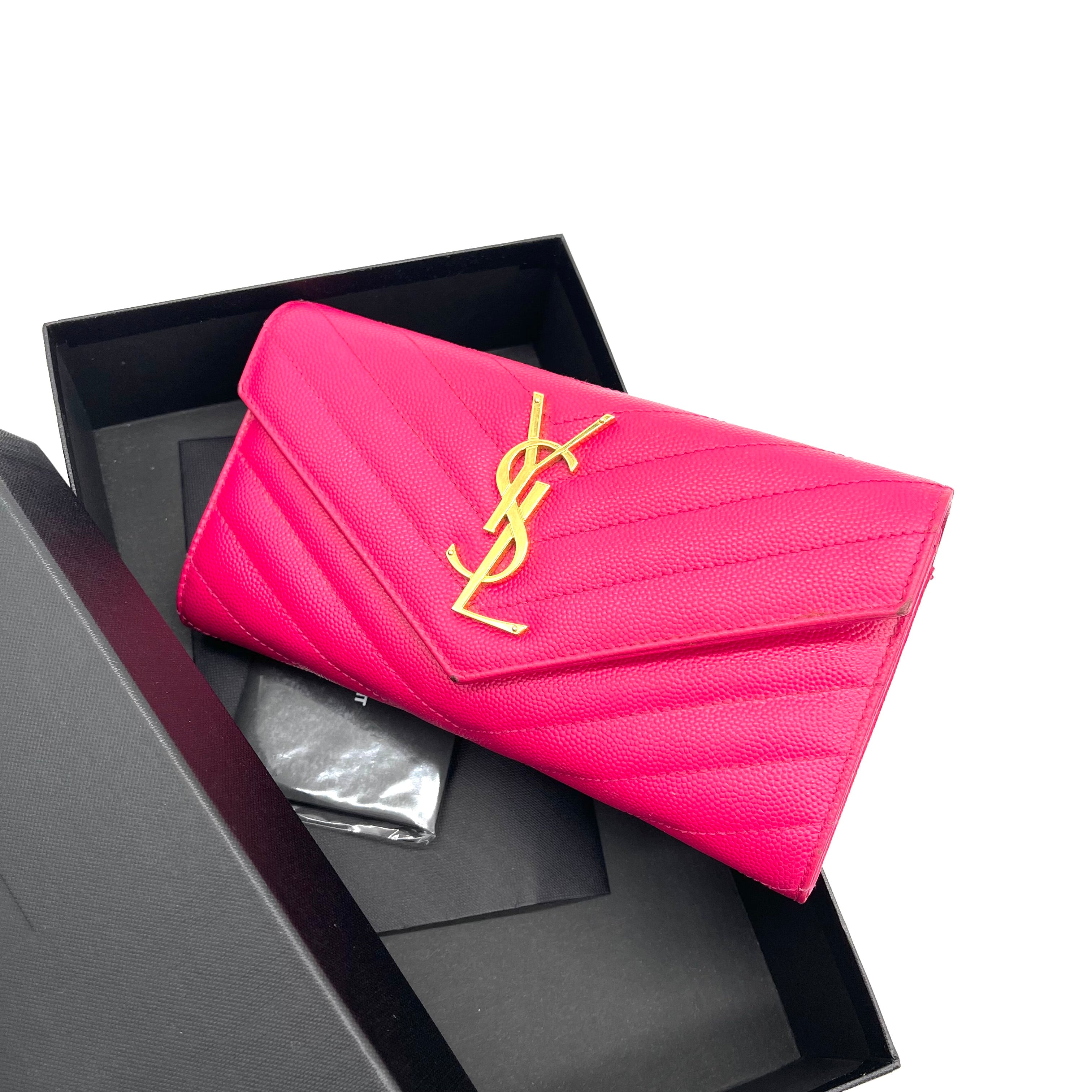 This is an authentic SAINT LAURENT Grain De Poudre Matelasse Chevron Monogram Flap Wallet in Pink. This wallet is crafted of textured chevron-quilted leather in pink with a classic gold YSL logo on the front. The wallet opens to a partitioned pink leather interior with card slots, patch pockets and a zipper compartment.