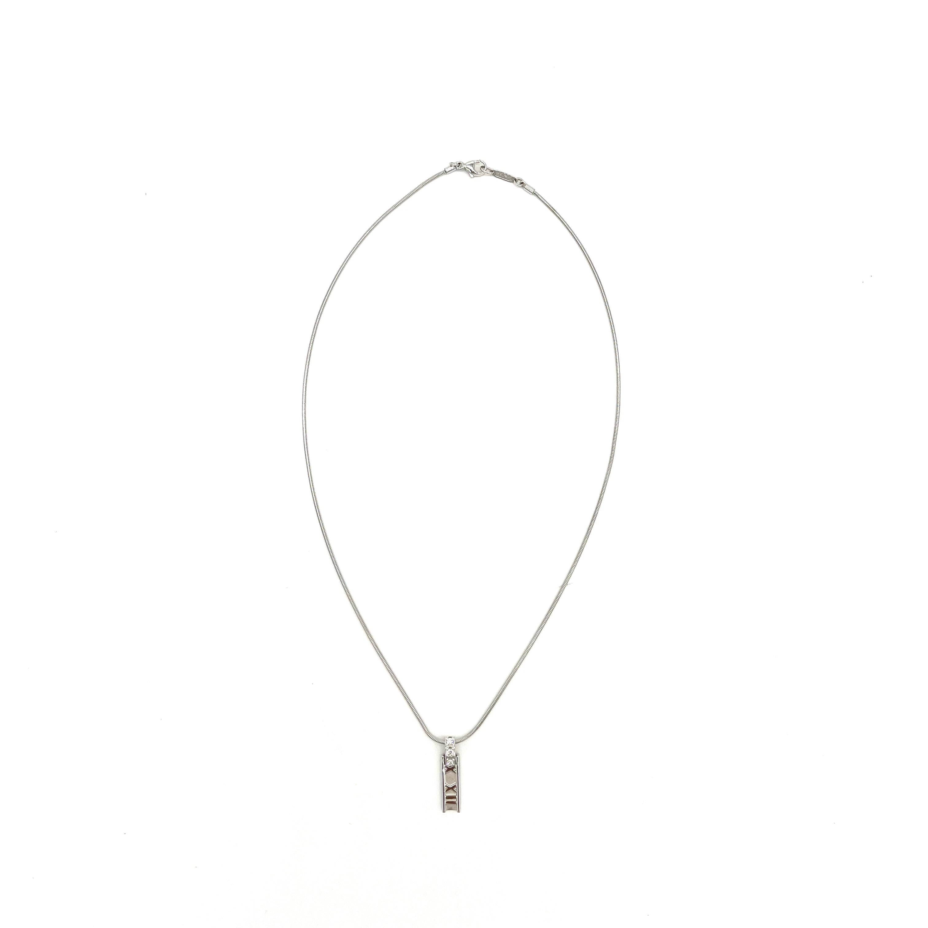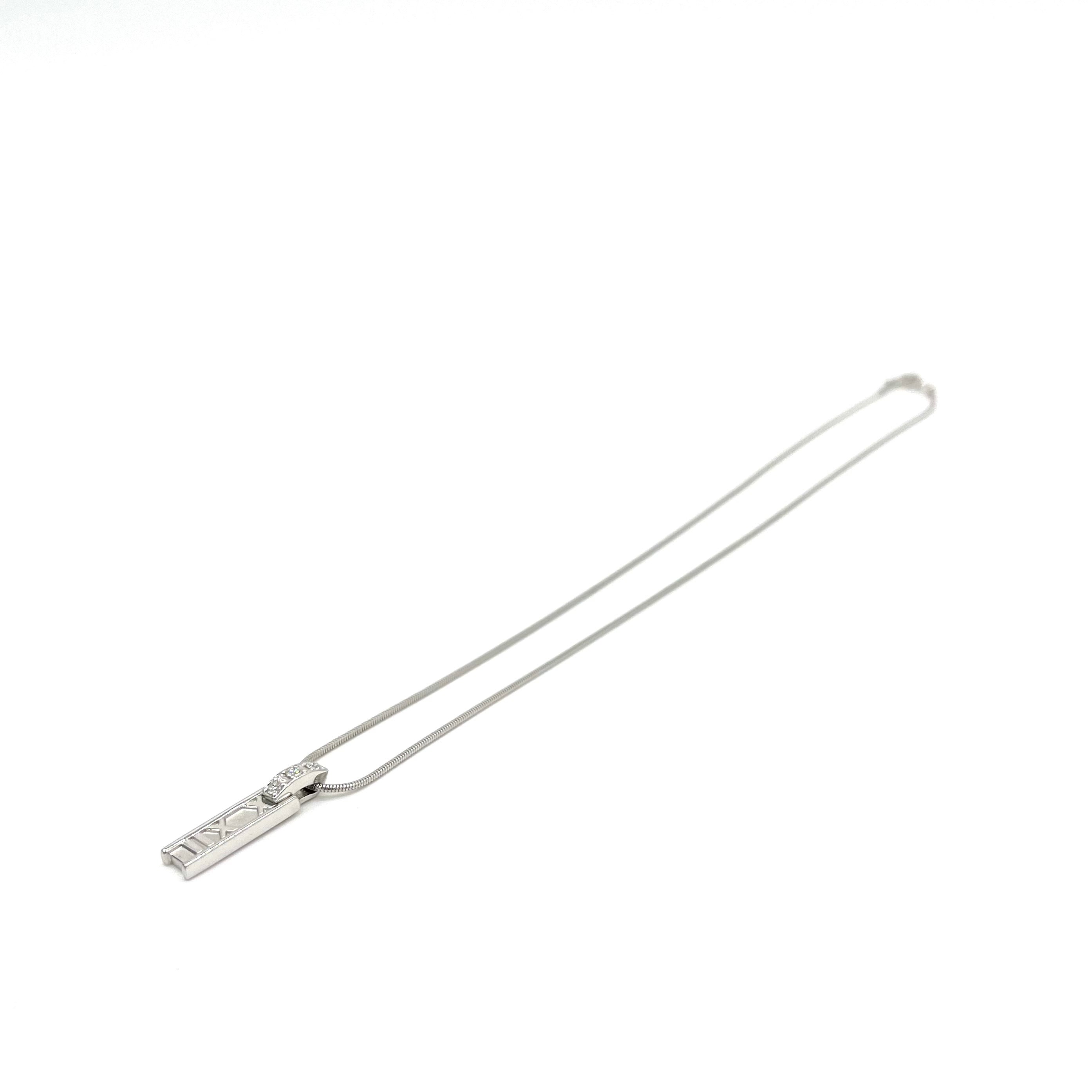 This is an authentic Tiffany & Co Vintage 18K Diamond Atlas Bar Pendant Necklace. Discover this authentic Tiffany & Co. 18K White Gold 3 Diamond Atlas Bar Pendant Necklace at Vetoben. Crafted in 18K white gold, this necklace features a sleek Atlas bar pendant adorned with three round brilliant-cut diamonds, showcasing Tiffany’s iconic Roman numeral design with modern elegance. With a 16-inch chain, this piece reflects Tiffany & Co.’s exceptional craftsmanship, offering refined sophistication for both day and night. Carefully selected by Vetoben, this luxurious necklace is ready for immediate shipping and is the perfect choice for online shoppers seeking high quality and timeless beauty. For more details, please inquire.