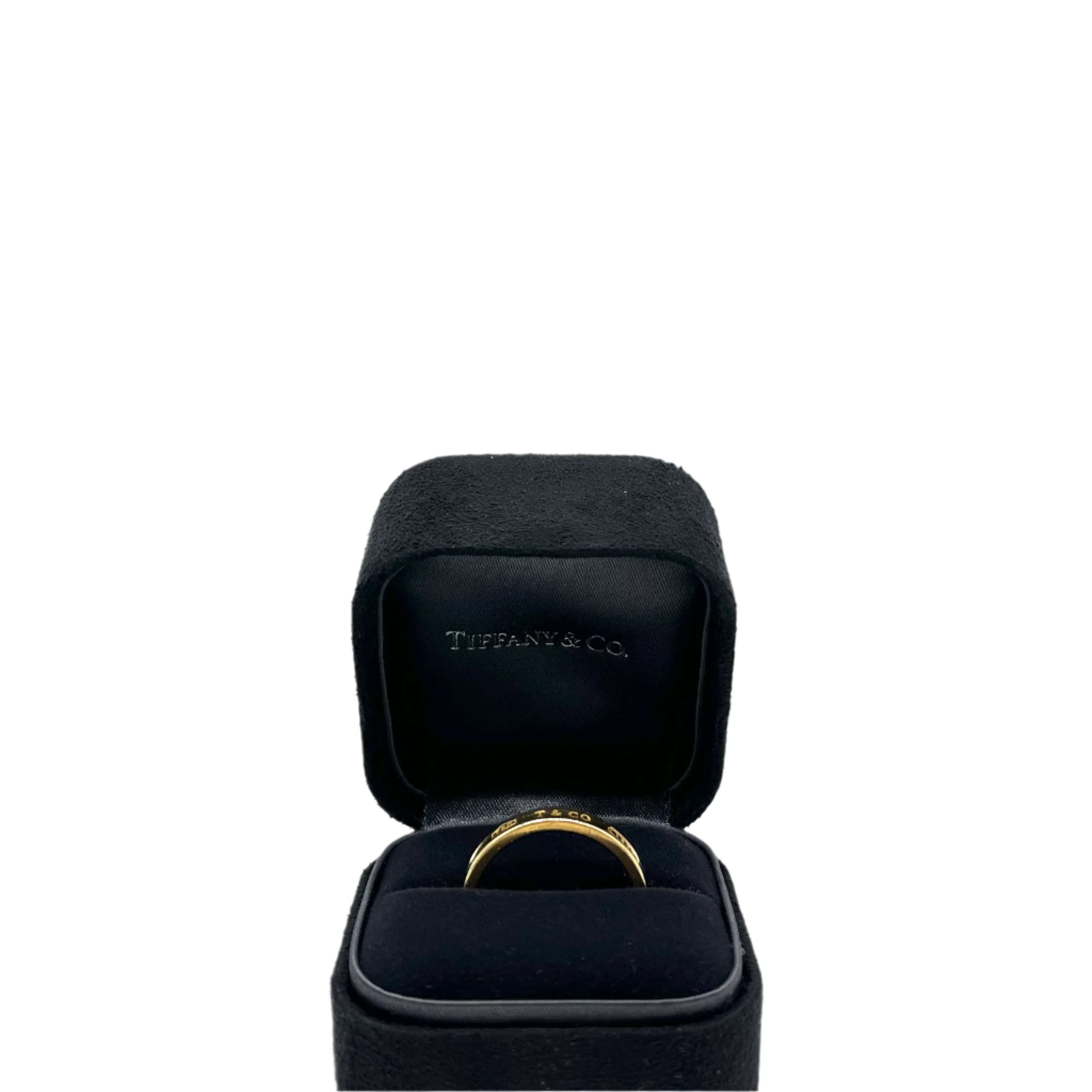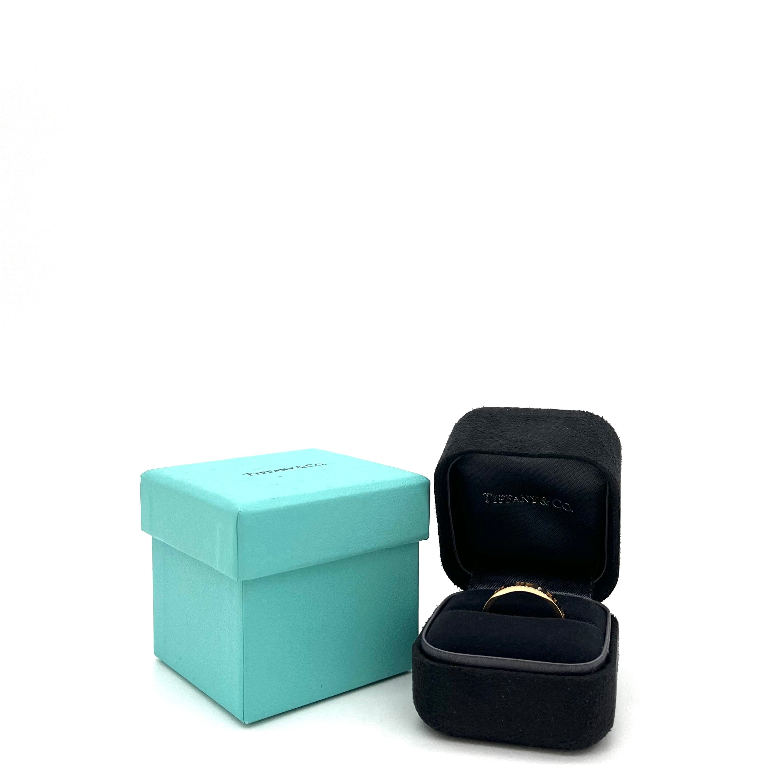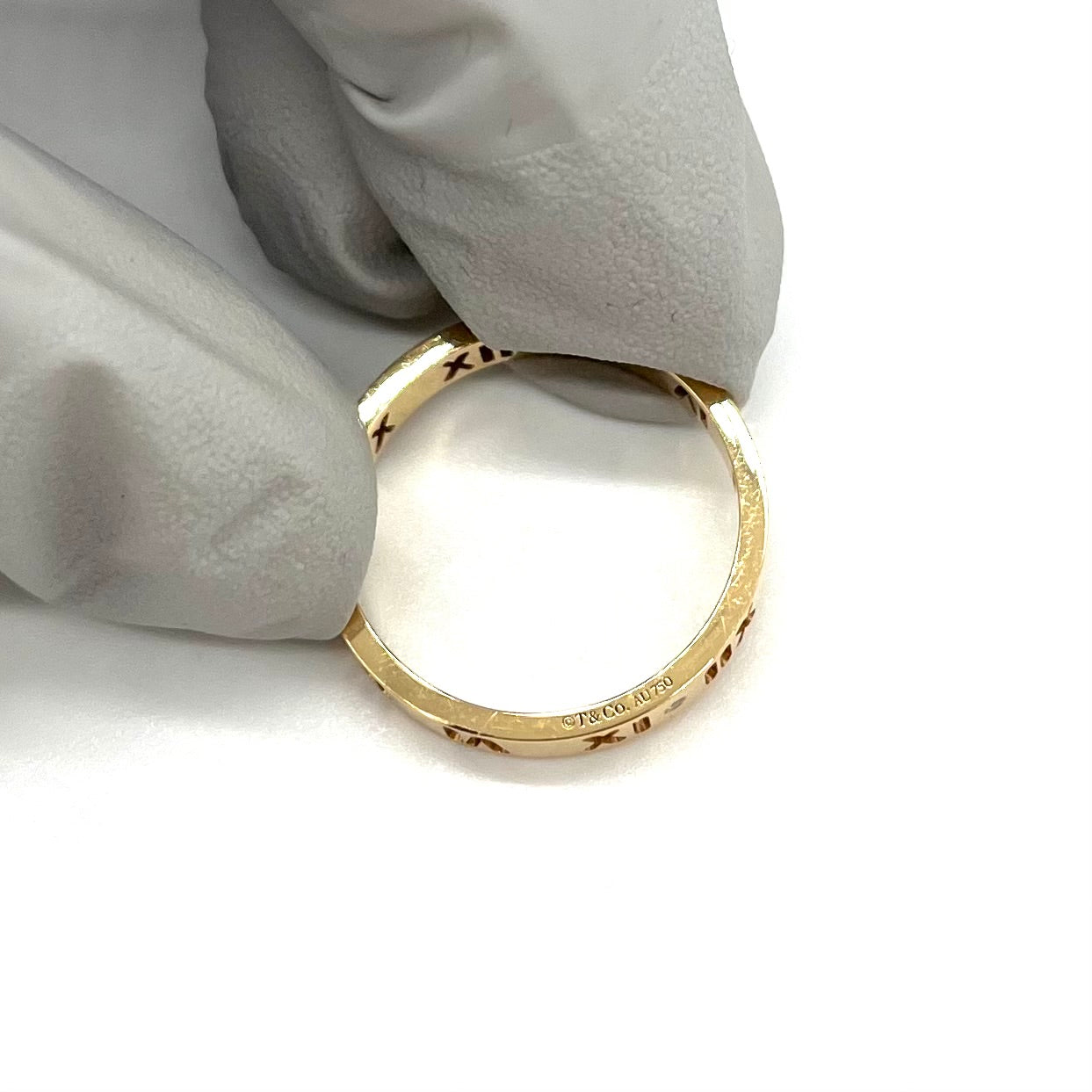 This is an authentic Tiffany & Co. Tiffany Atlas Pierced Diamond Ring 18K Yellow Gold Ring. The ring is crafted of 18 karat gold and features cutout Roman numeral motifs alternating between round brilliant cut diamonds weighing approximately .02 total carat weight.