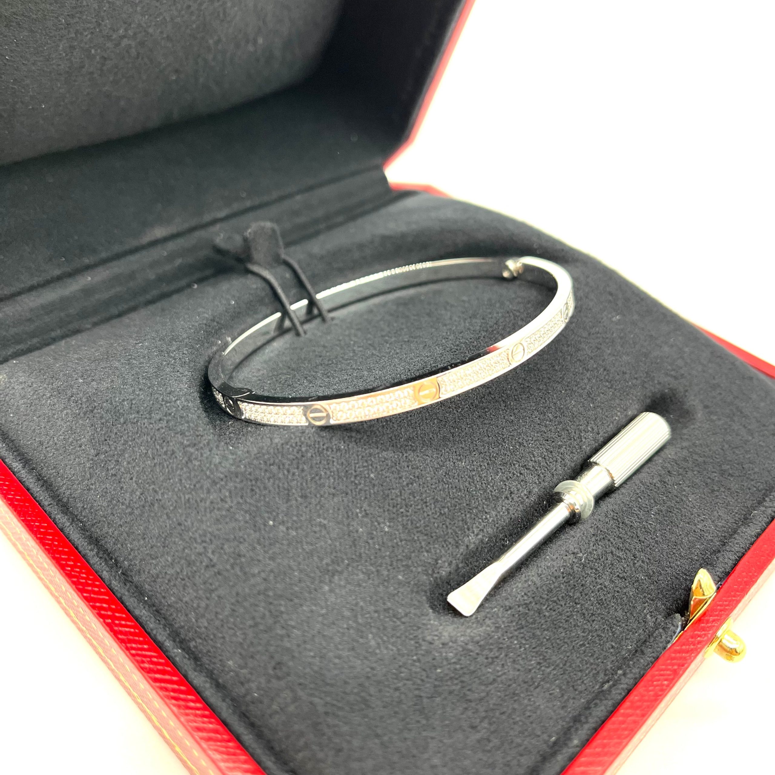 This is an authentic Cartier LOVE bracelet, small model, paved Size 18. The bracelet is crafted of 18 karat white gold and features the signature engraved LOVE screw motifs throughout the bangles surrounded with diamonds. The bracelet also features two functional screws on one side to open and close.