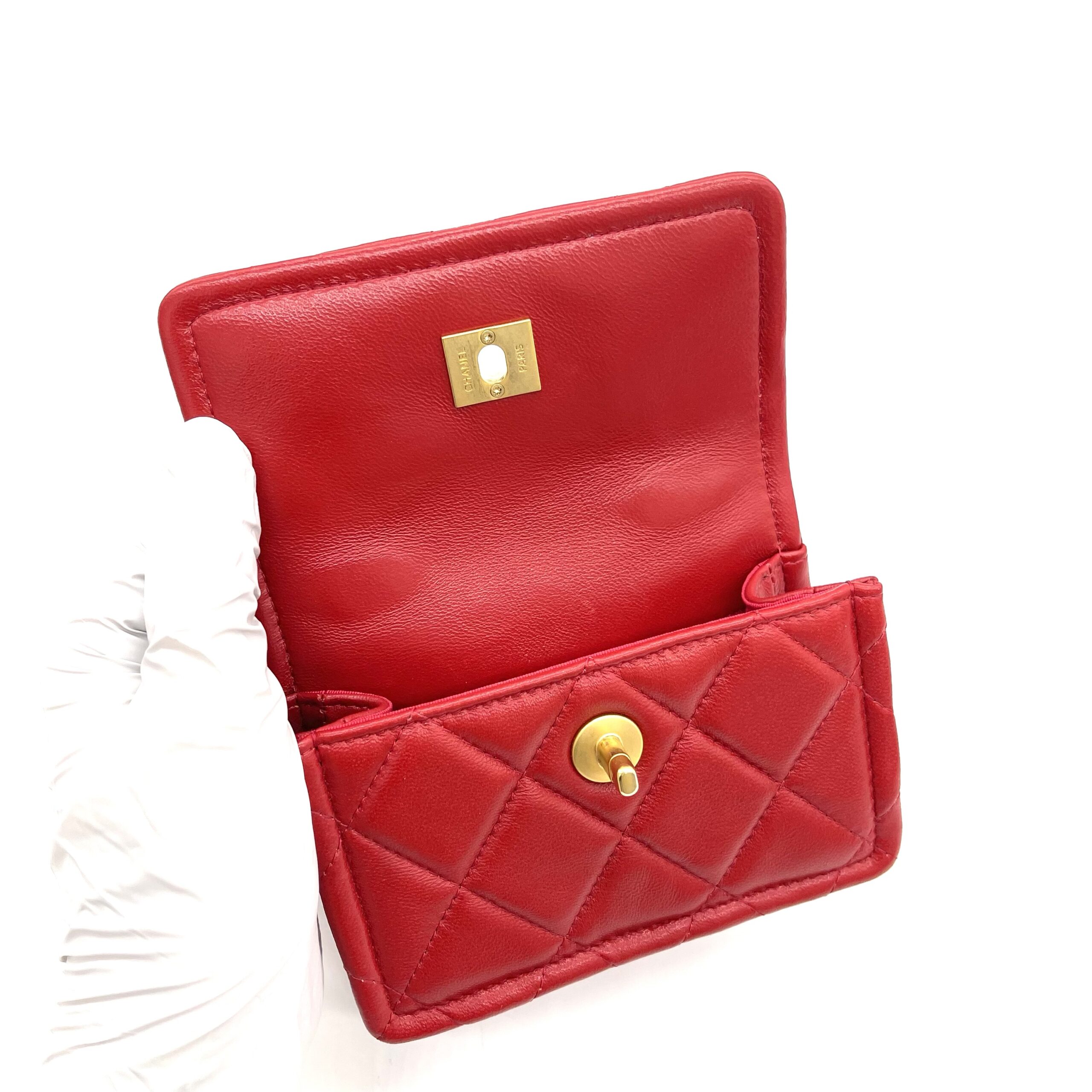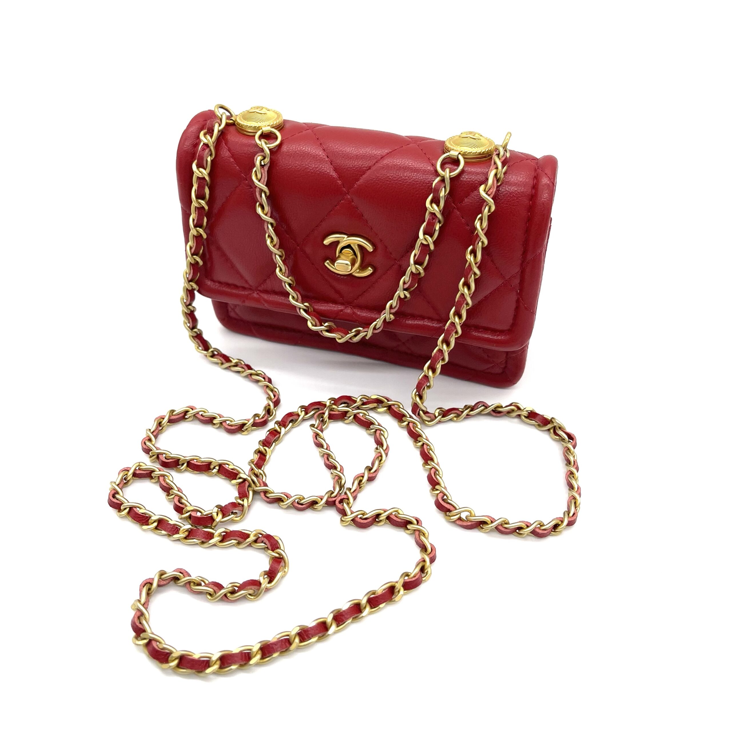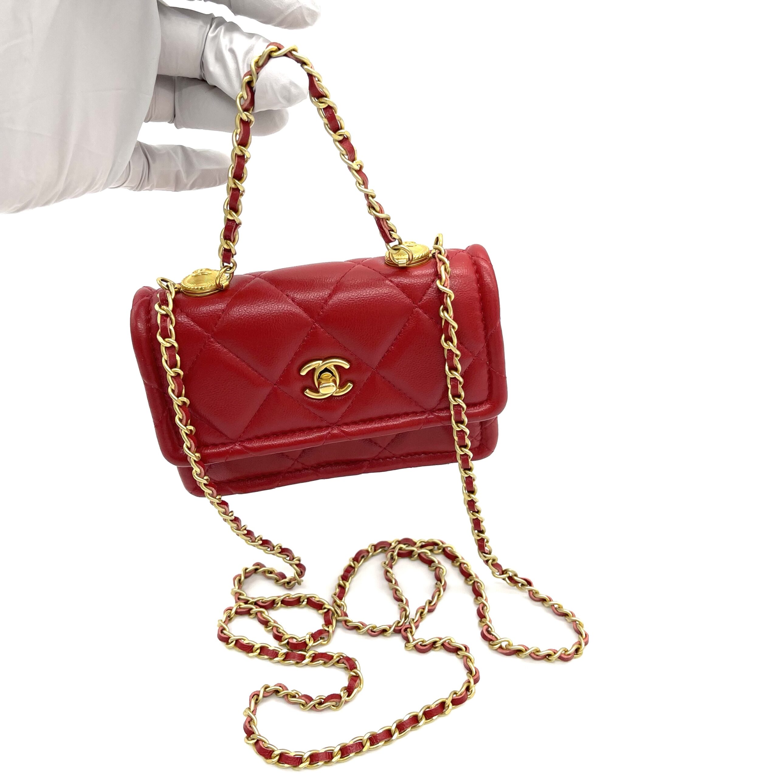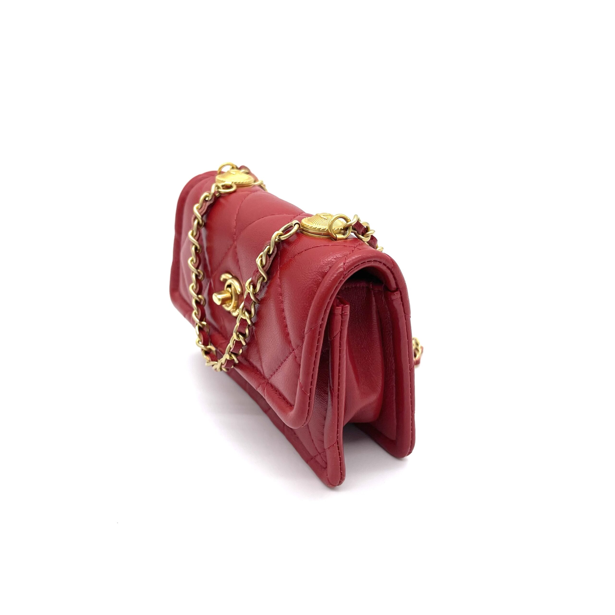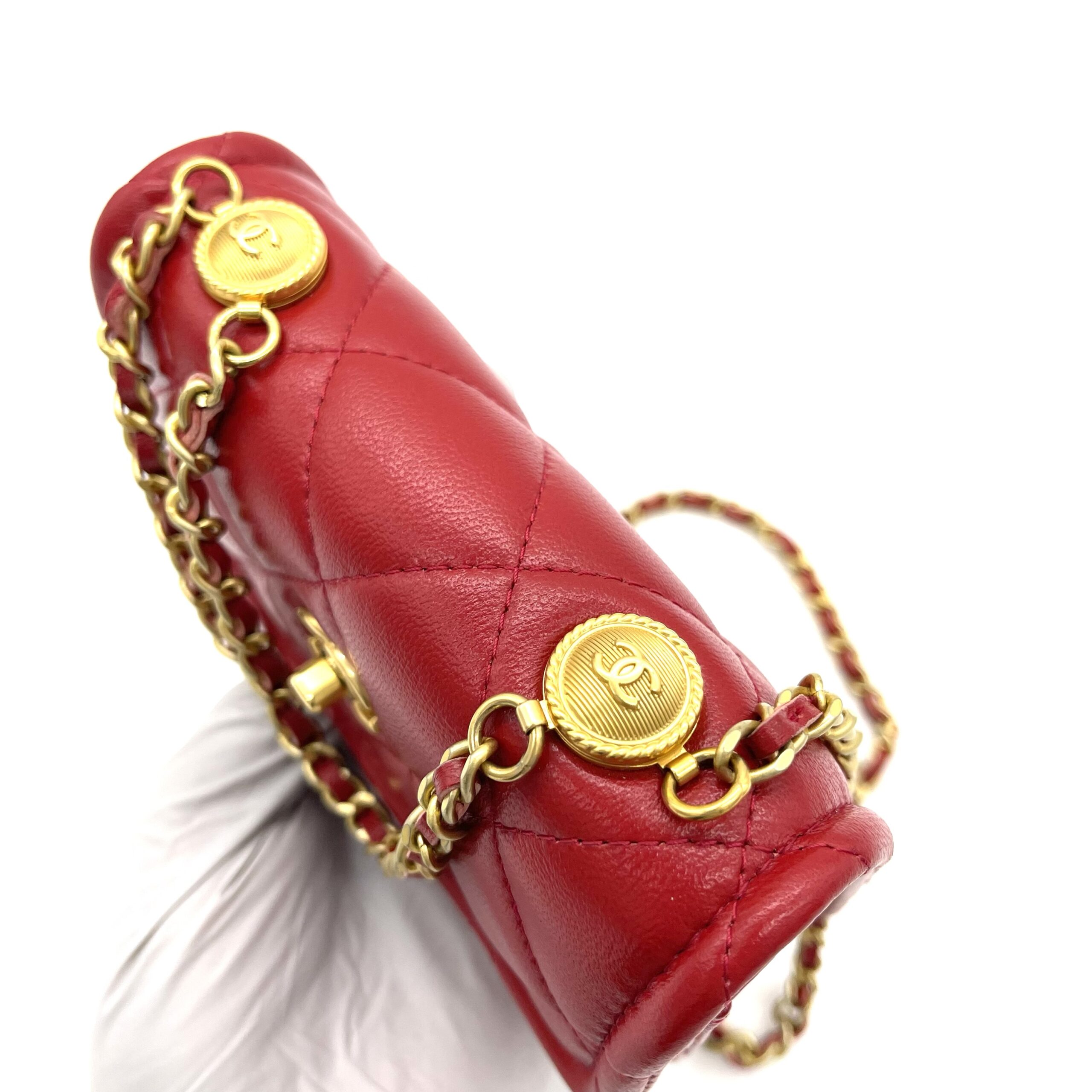 Crafted from luxurious shiny quilted lambskin leather in a bold red hue, this iconic CHANEL Extra Mini Flap Bag features the signature CC turn-lock closure and a refined gold-tone chain strap. A timeless piece that can be styled both as a shoulder ba...