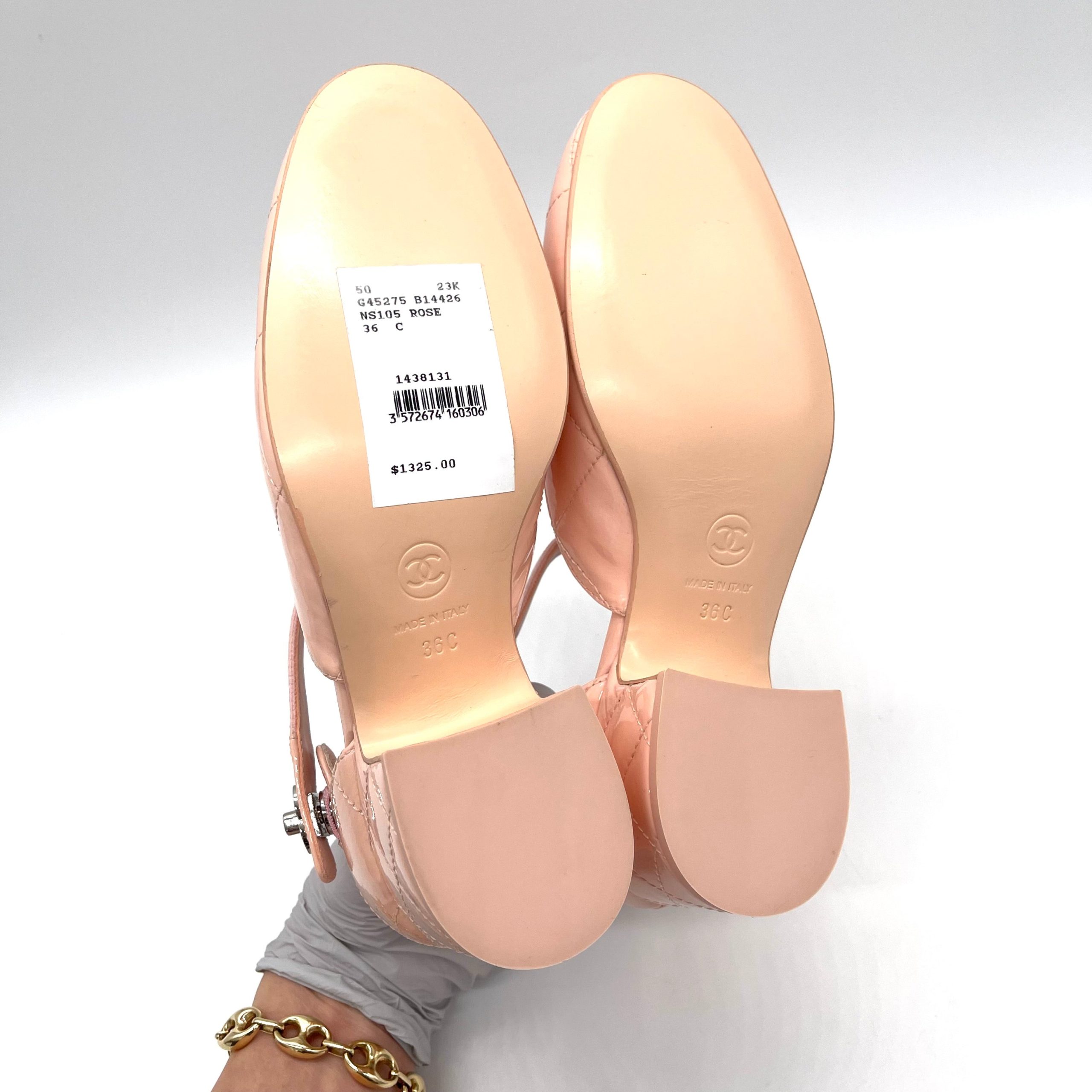 An elastic ankle strap adorned with the iconic silver-tone CC logo adds a touch of sophistication and ensures a secure, comfortable fit. Perfect for elevating both casual and dressy looks.