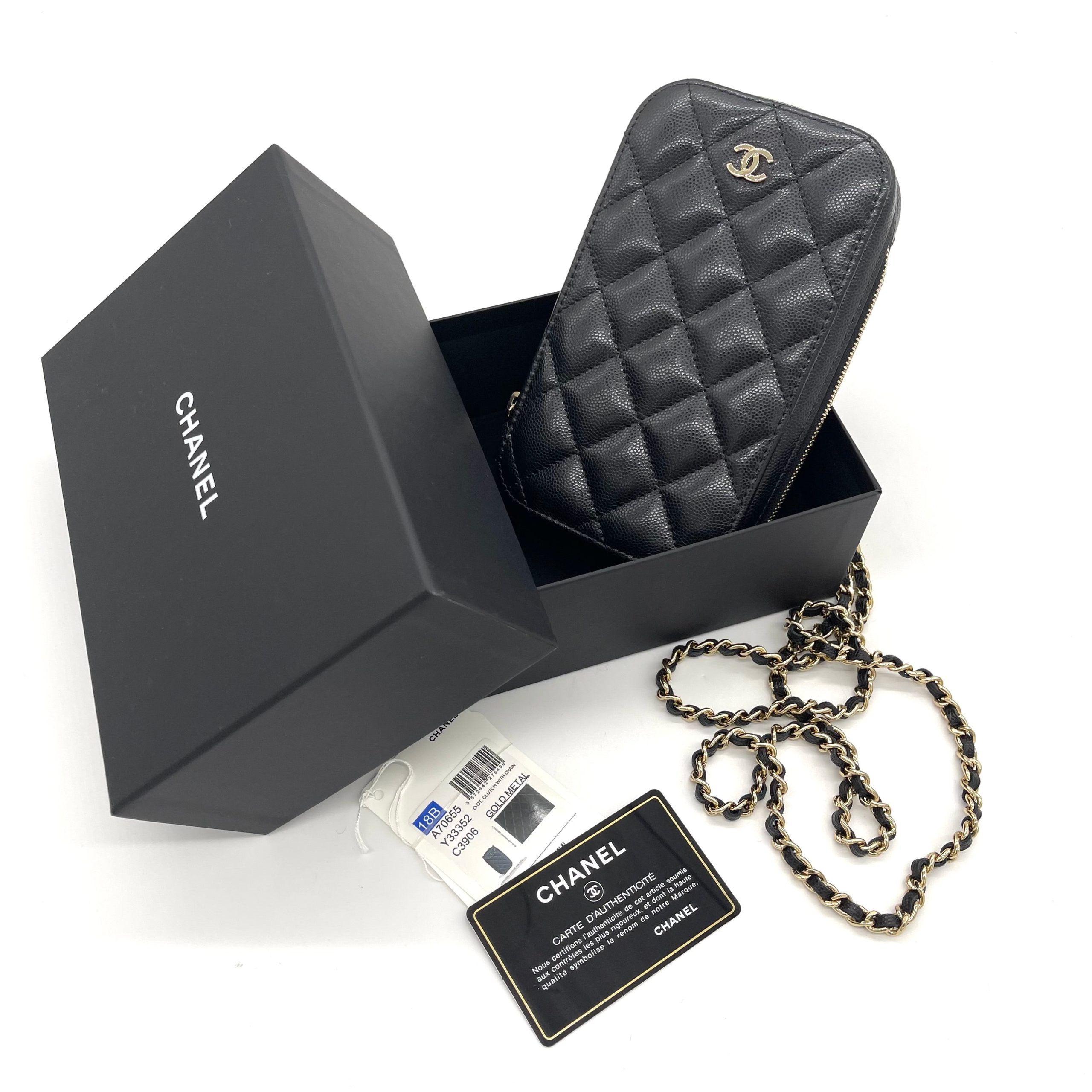 Sleek and stylish, this CHANEL bag features black grained calfskin leather with a secure zip-around closure. The chic chain shoulder strap lets you wear it comfortably day or night. Compact yet functional, it’s perfect for carrying your phone and essentials in timeless CHANEL style.