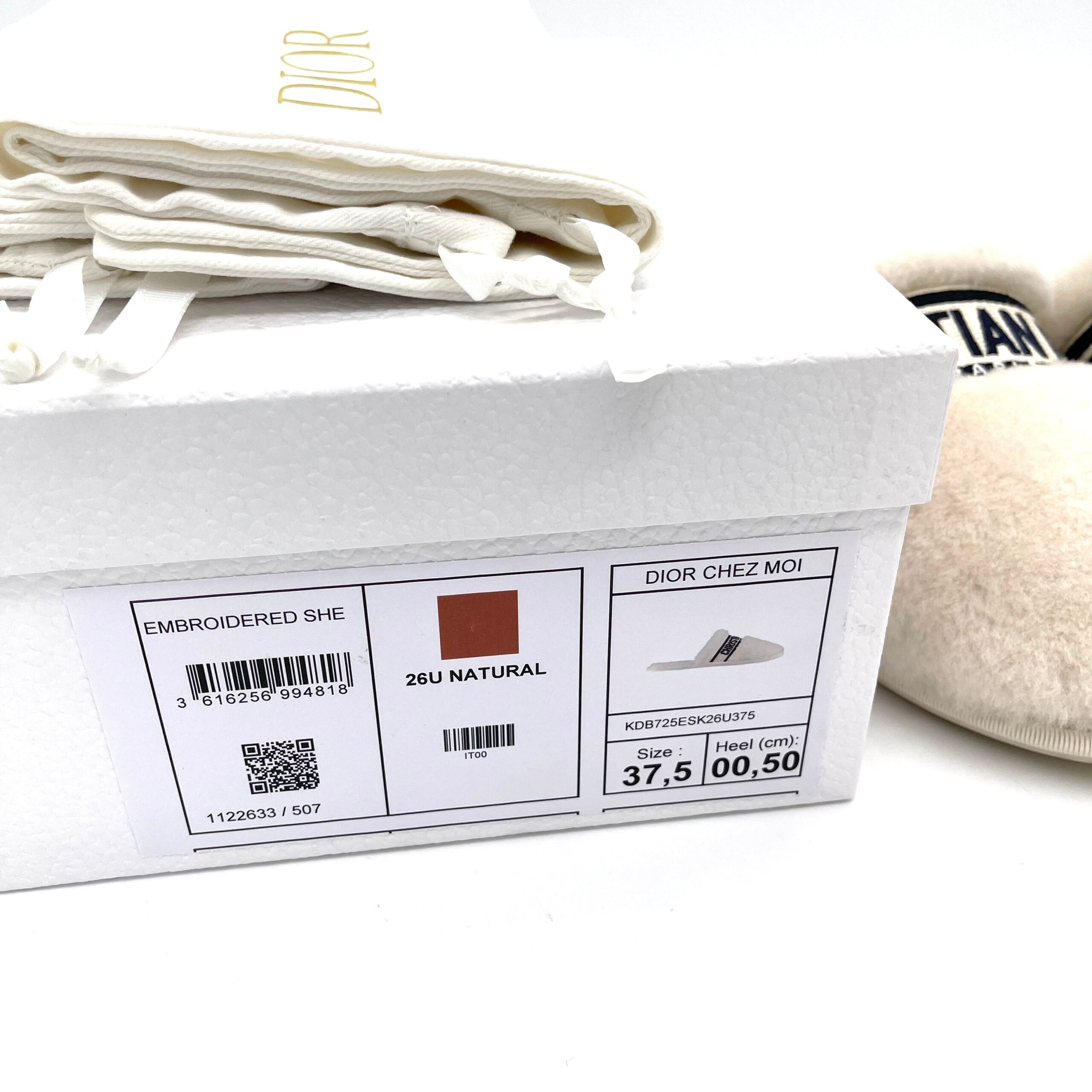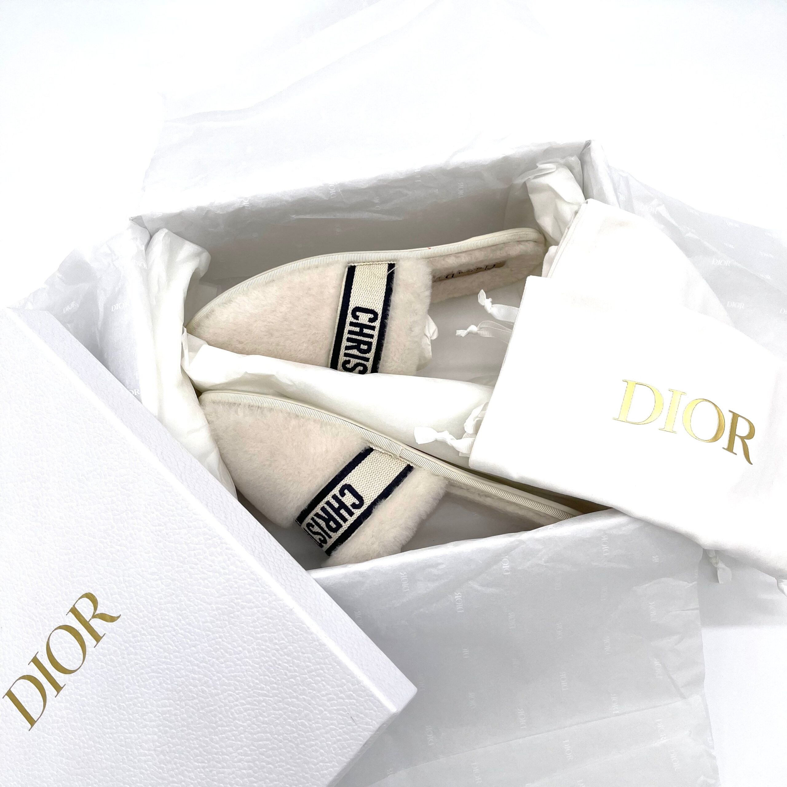 Fully crafted in white shearling, it has an upper embellished with a deep blue ‘CHRISTIAN DIOR’ signature embroidery that instantly stands out