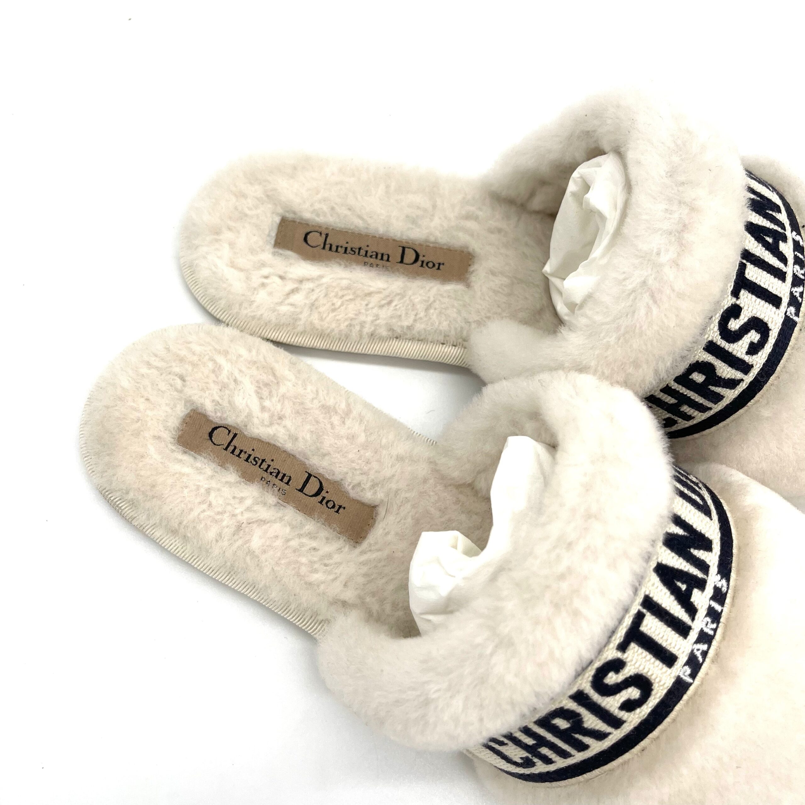 Fully crafted in white shearling, it has an upper embellished with a deep blue 'CHRISTIAN DIOR' signature embroidery that instantly stands out
