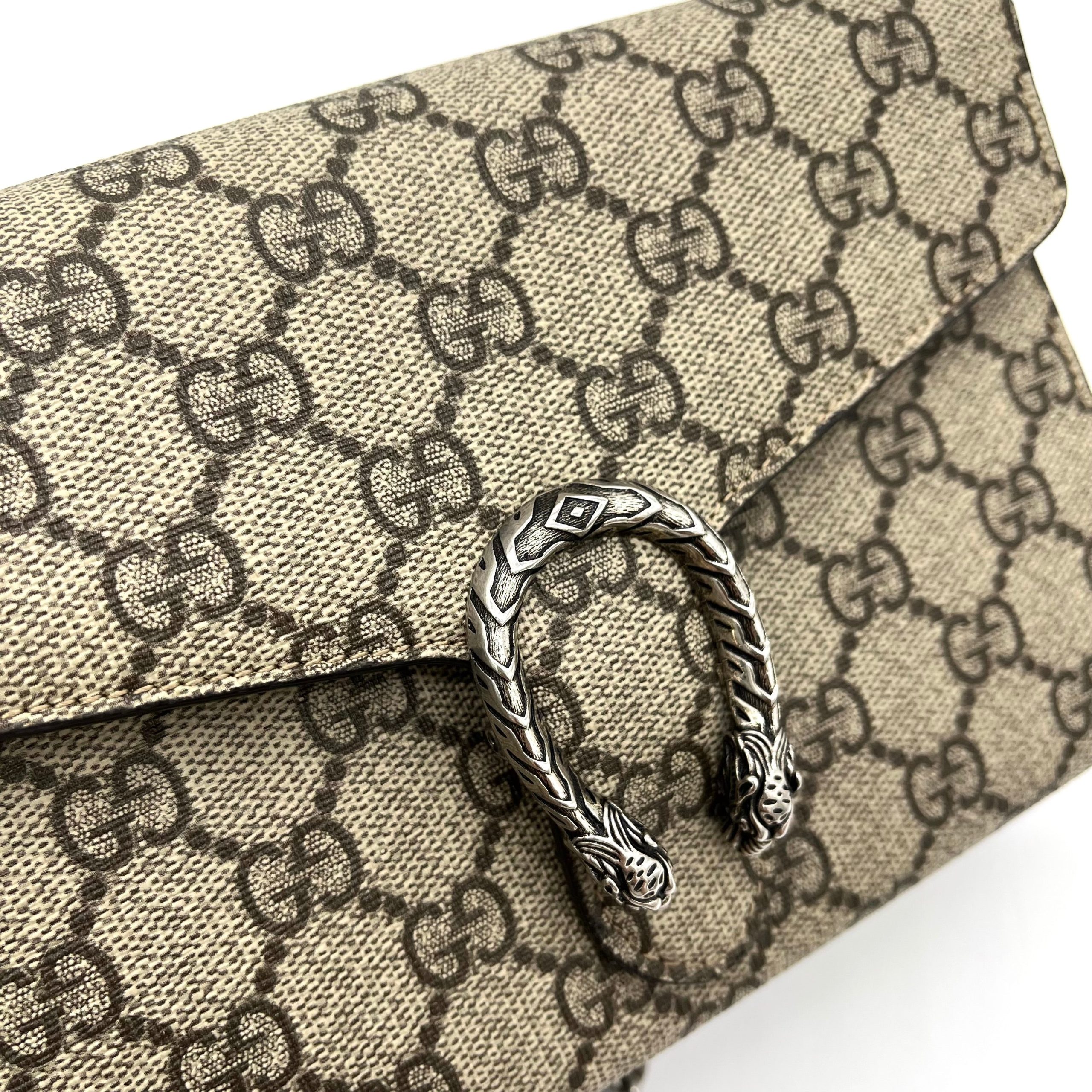 This is an authentic GUCCI GG Supreme Monogram Mini Dionysus Chain Wallet in Beige and Taupe. This stylish versatile bag is crafted of Gucci GG monogram coated canvas. This shoulder bag features a silver chain-link shoulder strap and a textured horseshoe closure with feline heads at the end. This opens to a brown fabric interior with card slots, patch pockets, and a zippered central compartment.