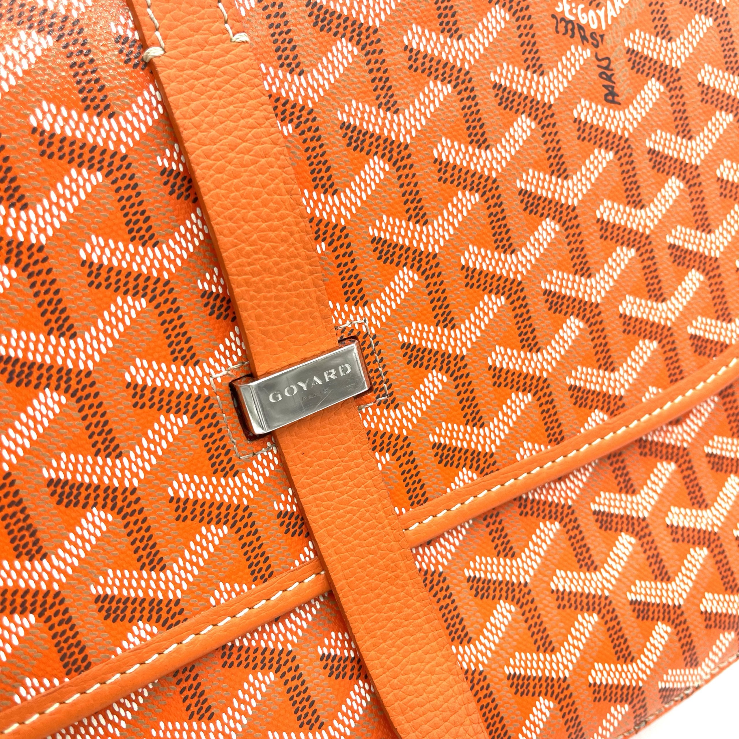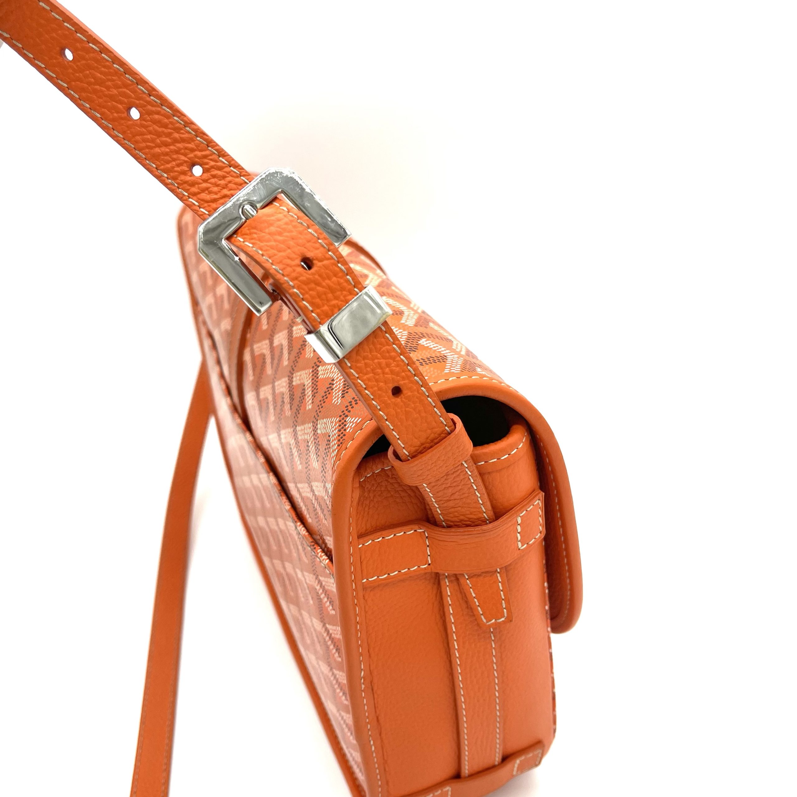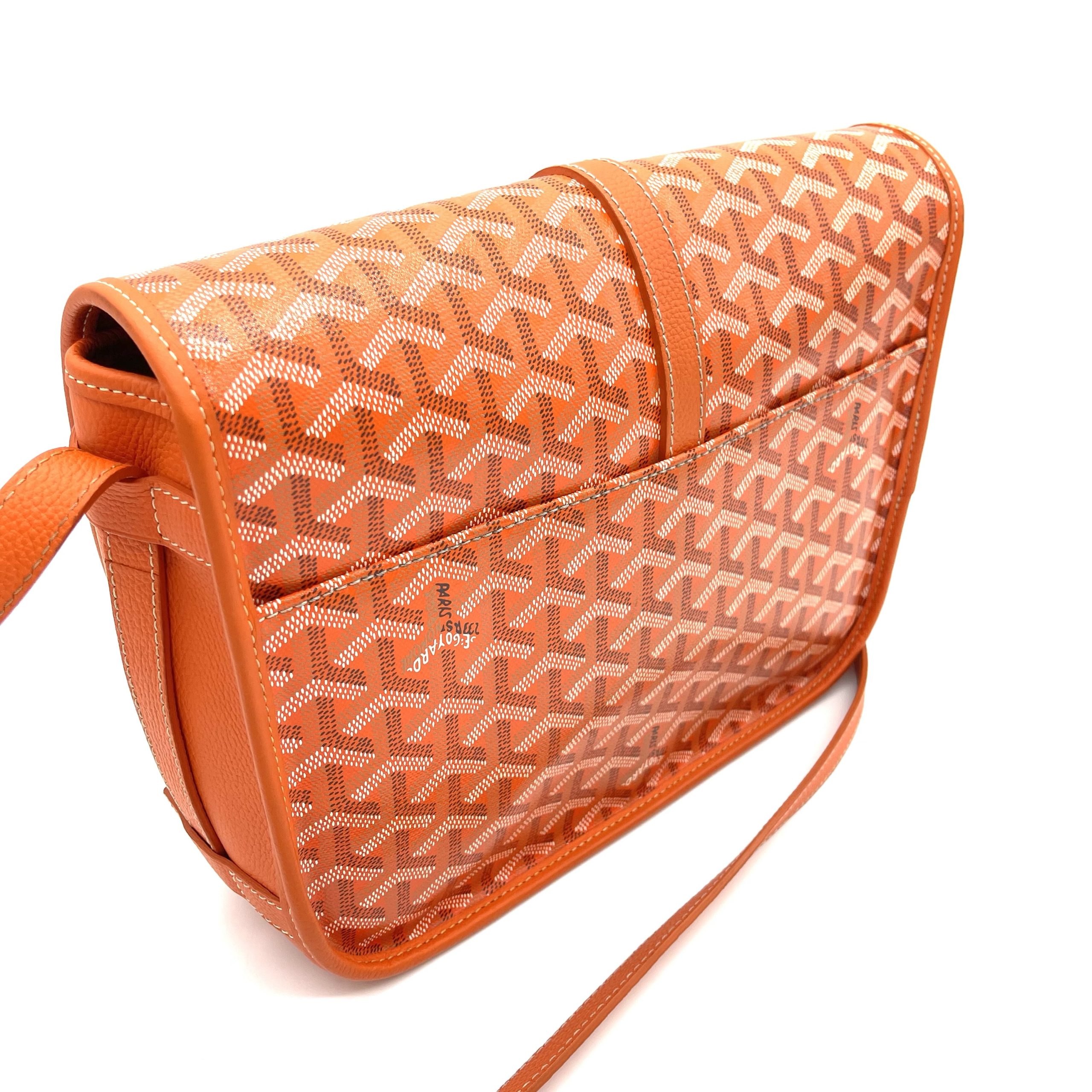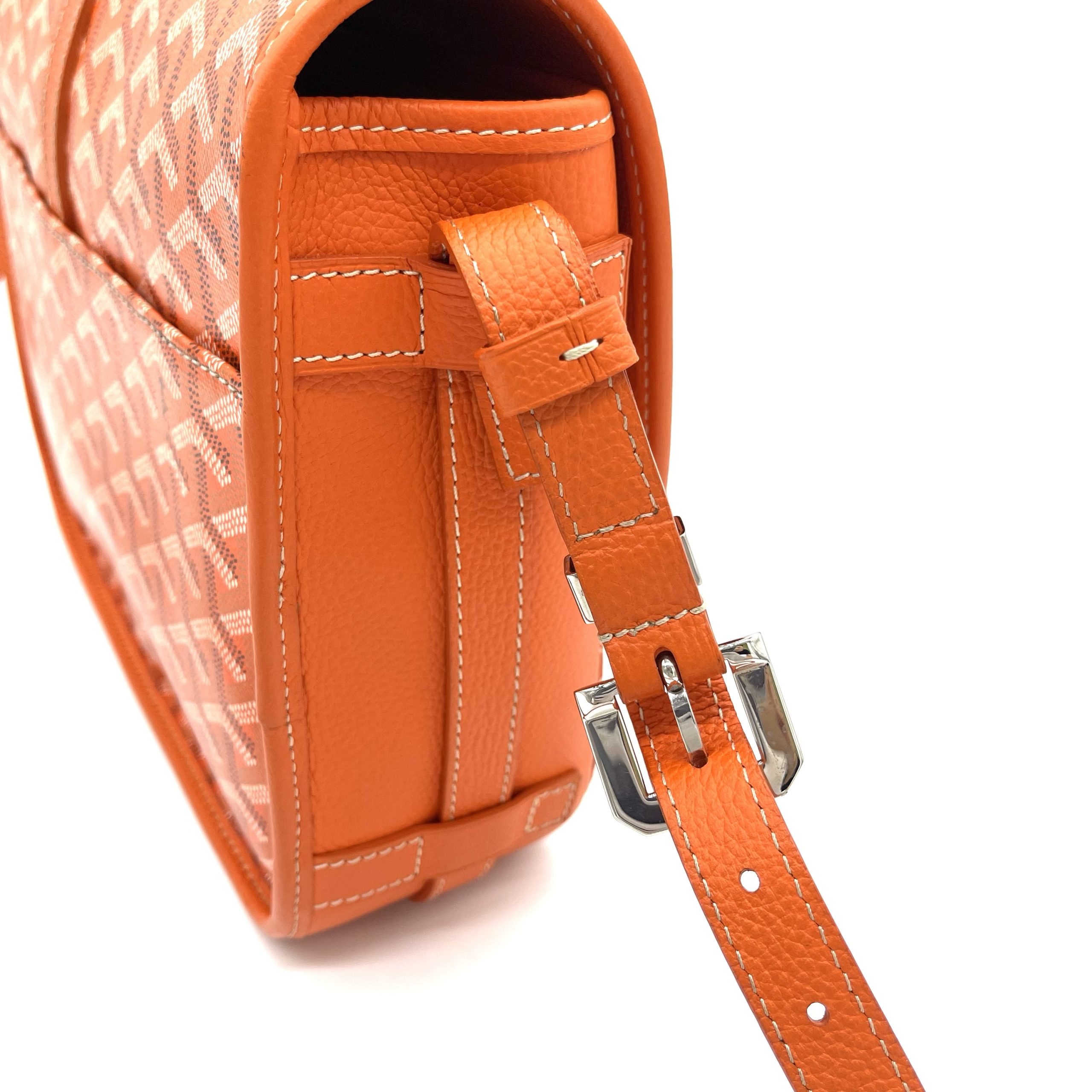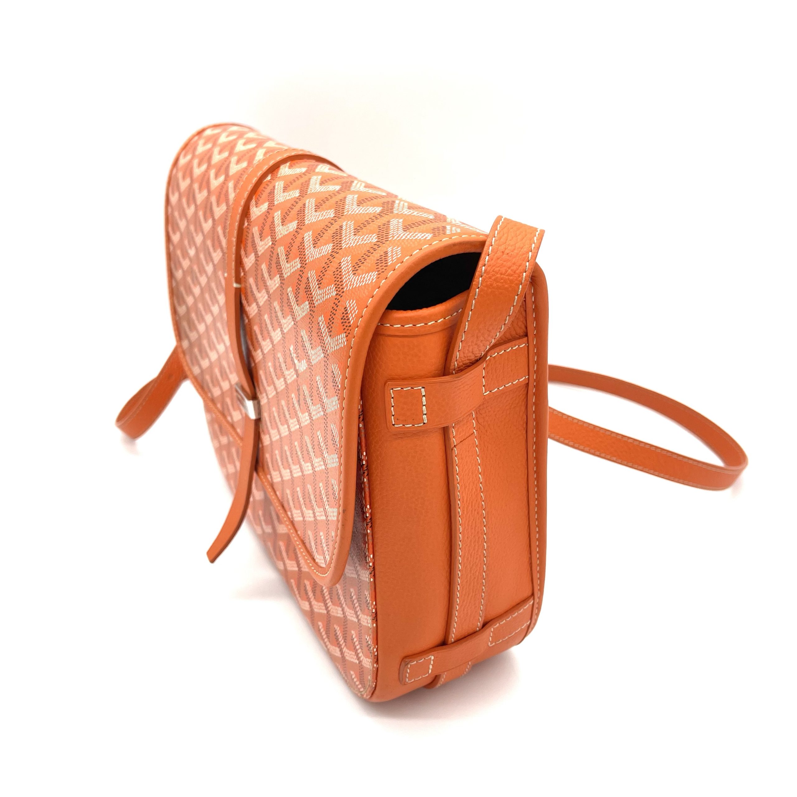 This authentic Goyard Belvédère MM messenger bag is crafted from the brand’s iconic Goyardine coated canvas in a vibrant orange color, complemented by smooth leather trim. Featuring Goyard’s signature chevron pattern, this classic crossbody bag offers increased capacity while remaining lightweight and comfortable for everyday wear.