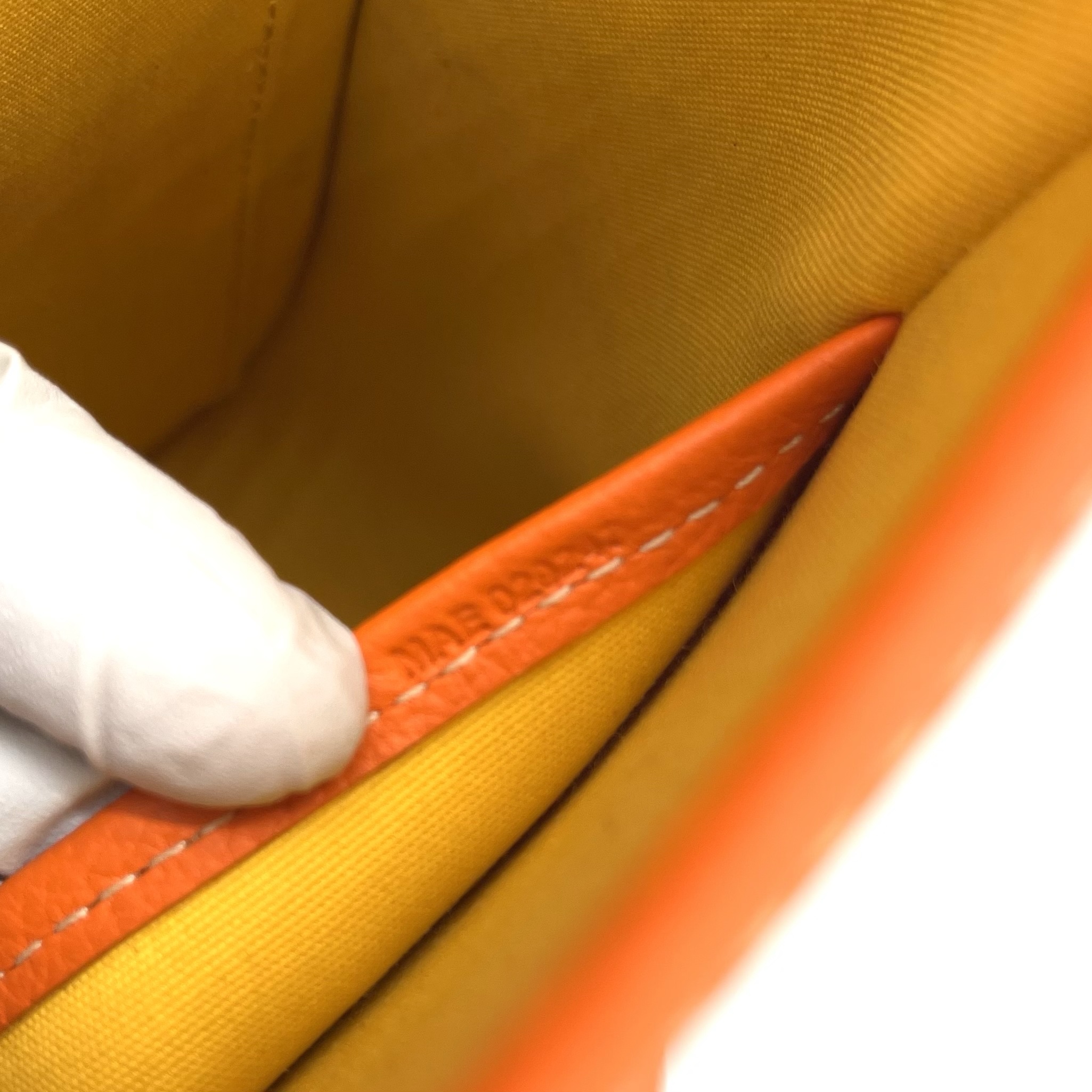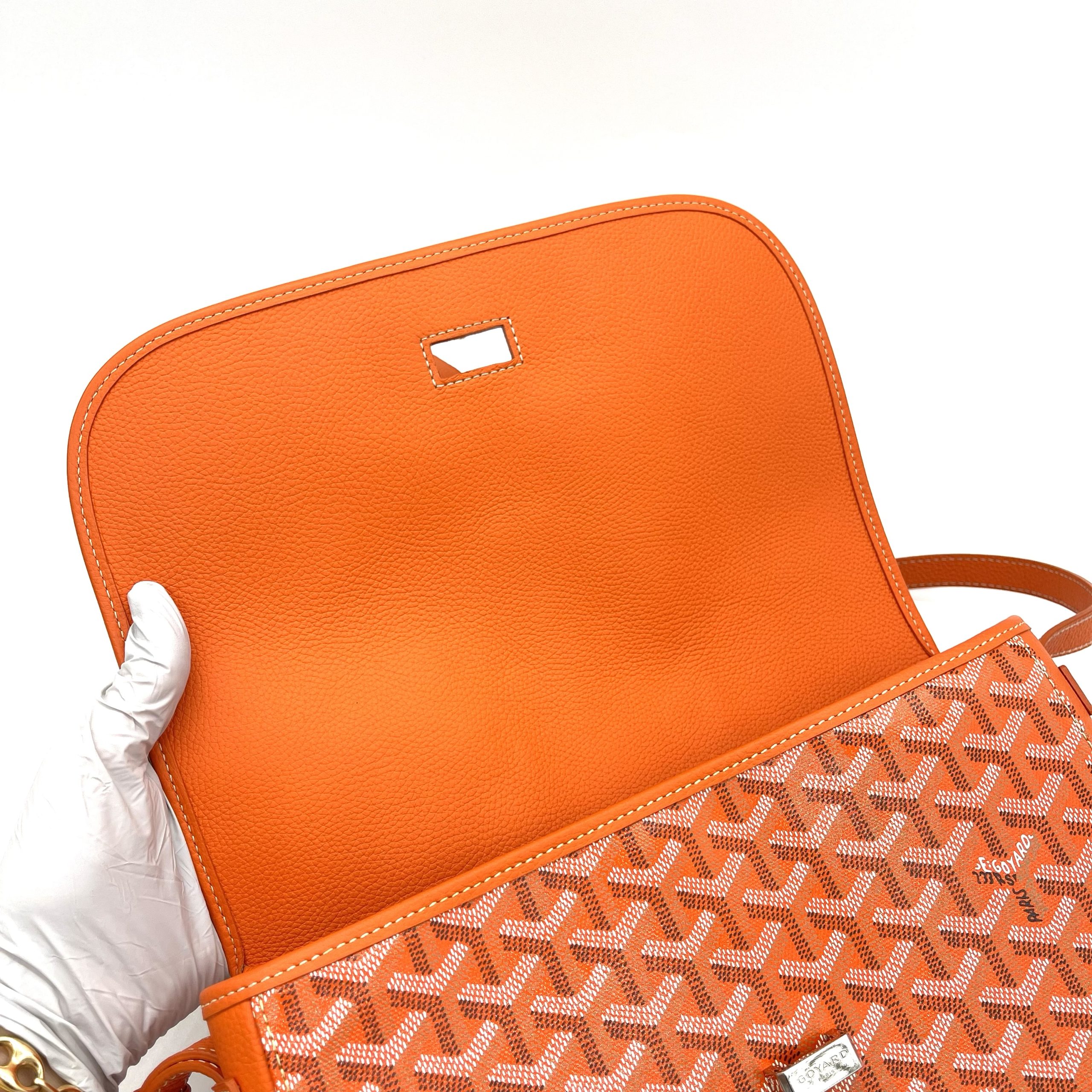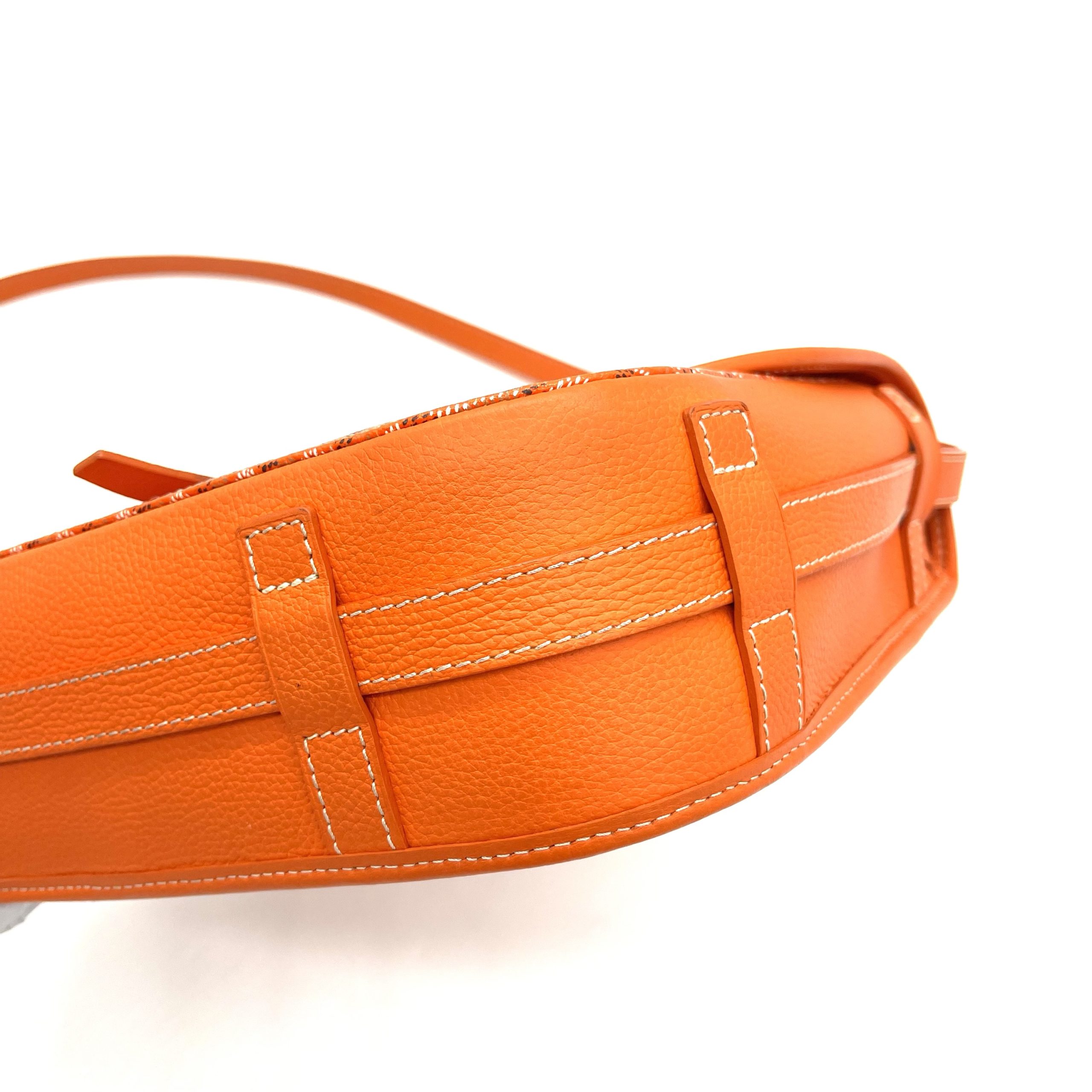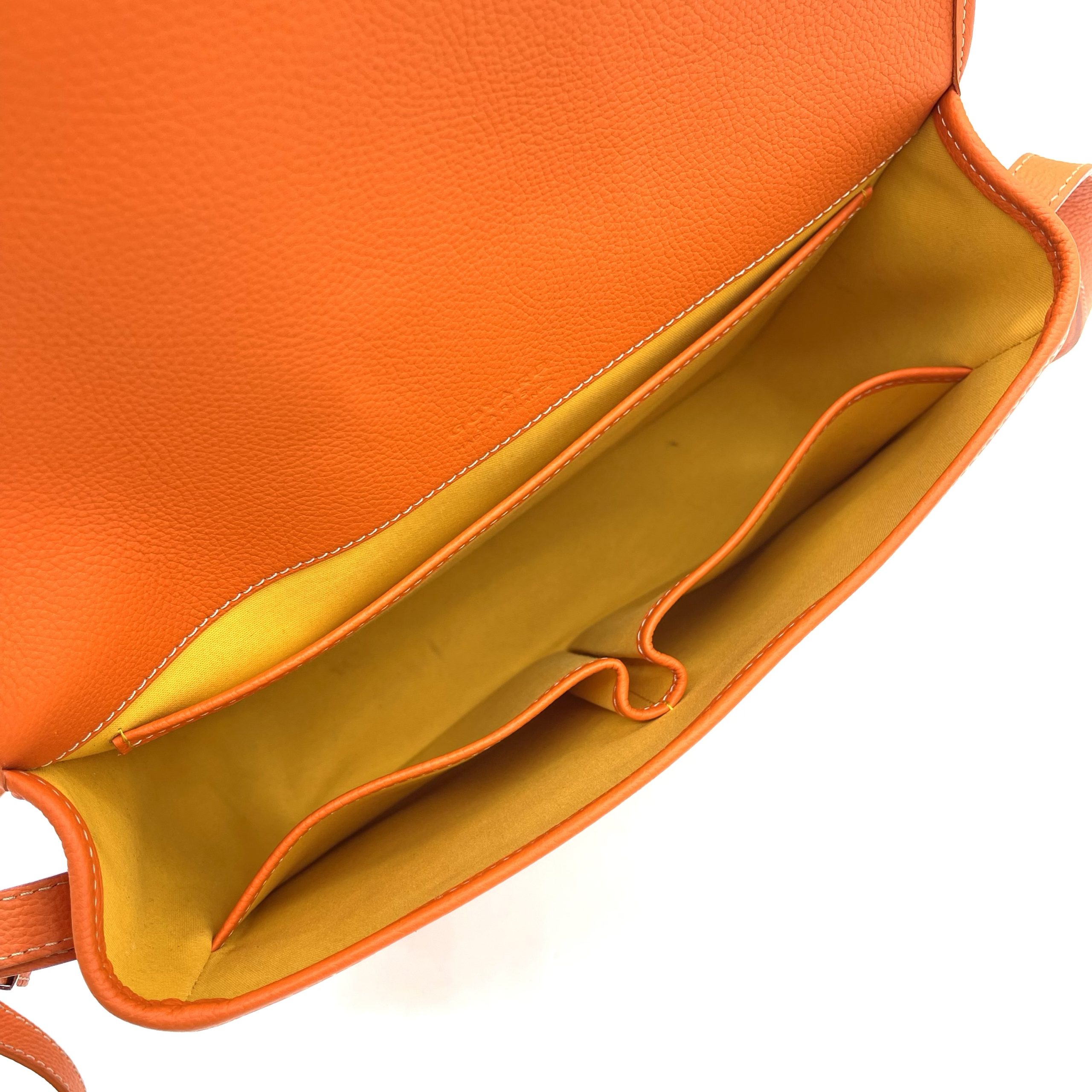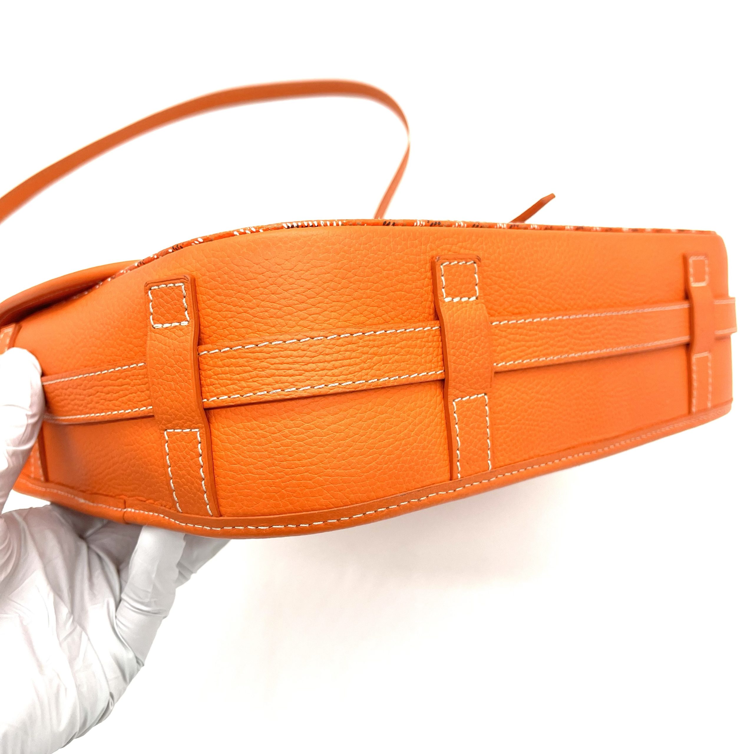 This authentic Goyard Belvédère MM messenger bag is crafted from the brand’s iconic Goyardine coated canvas in a vibrant orange color, complemented by smooth leather trim. Featuring Goyard’s signature chevron pattern, this classic crossbody bag offers increased capacity while remaining lightweight and comfortable for everyday wear.