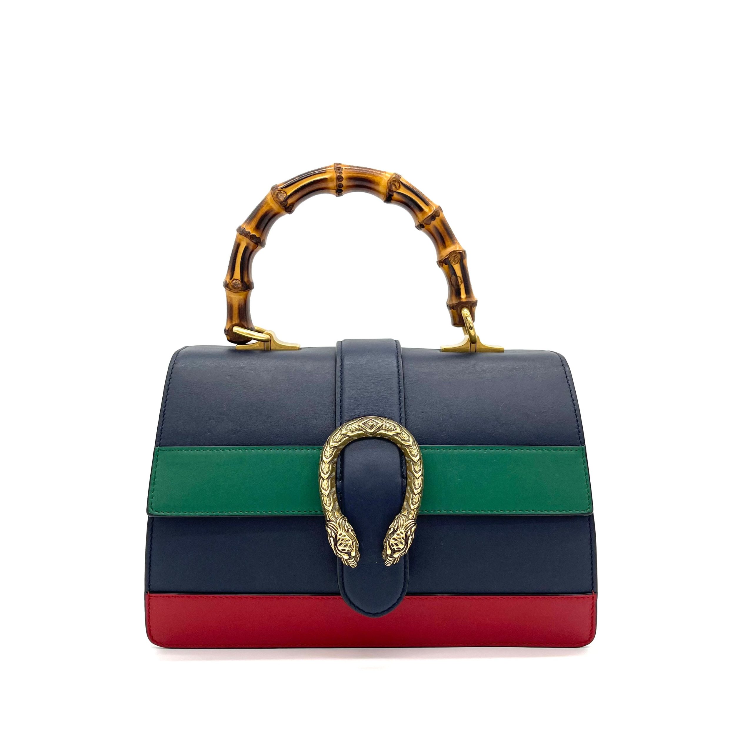 This is an authentic GUCCI Moon Calfskin Bamboo Web Medium Dionysus Top Handle Bag in Blue, Emerald, and Hibiscus Red. This bag is crafted of smooth blue calfskin leather with a green and red stripes across the front. The bag has a sturdy bamboo top handle, an optional blue and red striped canvas shoulder strap, and a prominent brass tiger head horseshoe closure. The flap opens to reveal a partitioned beige fabric interior with pockets.