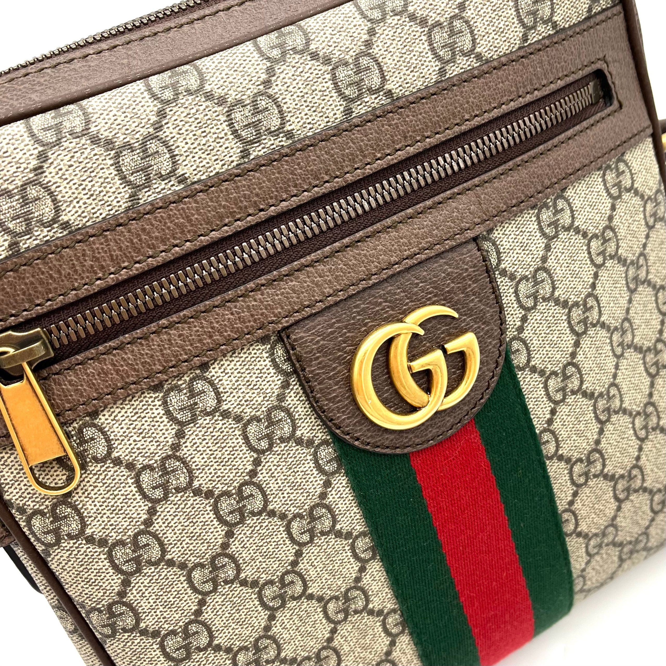 This is the authentic GUCCI GG Supreme Monogram Web Small Ophidia Messenger Bag in Brown. This crossbody bag is crafted of monogram coated canvas with brown leather trim and the classic red and green web stripe down the center. The bag features a brown leather adjustable shoulder strap, a front zipper pocket accented with the classic gold GG logo, and aged gold hardware. The top zipper opens to a linen fabric interior with a zippered pocket.