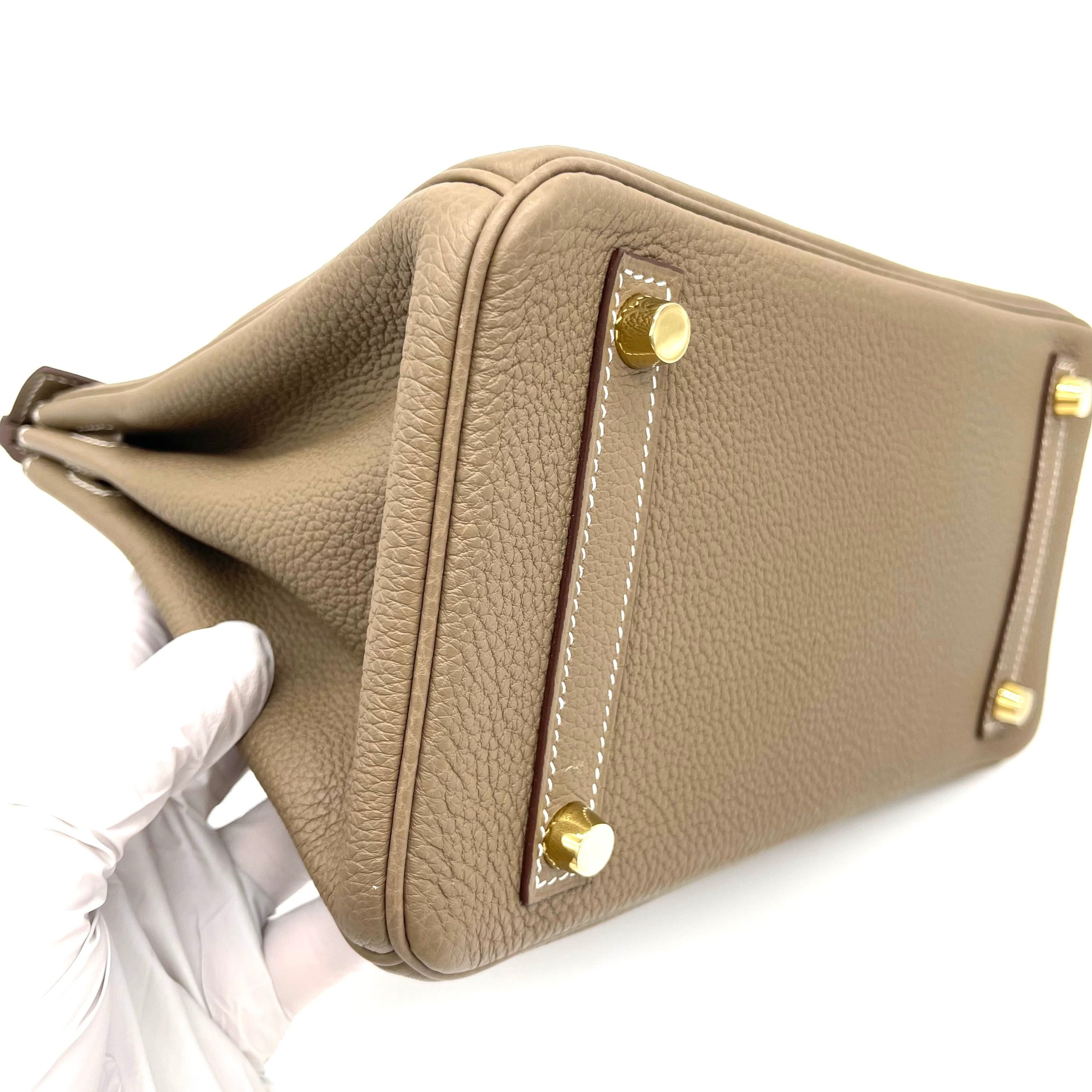 This is an authentic HERMES Togo Birkin 25 in Etoupe. This iconic handbag is hand-crafted of togo leather in taupe with white contrast stitching. The bag features rolled leather top handles, a short flap, and a cinch-style strap closure with gold plated links secured by a signature turn lock and optional padlock. The flap opens to a matching matte chevre goatskin leather interior with zipper and patch pockets.