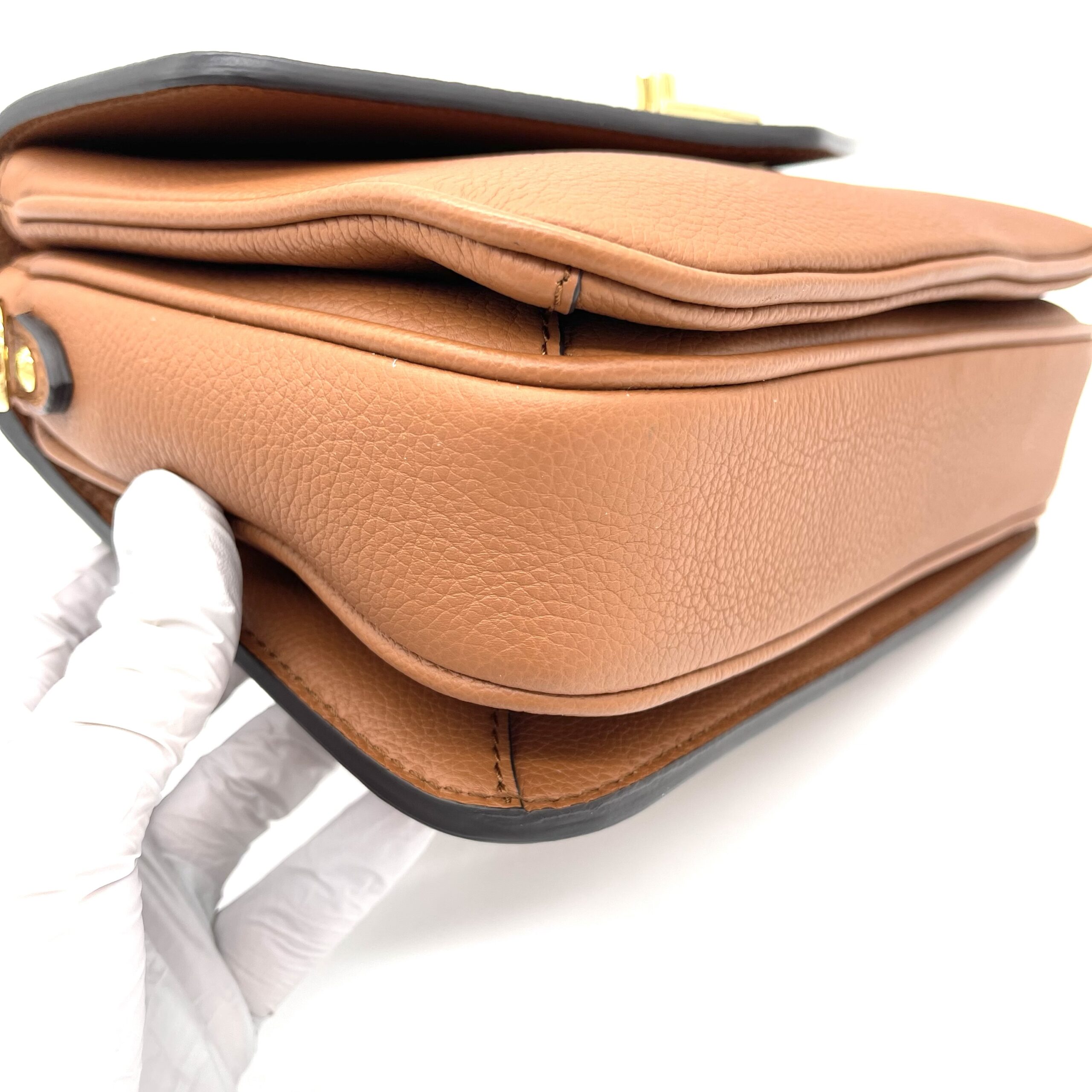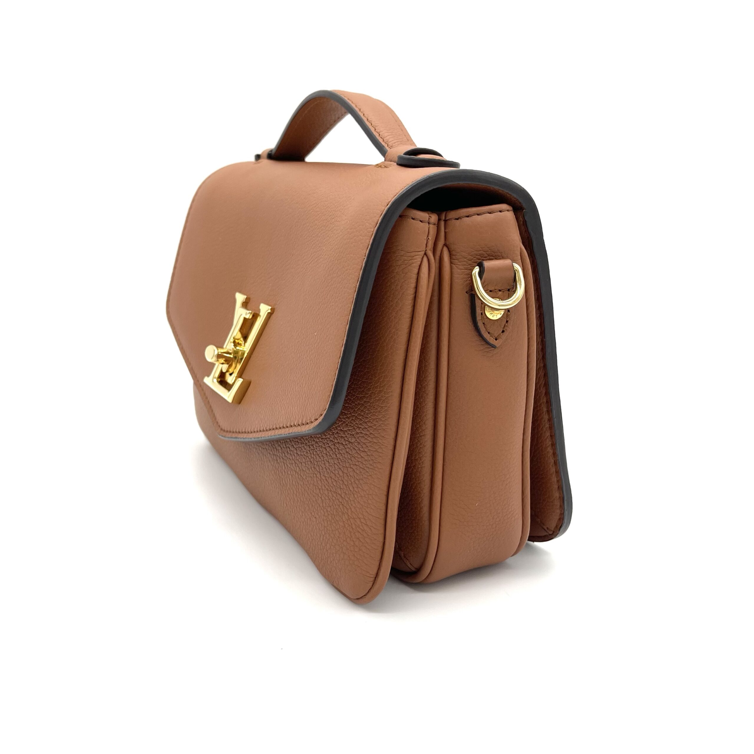 Refined and timeless, the Lockme Oxford bag is crafted from luxurious grained calfskin leather in a rich cognac color. Its structured silhouette is enhanced by the iconic gold-tone LV twist-lock closure, creating an elegant yet modern statement piece.