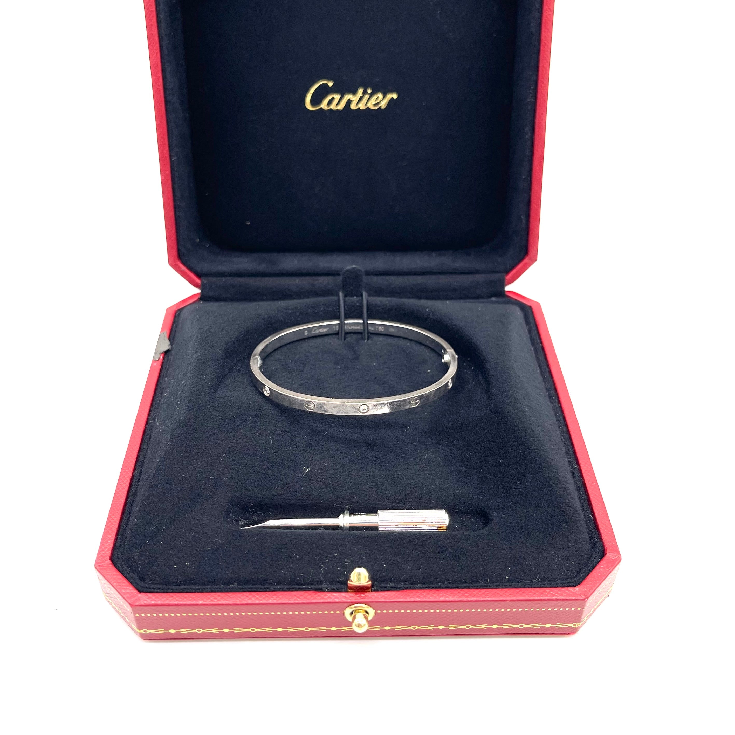 Elegant and timeless, the Cartier Love Bracelet in 18K white gold is beautifully set with six brilliant-cut diamonds. Designed with the iconic screw motif, this small model captures Cartier’s signature expression of everlasting love and refined simplicity.