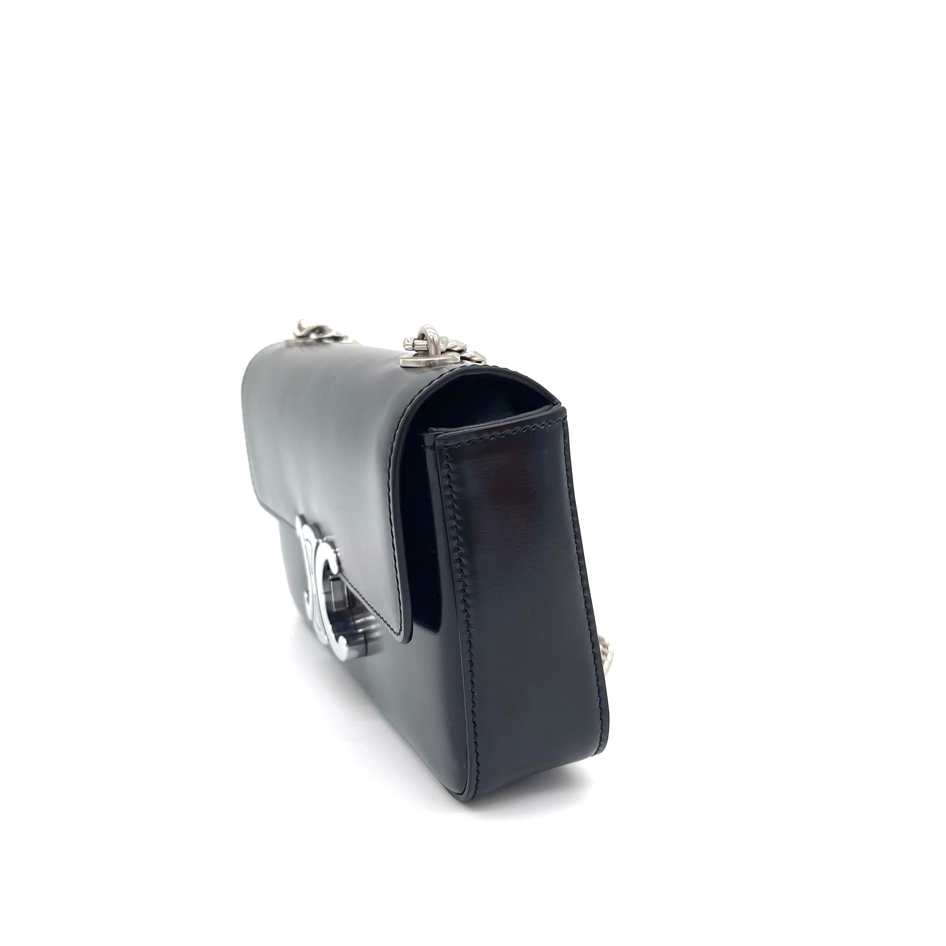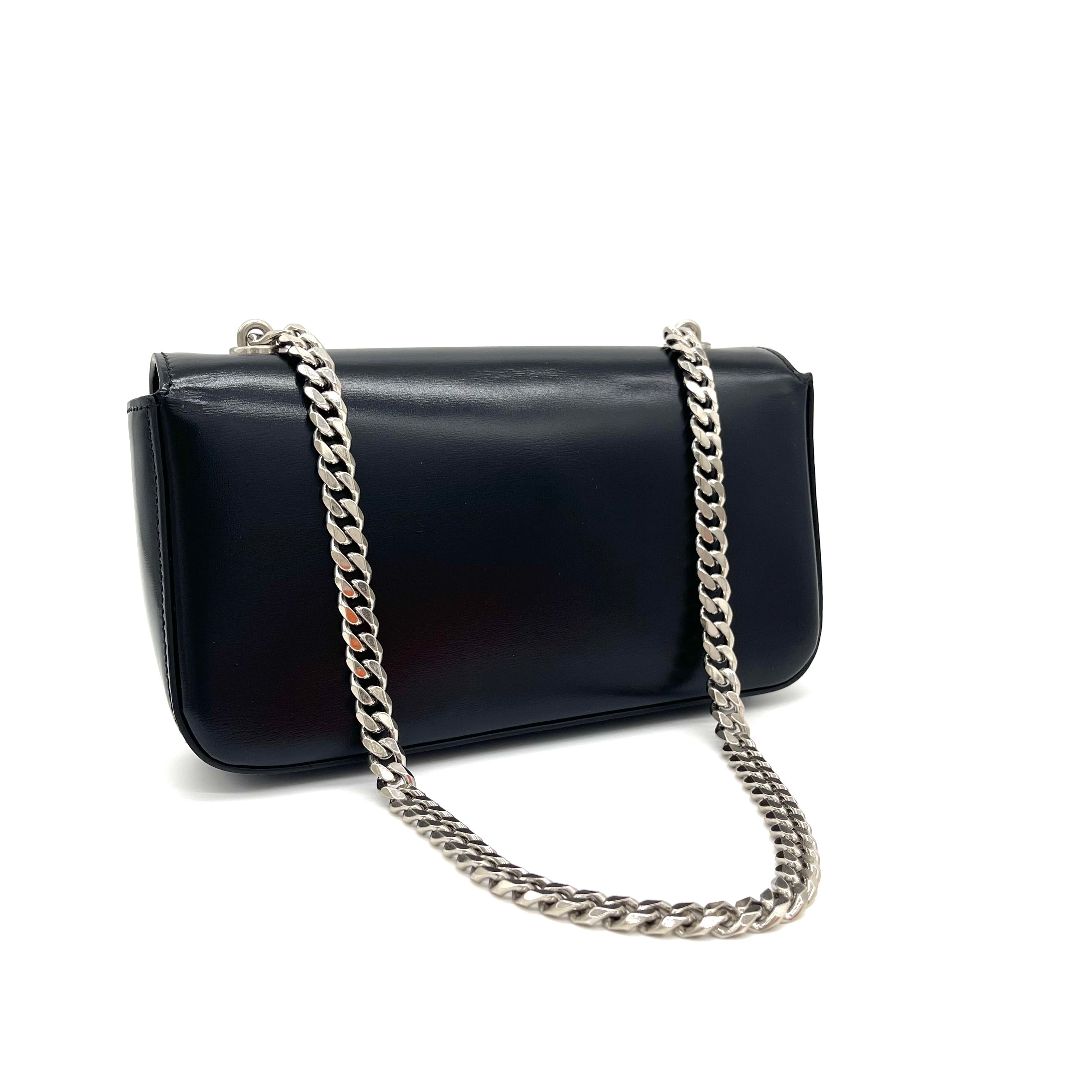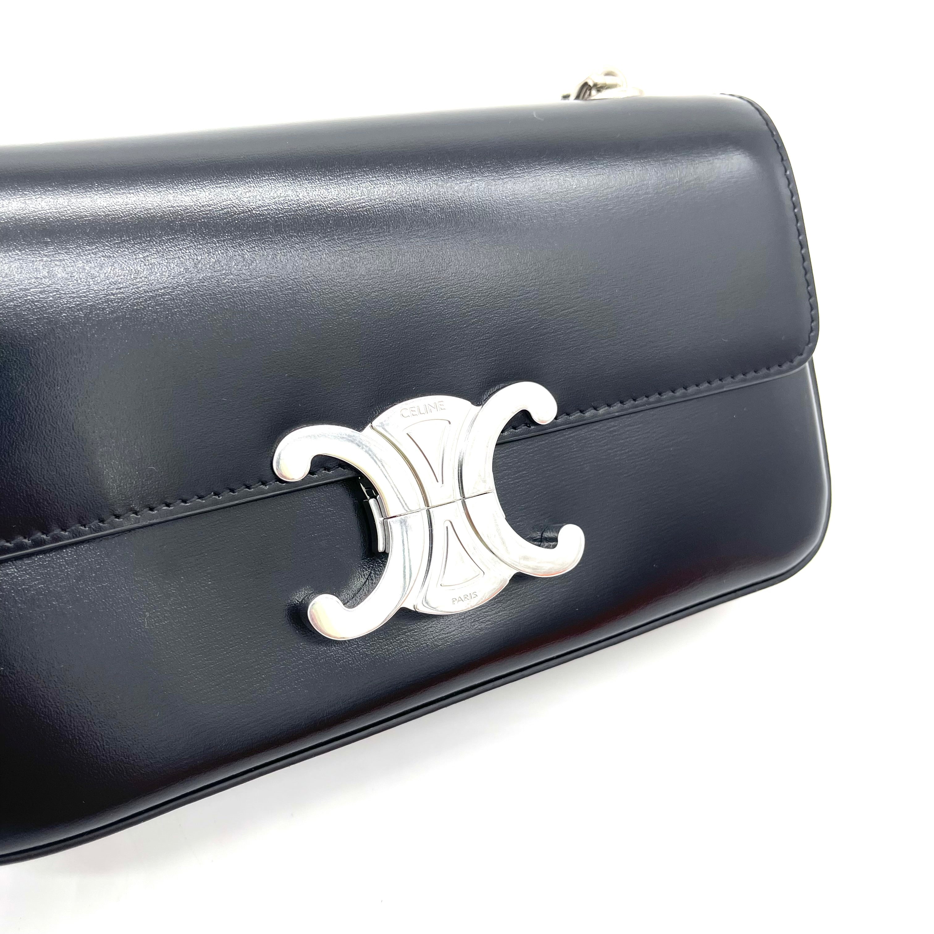 This is an authentic CELINE Shiny Calfskin Triomphe Chain Shoulder Bag in Black. This chic shoulder bag is crafted of smooth calfskin leather in black. The bag features a silver chain strap and a silver press lock on the crossover flap that opens to a black leather interior with a patch pocket.