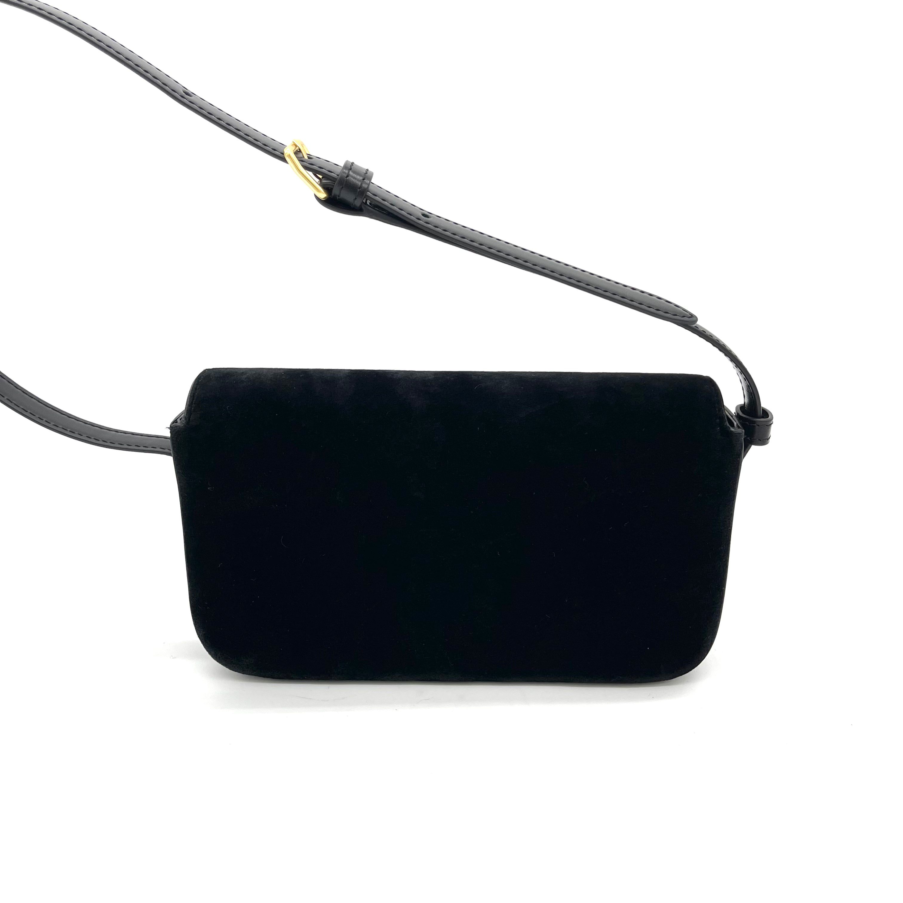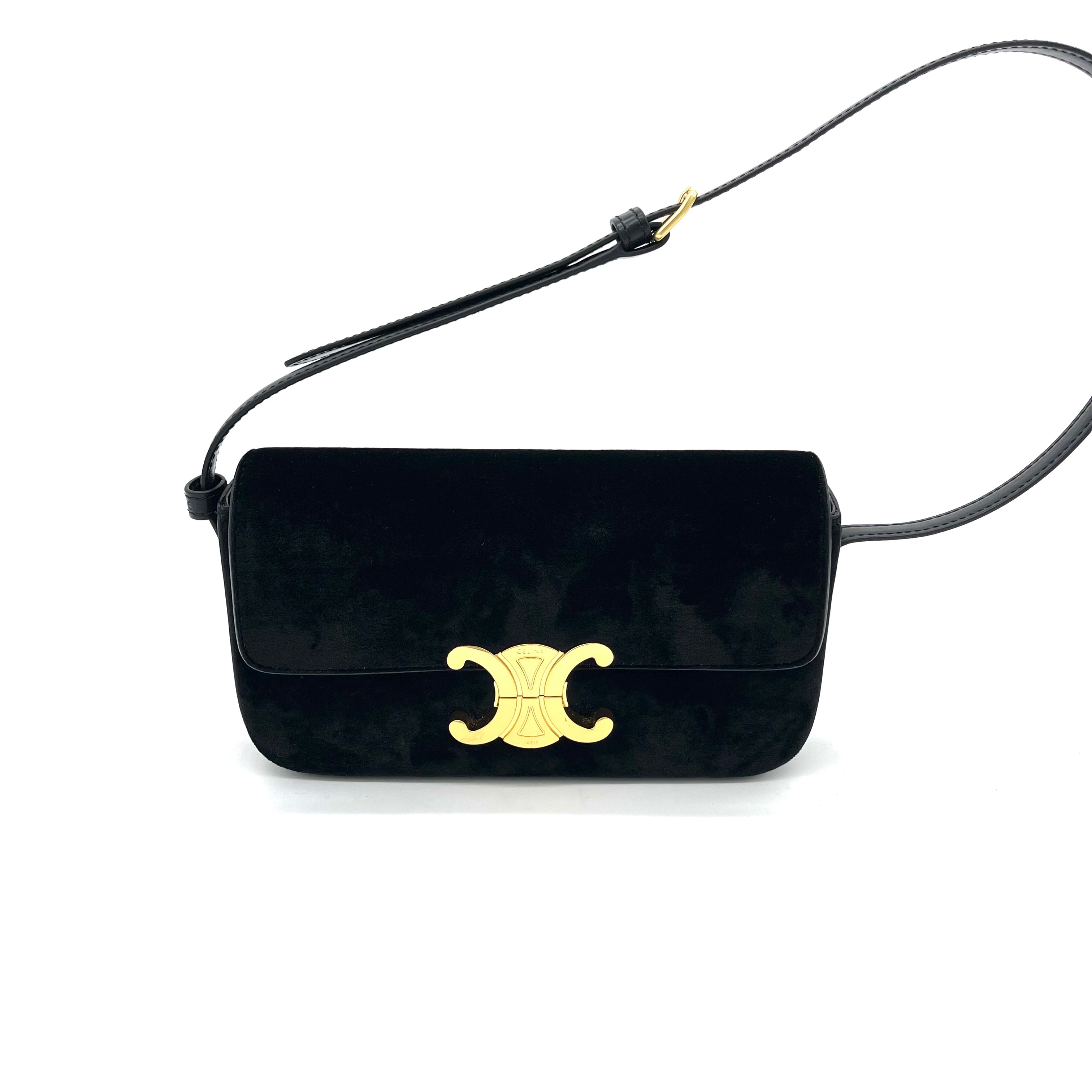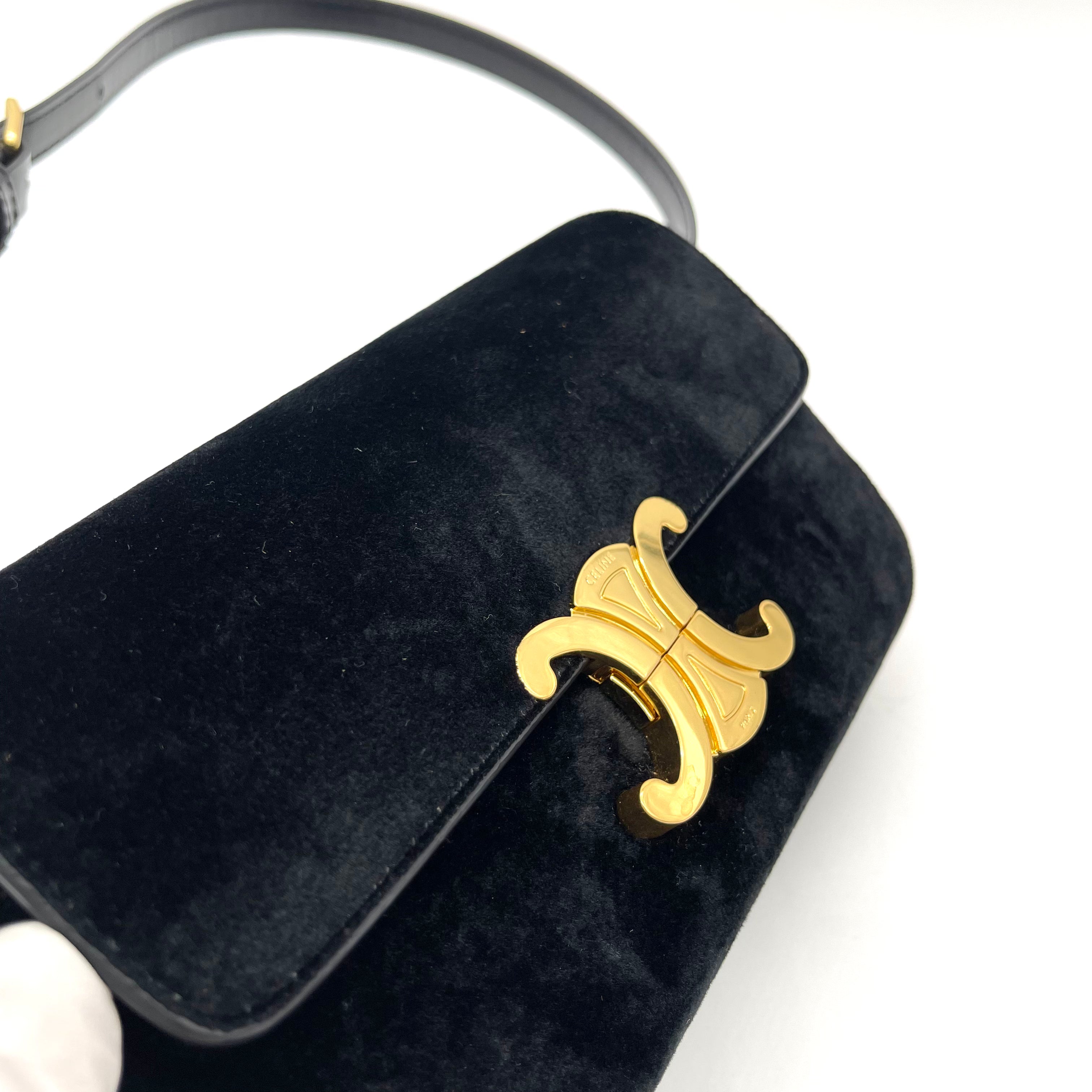 This is an authentic CELINE Triomphe Shoulder Bag In Velvet And Calfskin. This chic shoulder bag is crafted of smooth calfskin leather in black. The bag features an adjustable leather shoulder strap with gold hardware, and a matching gold press lock on the crossover flap that opens to a partitioned black leather interior with a zipper pocket.