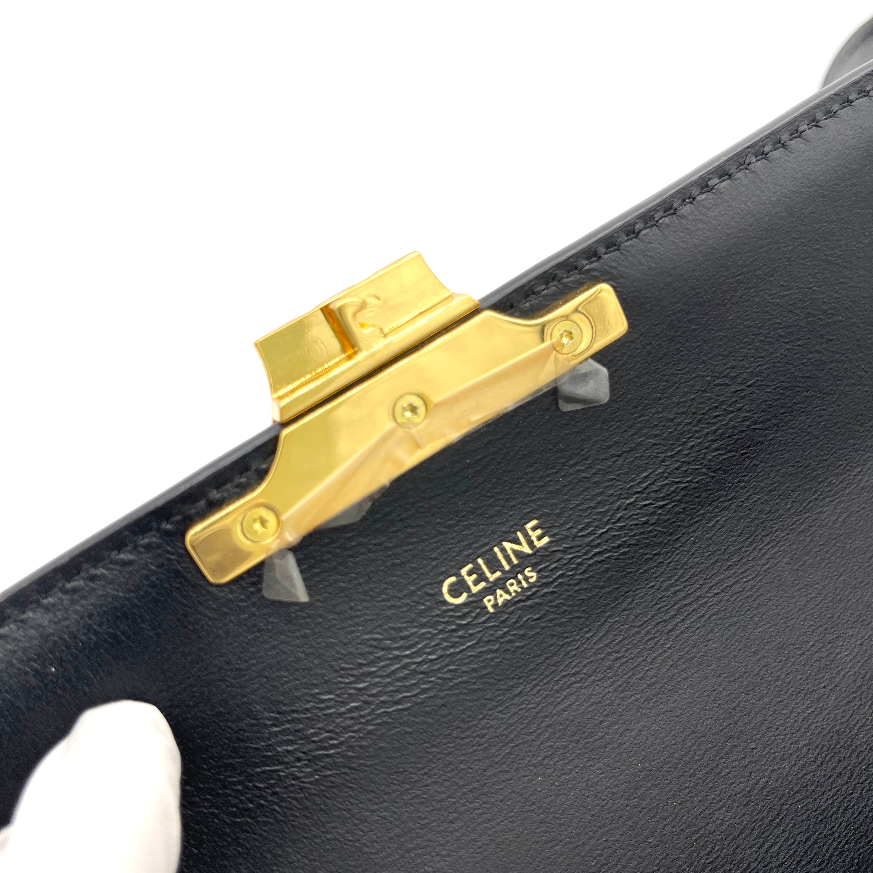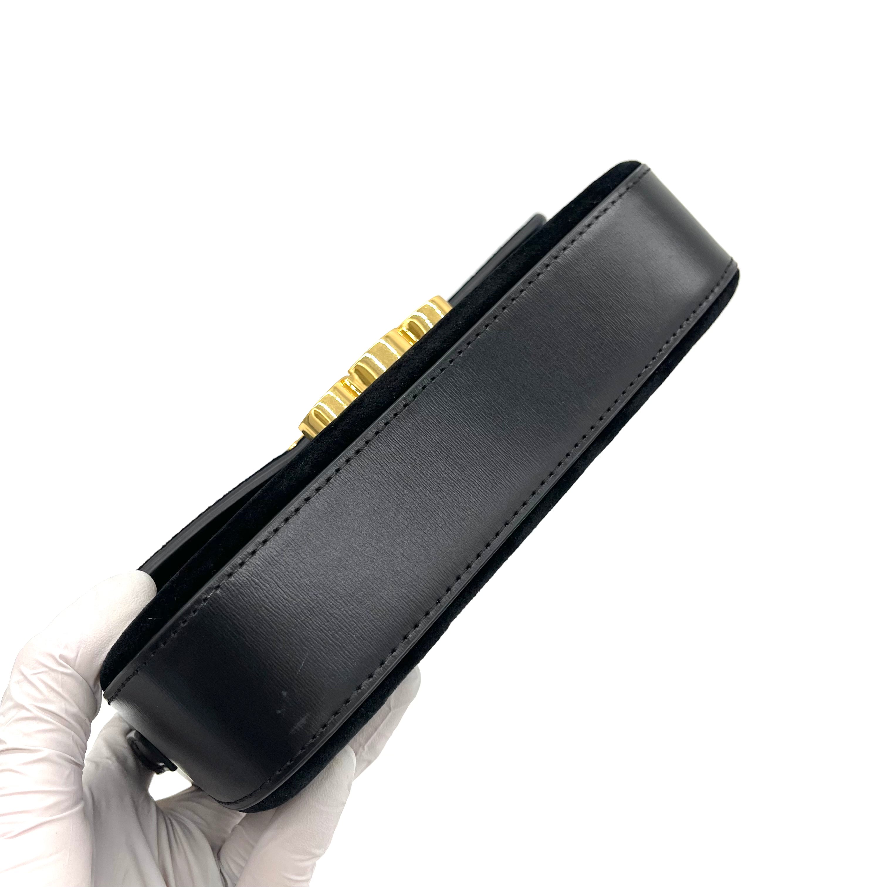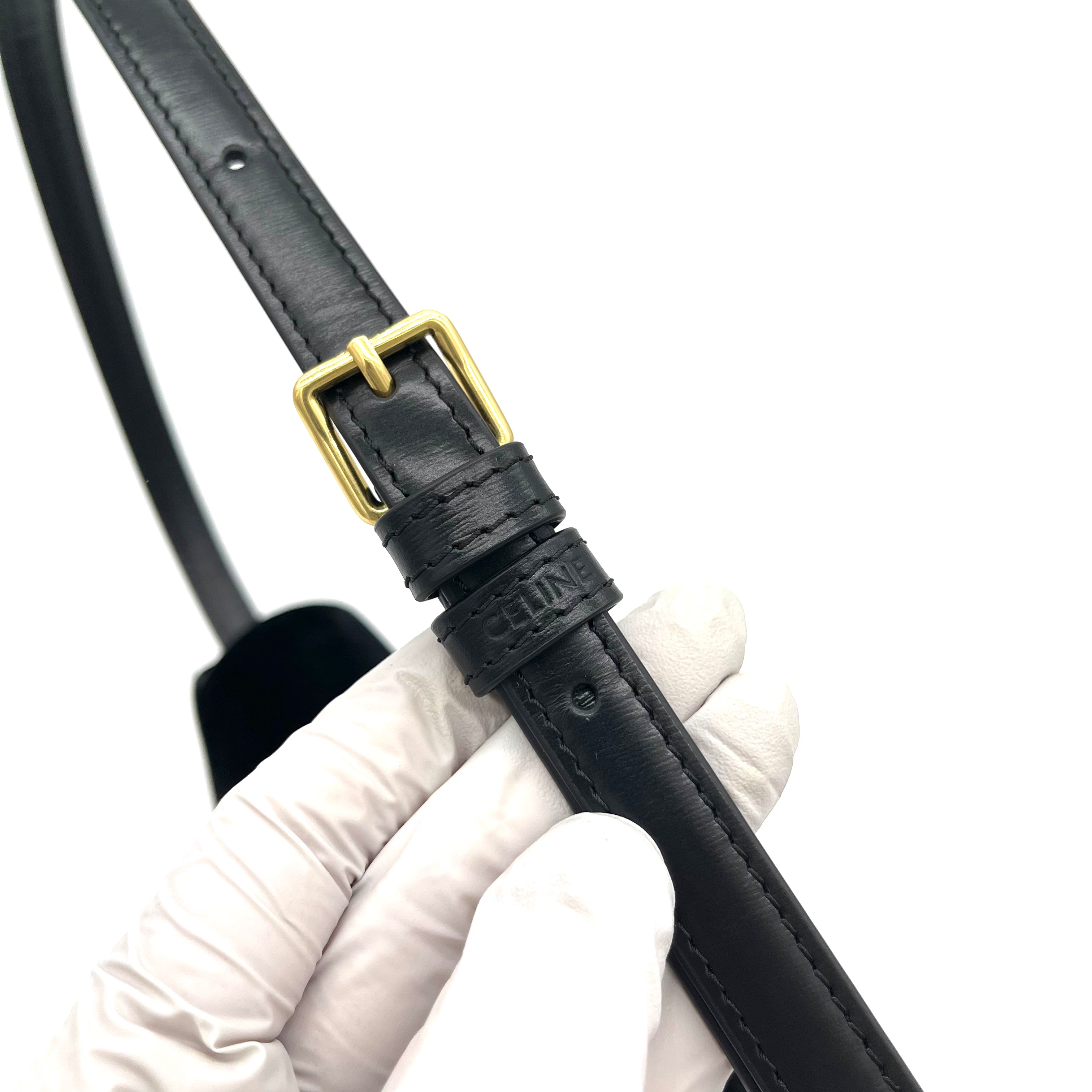 This is an authentic CELINE Triomphe Shoulder Bag In Velvet And Calfskin. This chic shoulder bag is crafted of smooth calfskin leather in black. The bag features an adjustable leather shoulder strap with gold hardware, and a matching gold press lock on the crossover flap that opens to a partitioned black leather interior with a zipper pocket.