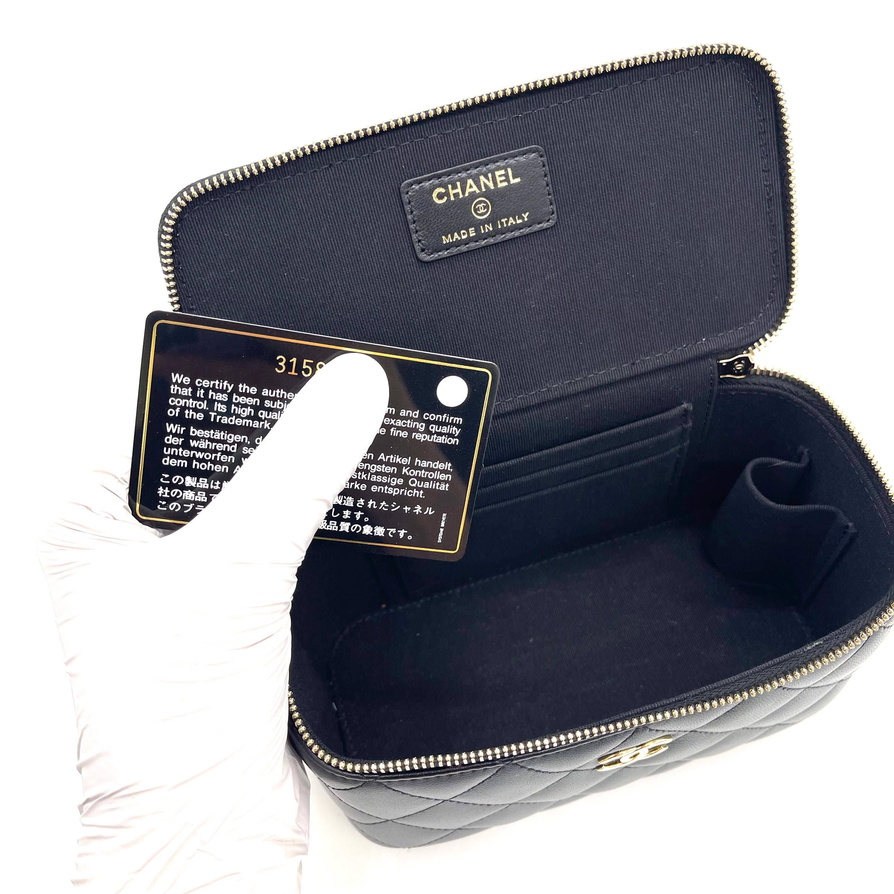 A chic and versatile Chanel piece crafted from soft black lambskin with the brand’s signature diamond quilting. This elegant vanity case features a structured silhouette, a leather top handle, and a long leather-interwoven chain strap for shoulder or crossbody wear.