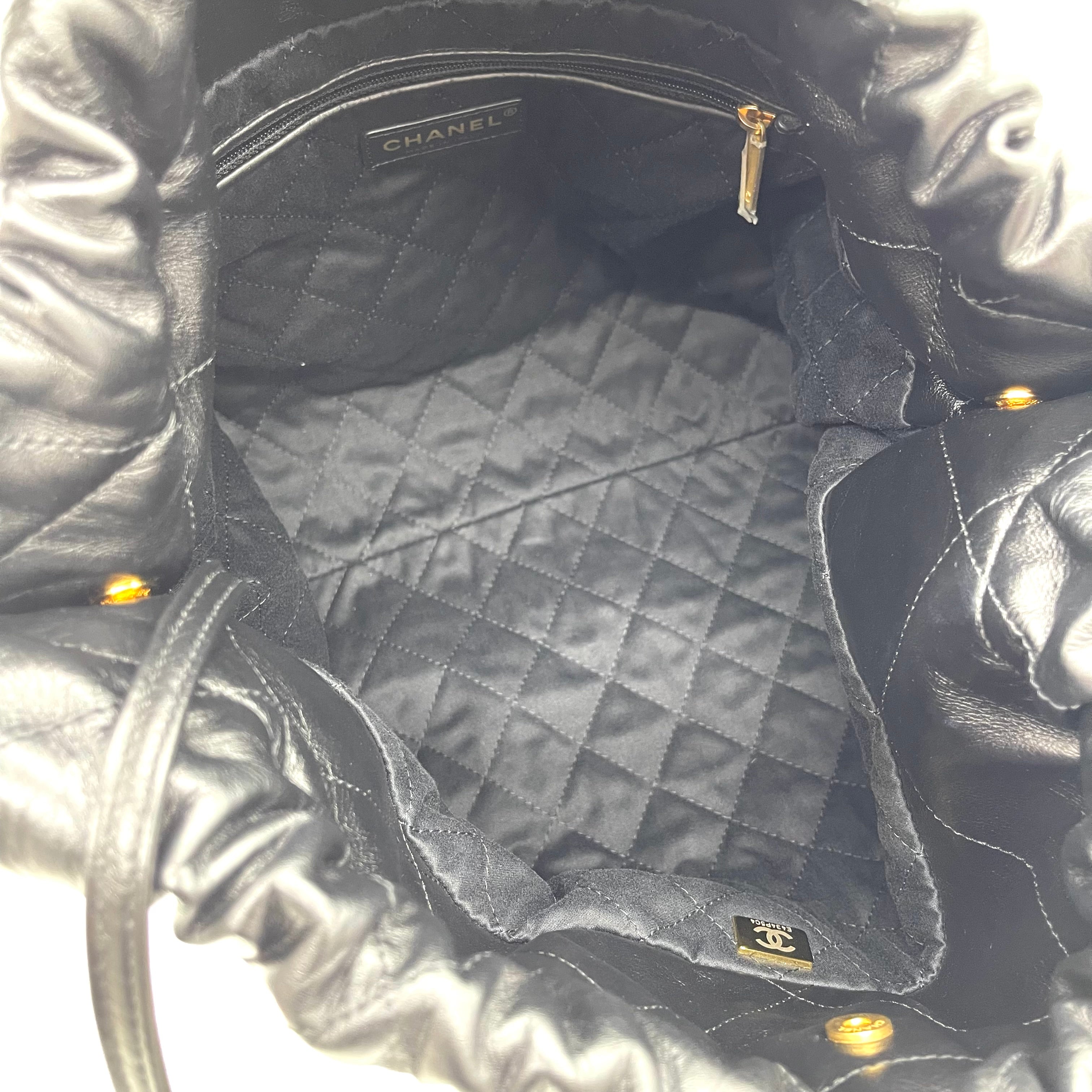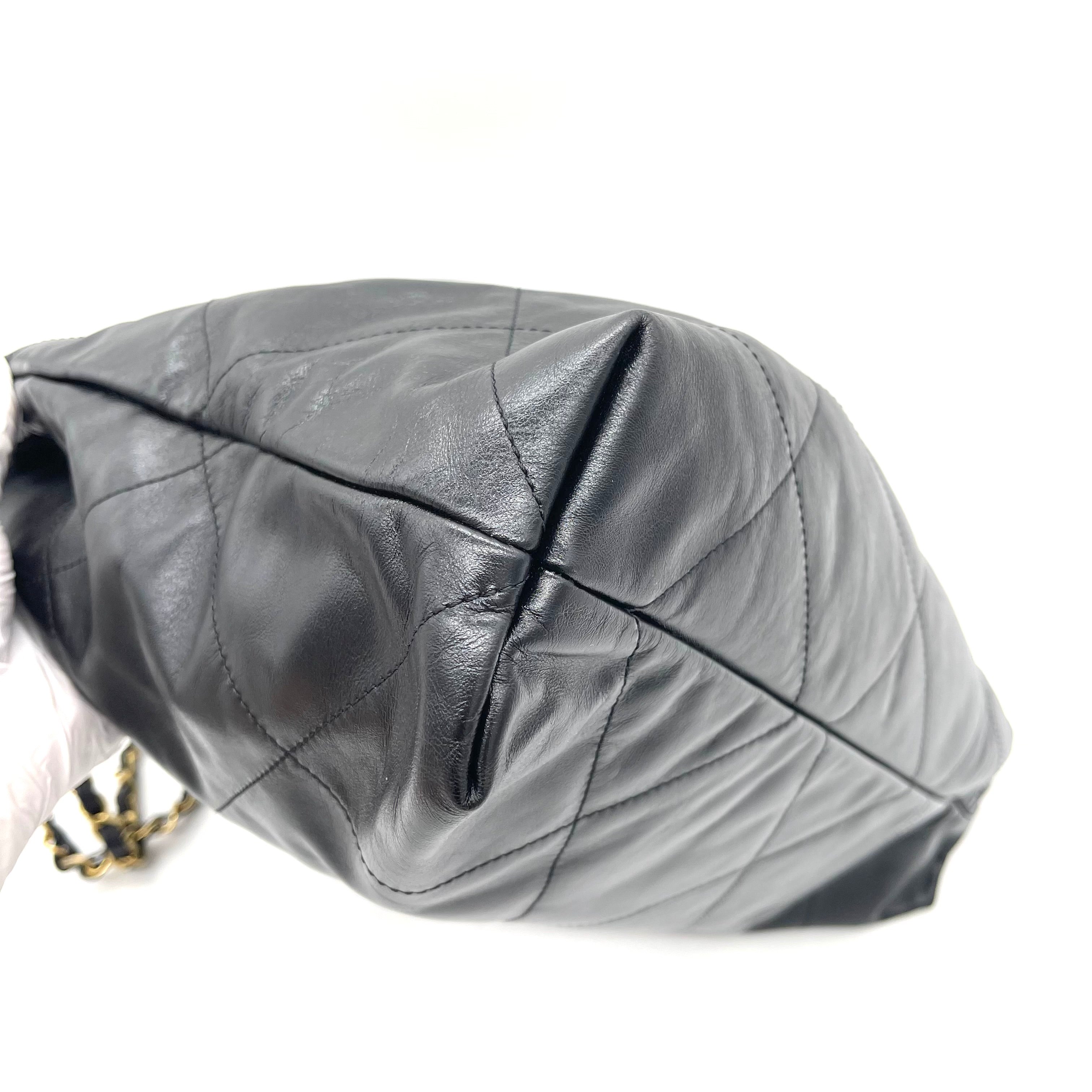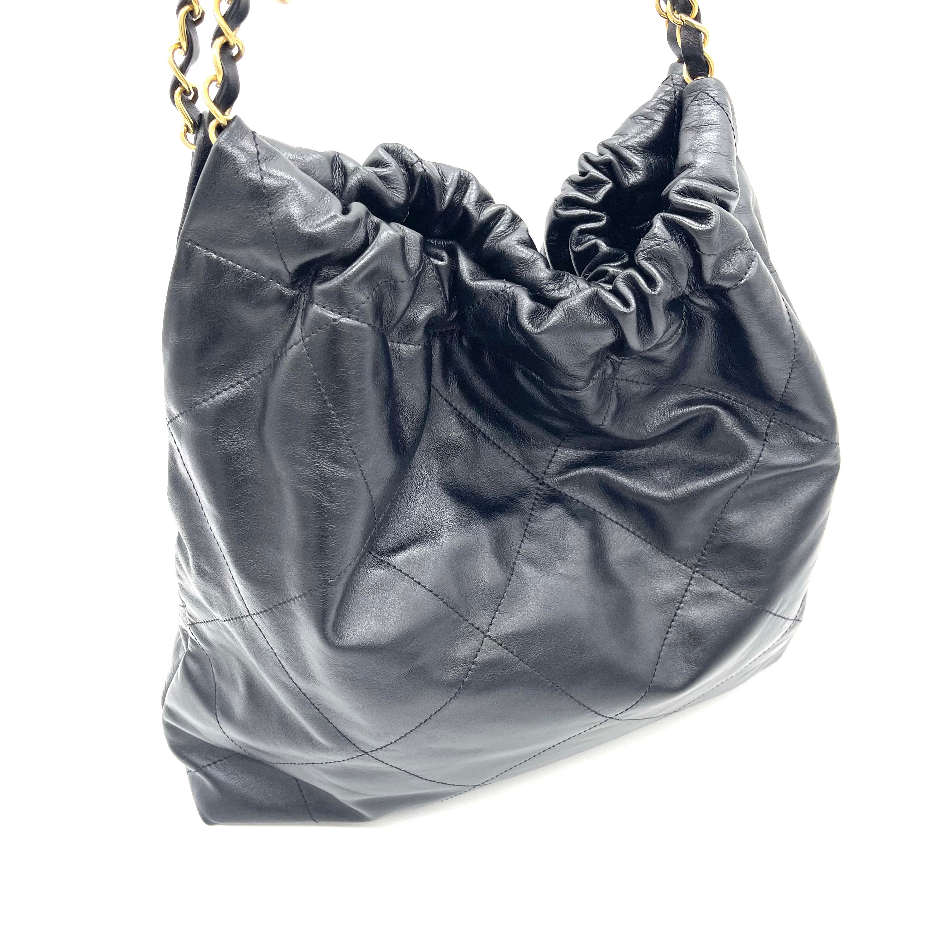 A modern classic from Chanel, the Chanel 22 Bag is crafted in luxurious shiny black quilted calfskin with elegant gold-tone CHANEL lettering.